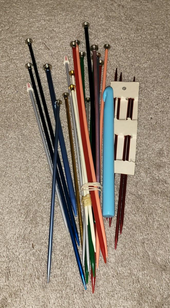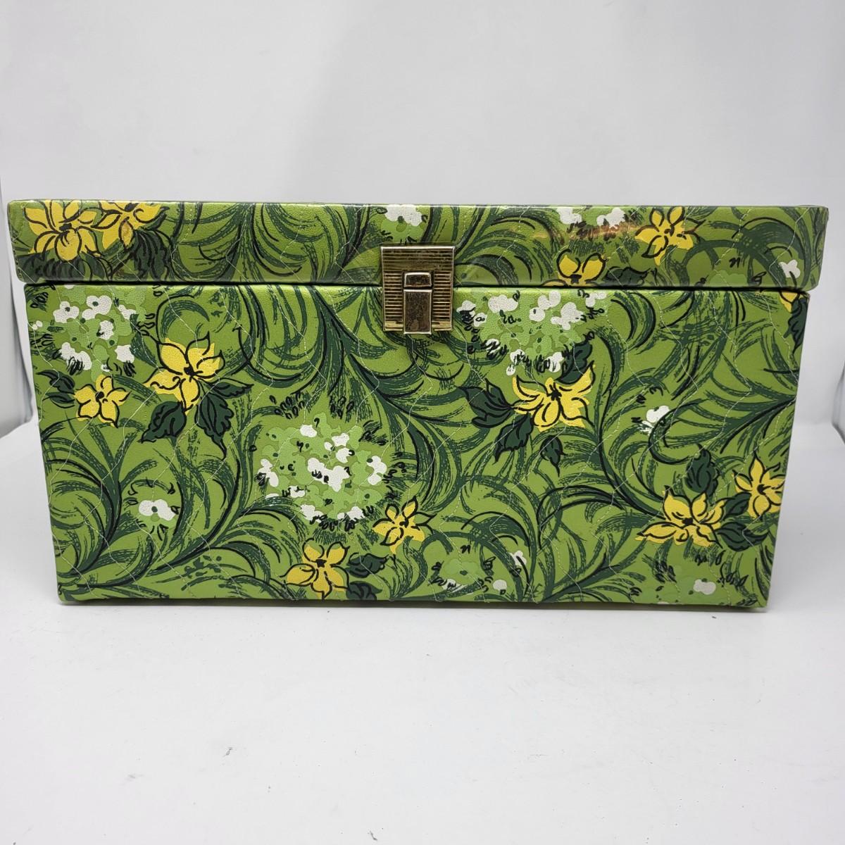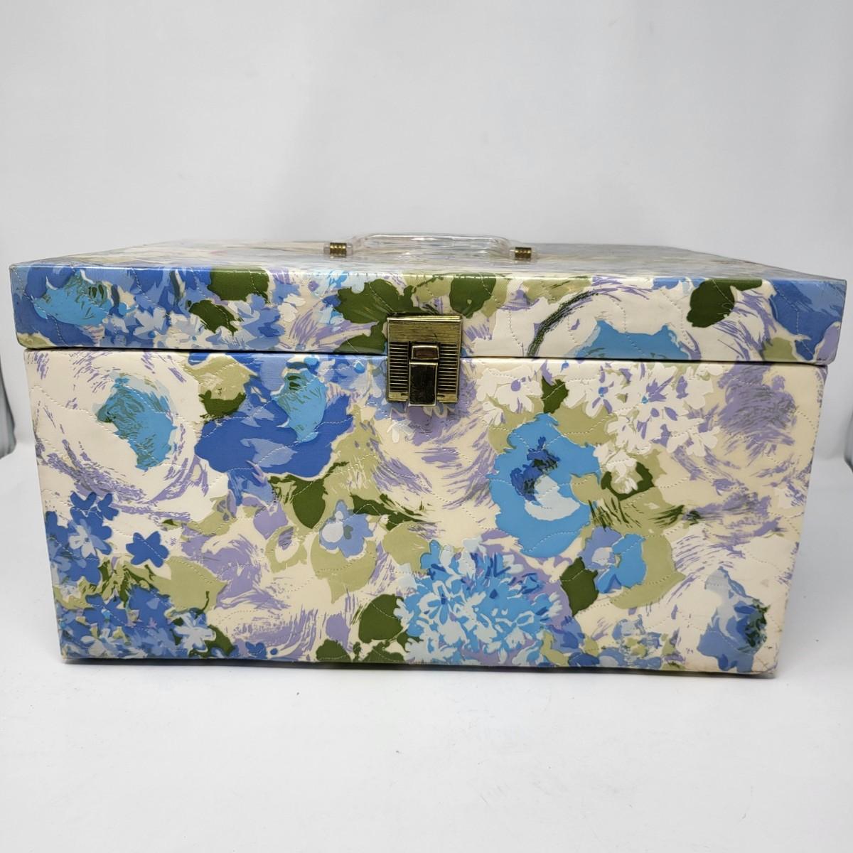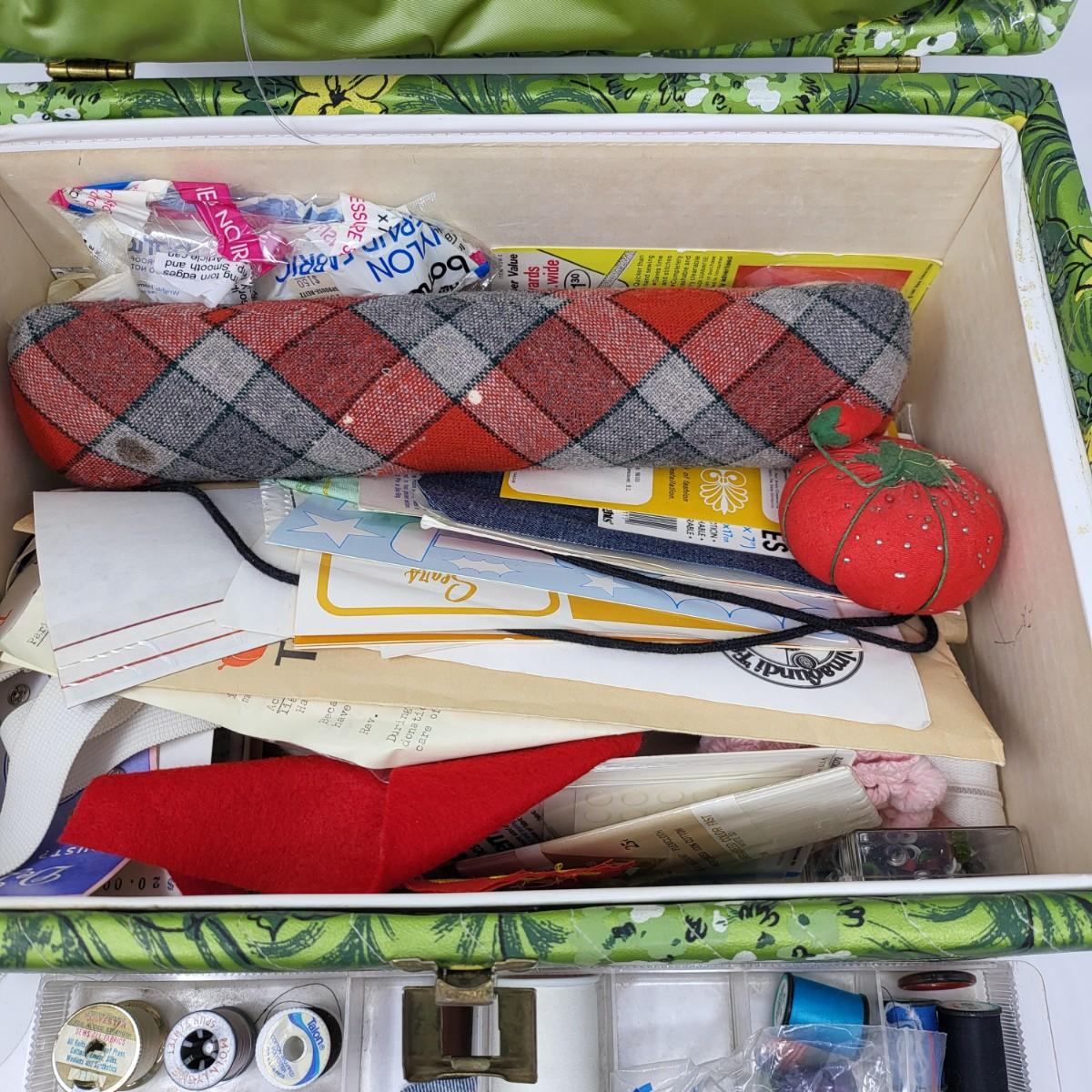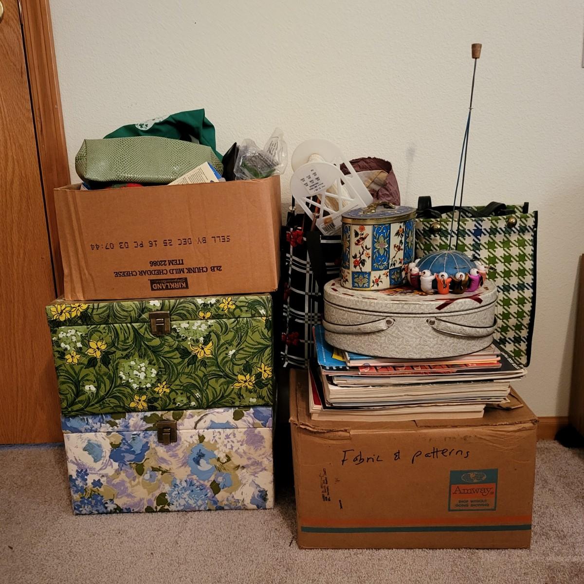 Two vintage vinyl coated sewing boxes, filled! They measure 15" long x 10.5" deep x 8" tall. Box of patterns, fabrics, pin cushions, knitti g needles, books for sewing, knitting, crochet and more!