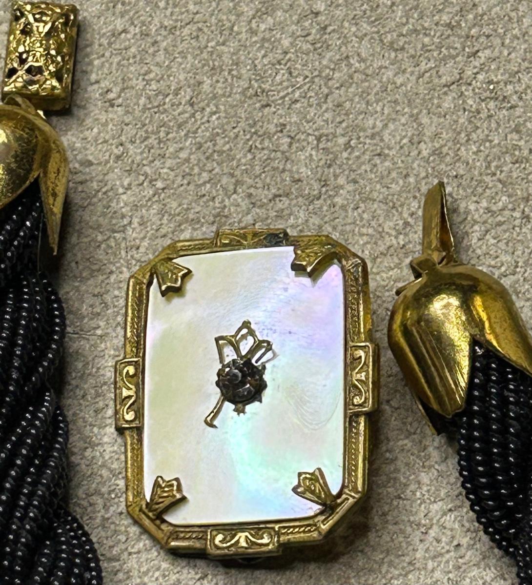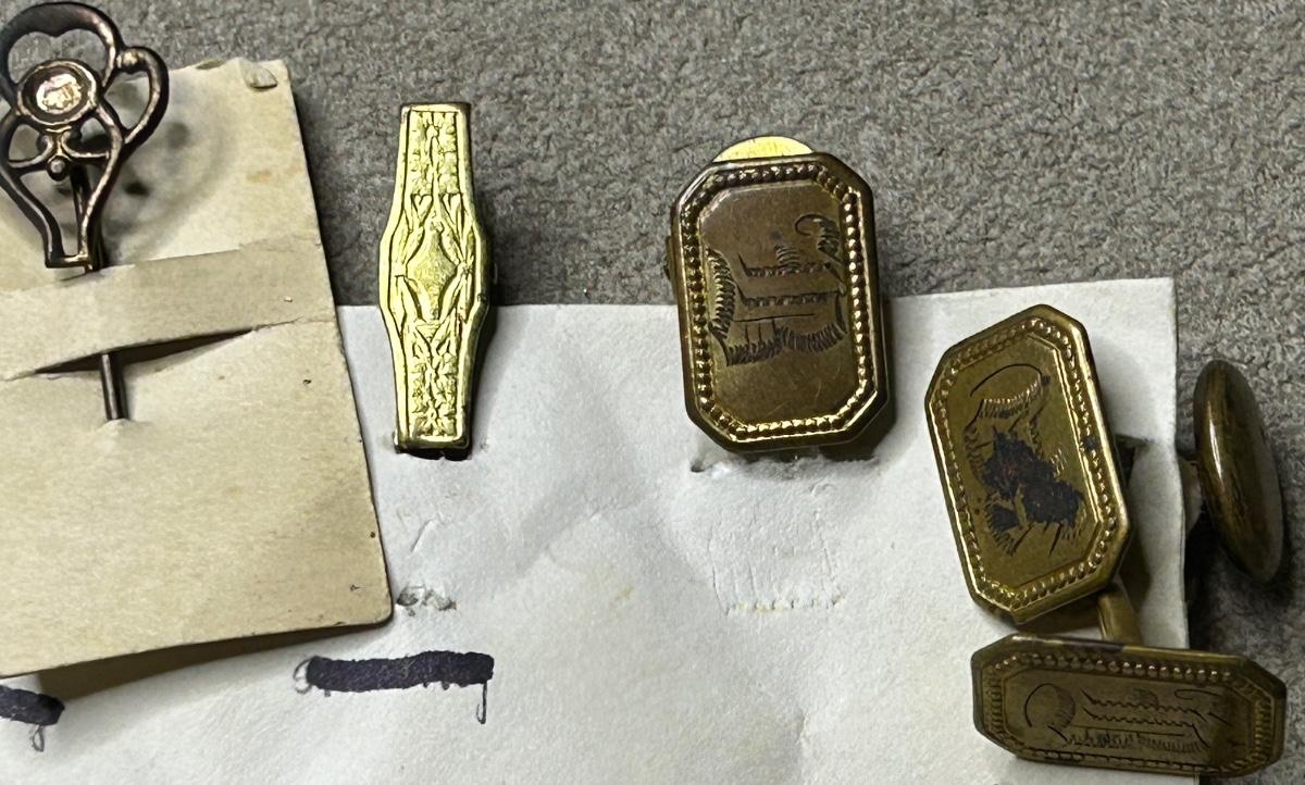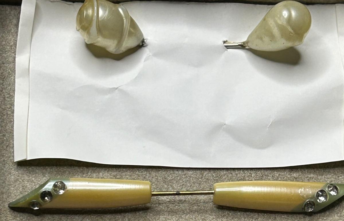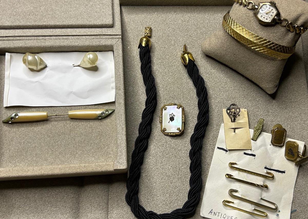 The gold tone bangle is Monet. The 2 on the left are antique hair pins from the 20’s.