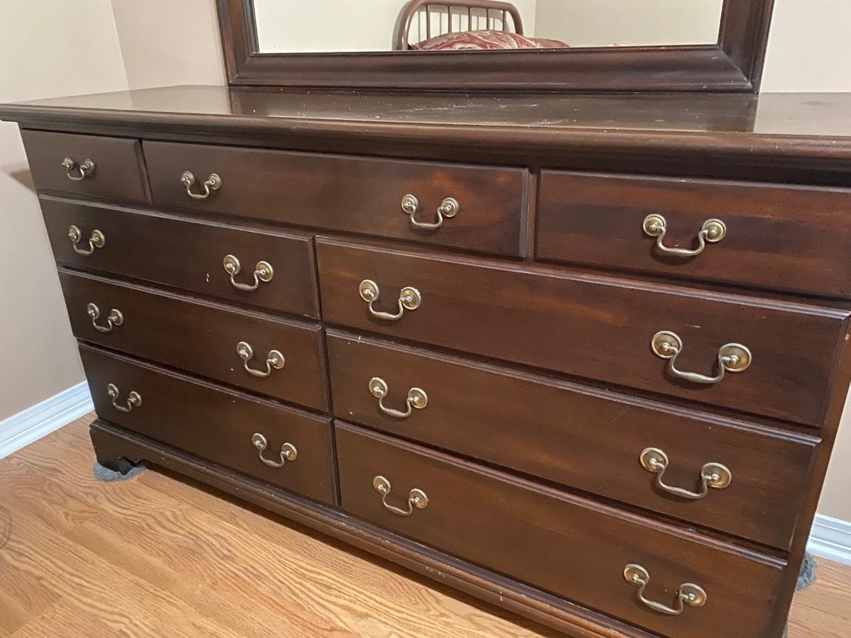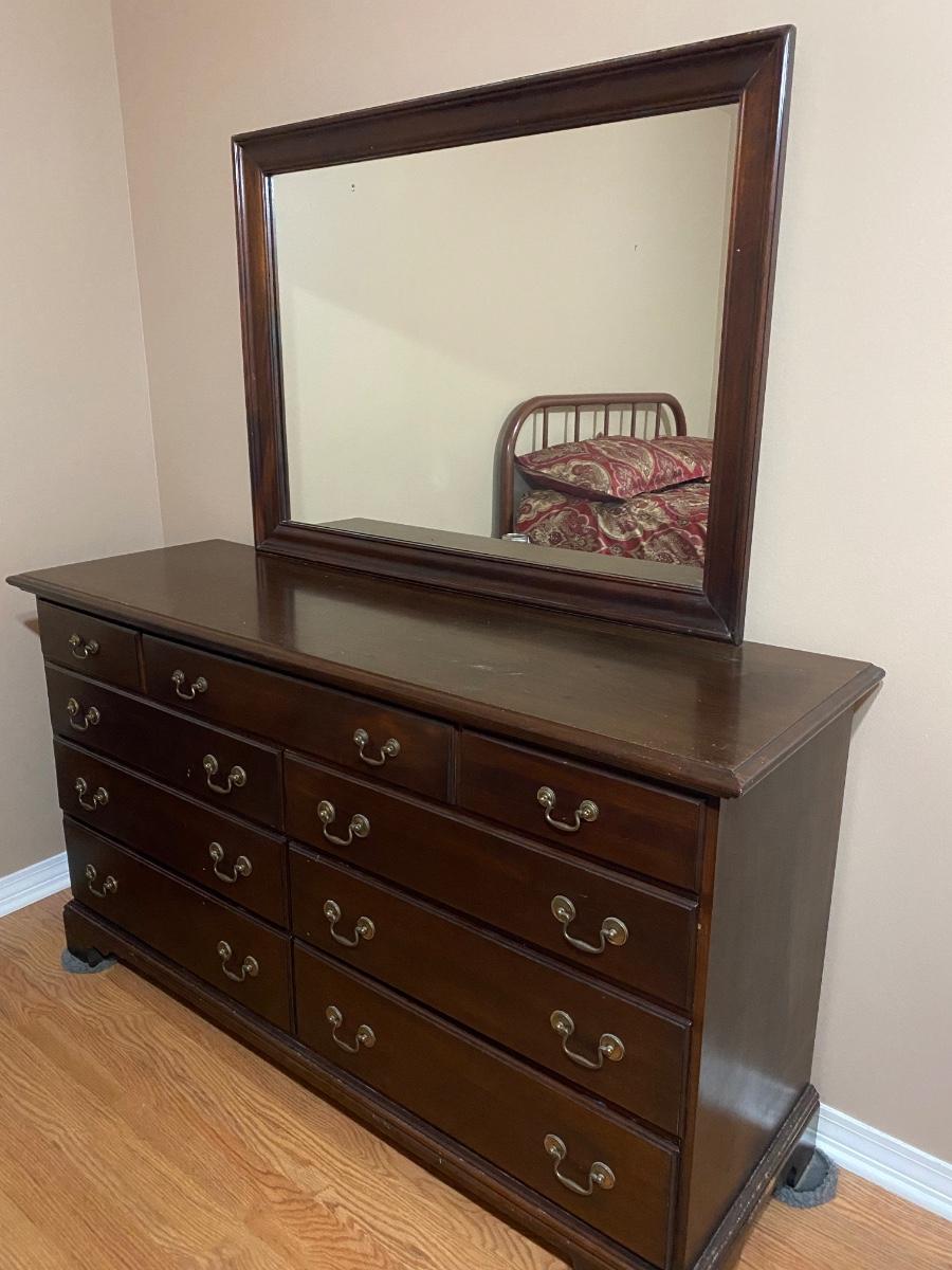 All Wood Dresser with mirror. Dovetail drawers. Approx 61-1/4w x 34-1/2h x 19-1/2d.