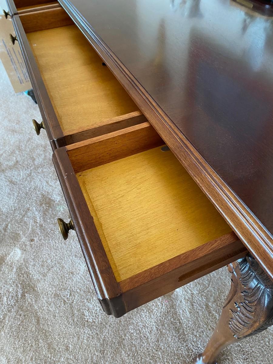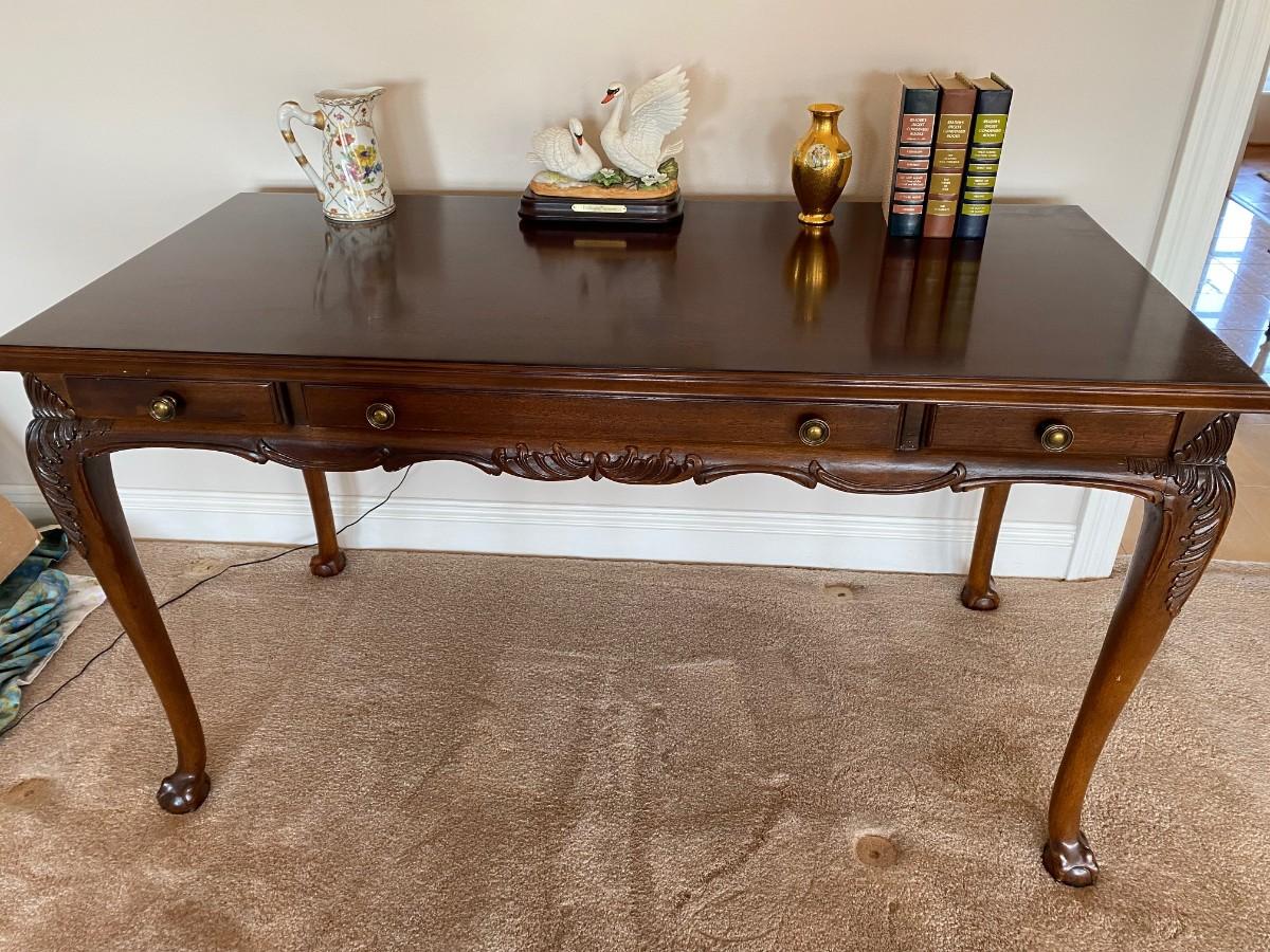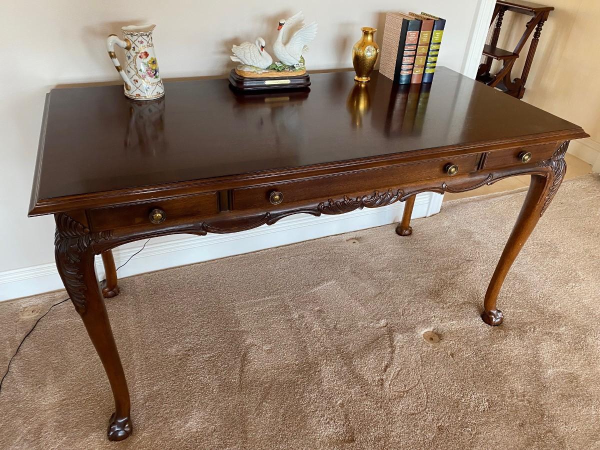 All wood vintage Queen Anne style desk with three drawers. Excellent condition. Approx. 54" W x 26" D x 30" H