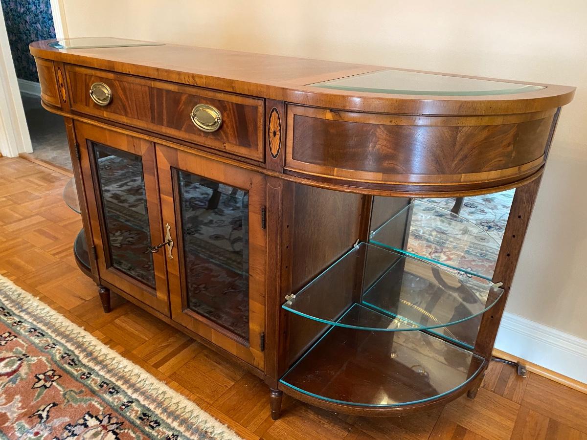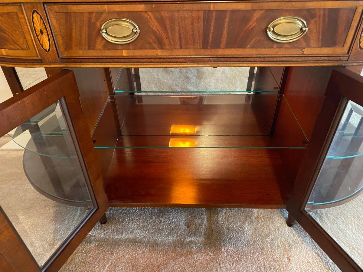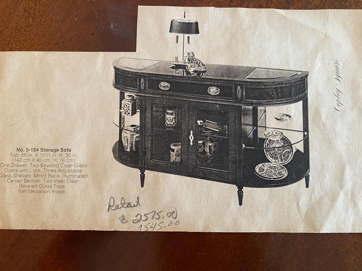 Beautiful all wood vintage Heckman lighted storage sofa cabinet. One drawer, 2 beveled clear glass doors with lock, 3 adjustable glass shelves, illuminated center section, 2 inset beveled glass tops, fan medallion inlays. Original price $2,575. 56”W x 15.75”D x 30”H. Excellent condition