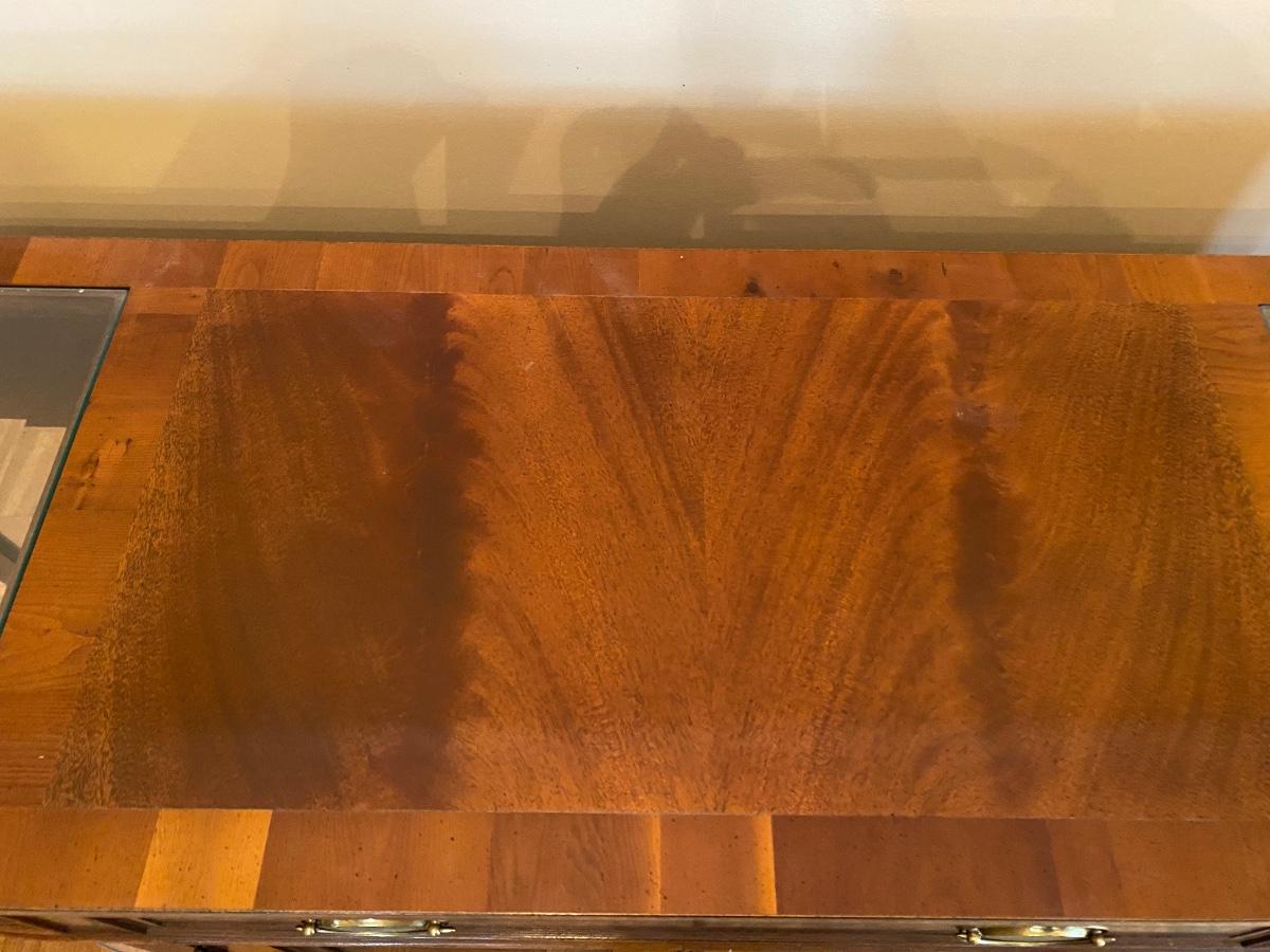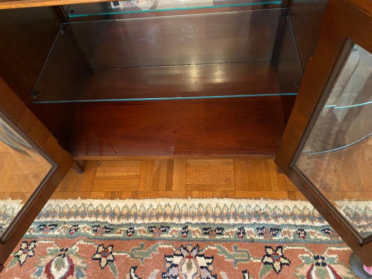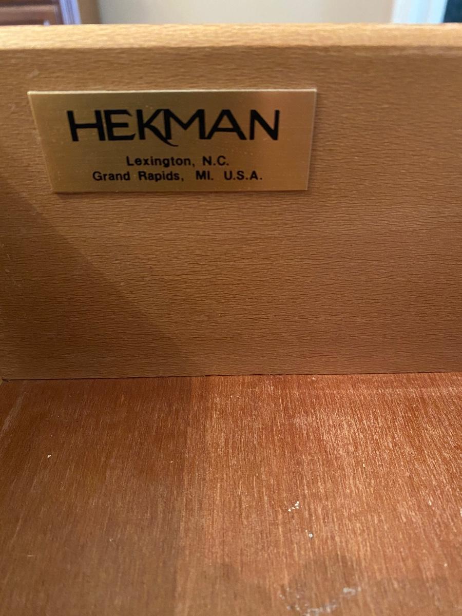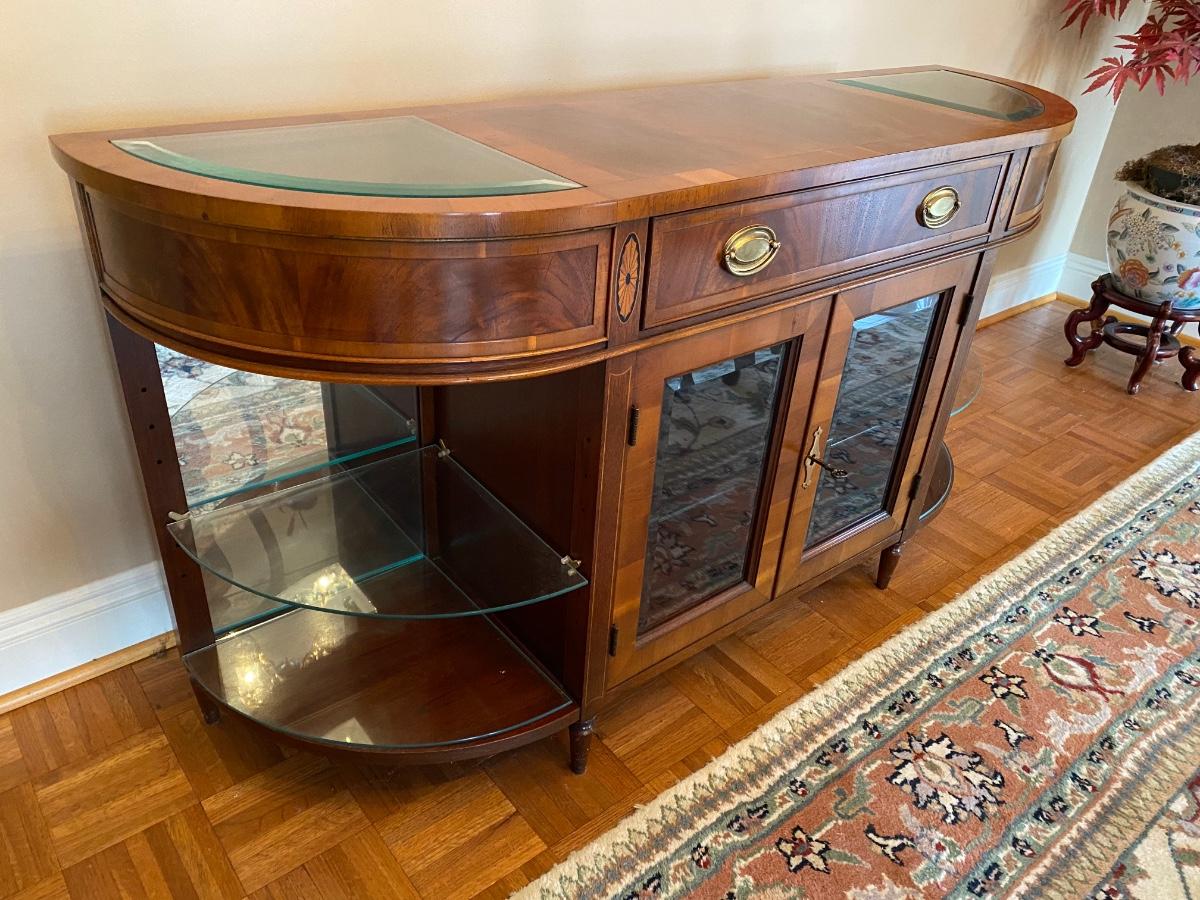 Beautiful all wood vintage Heckman lighted storage sofa cabinet. One drawer, 2 beveled clear glass doors with lock, 3 adjustable glass shelves, illuminated center section, 2 inset beveled glass tops, fan medallion inlays. Original price $2,575. 56”W x 15.75”D x 30”H. Excellent condition