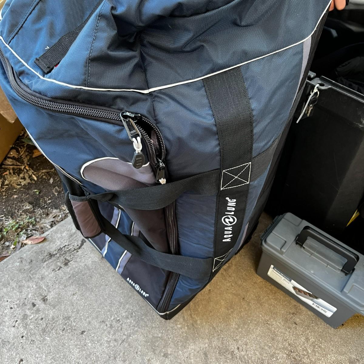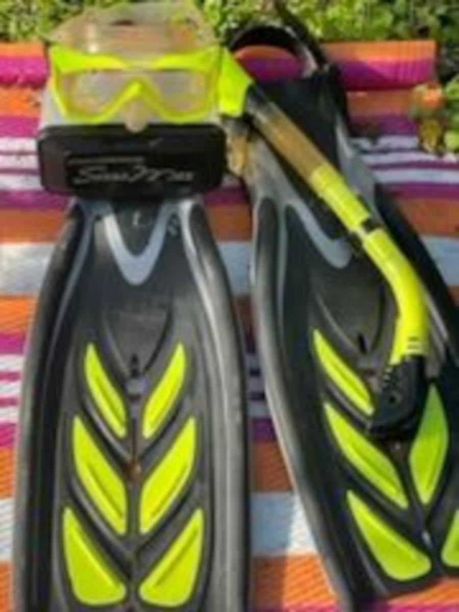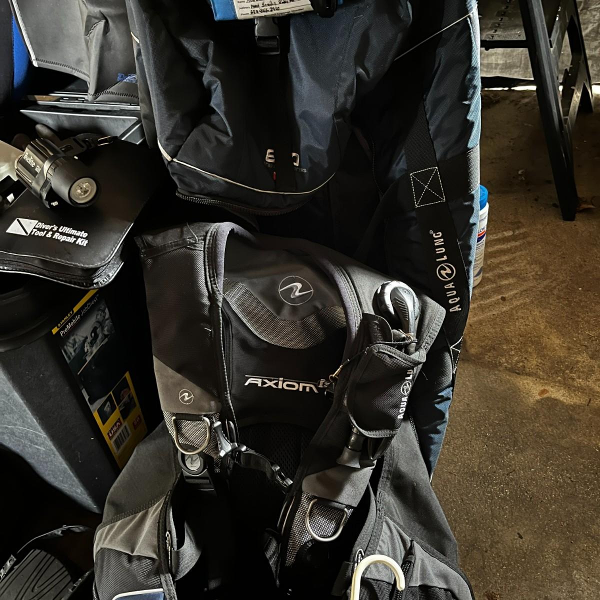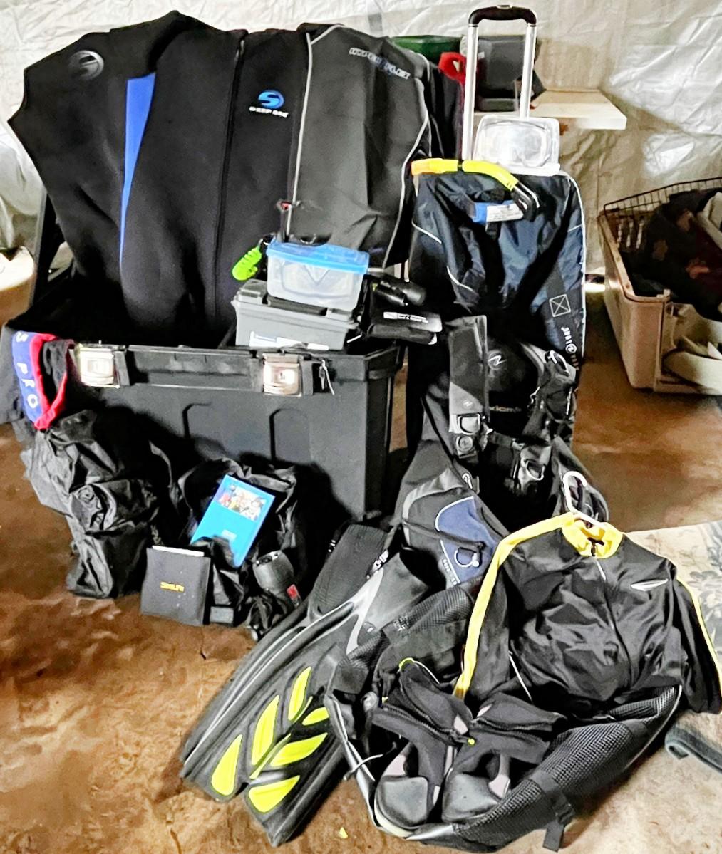 4 wet suits, 3 masks, aqua lung, carrying cases, fins, weights, snorkel, wet shoes (sz 11) instructions and more.