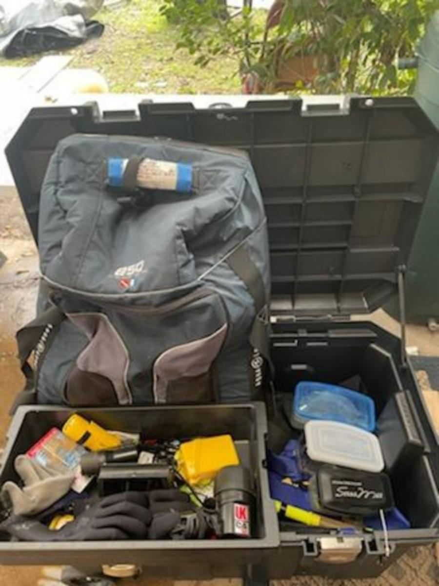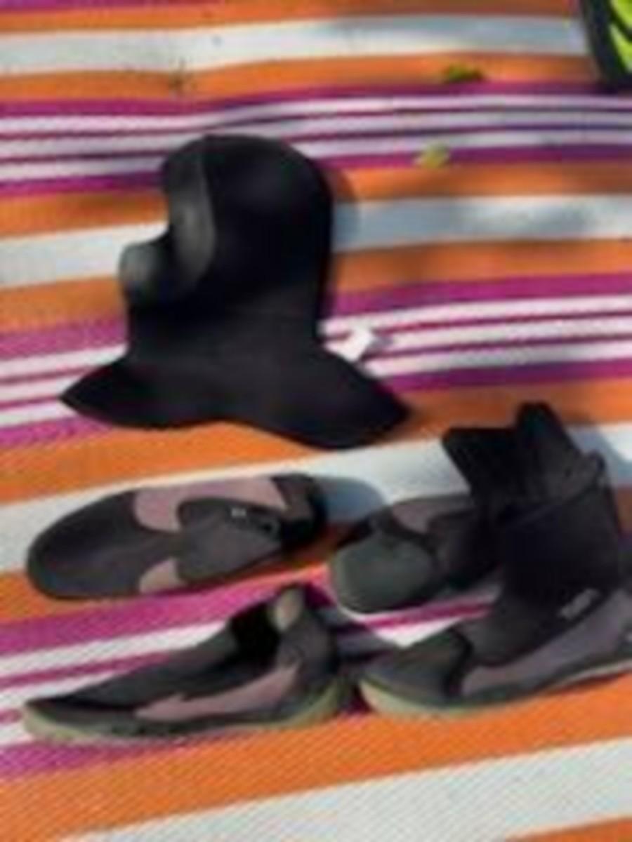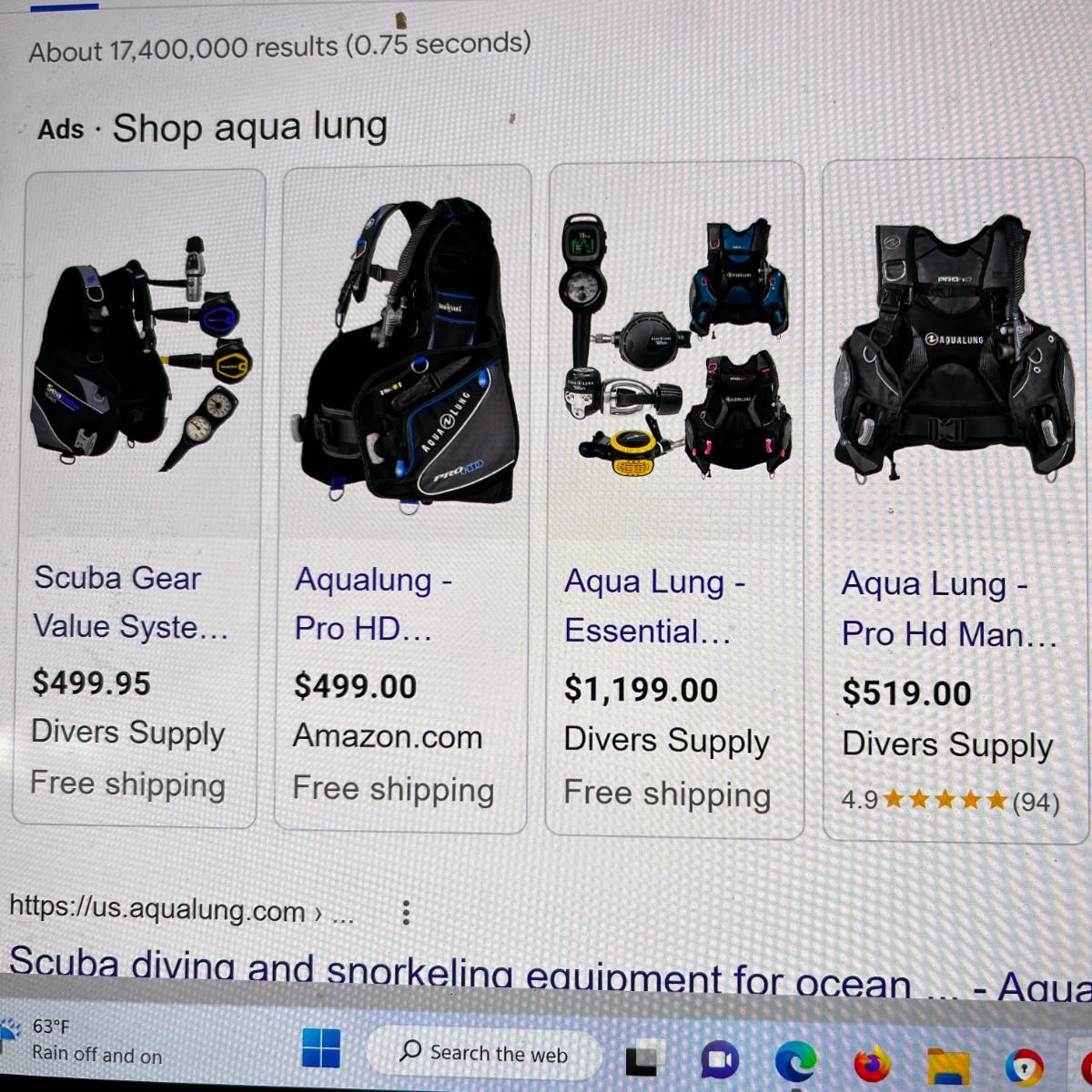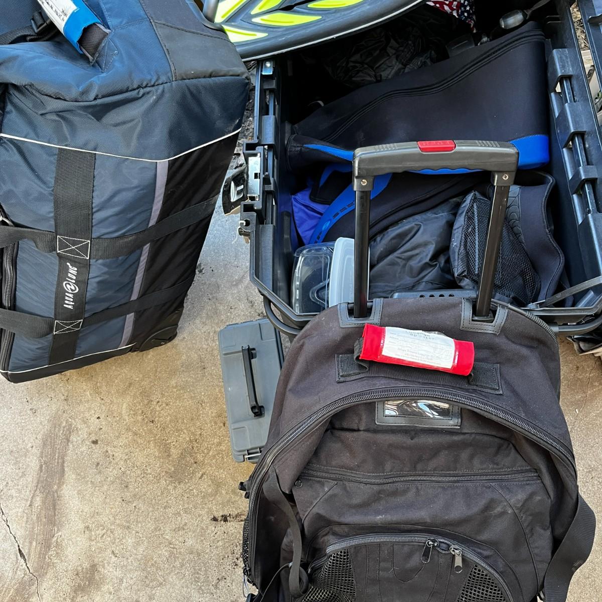4 wet suits, 3 masks, aqua lung, carrying cases, fins, weights, snorkel, wet shoes (sz 11) instructions and more.