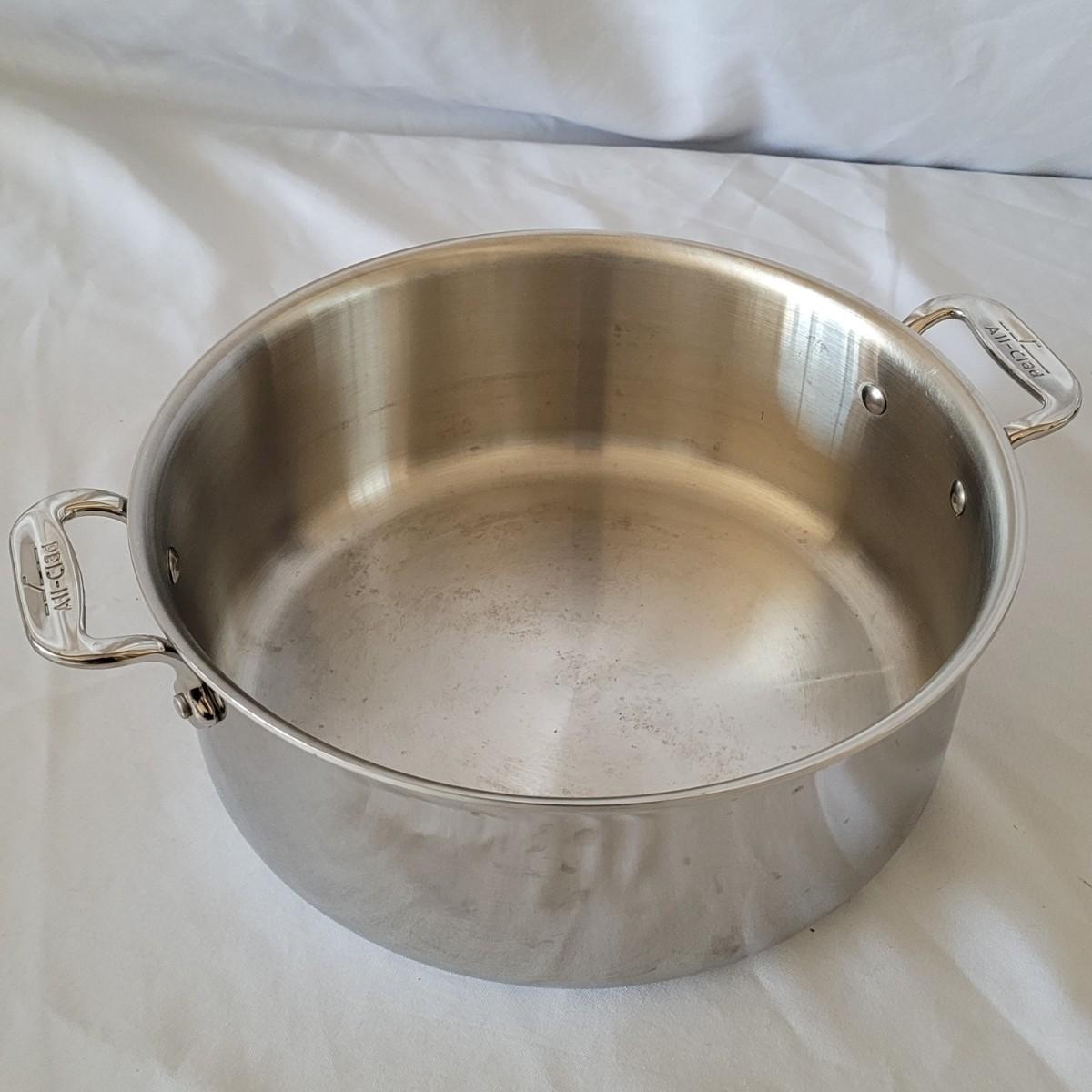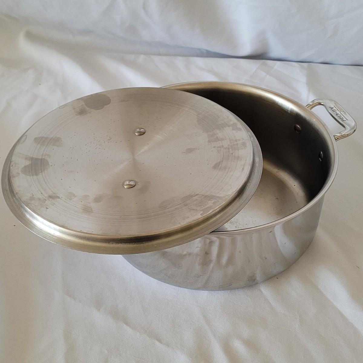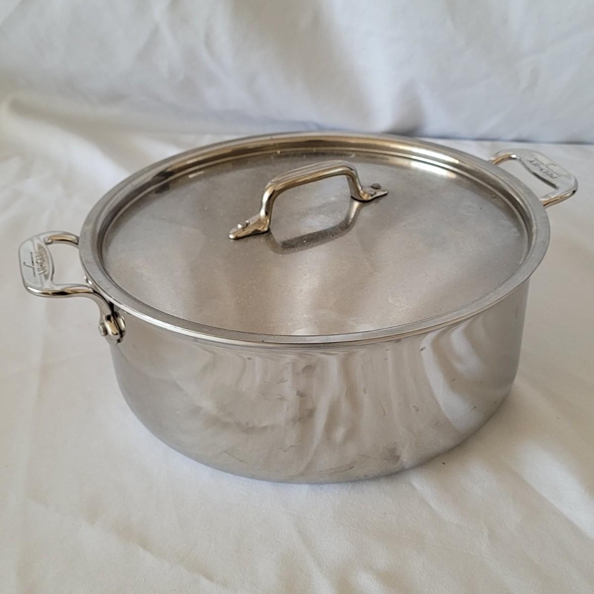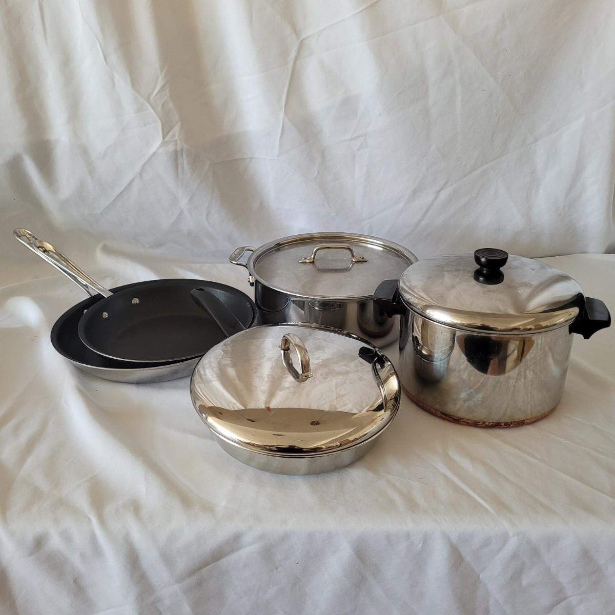 This lot includes five pieces of cookware. The two nonstick pans (10" and 12") and the short braising pot (11.5") are All-Clad brand. The braising pot includes matching lid. The other two items are Revere Ware brand and include a 10" saute pot with lid and a 9.5" stockpot with lid.