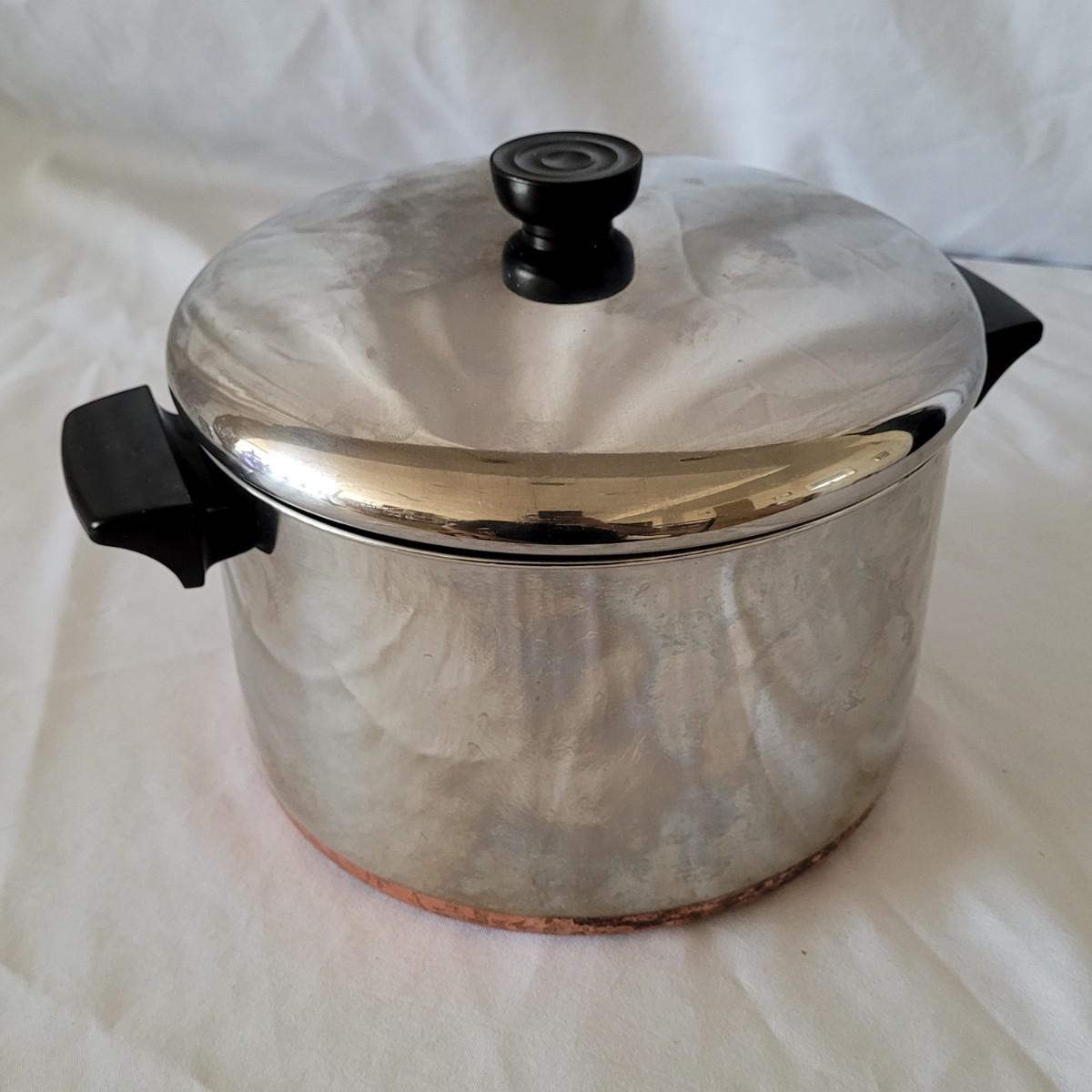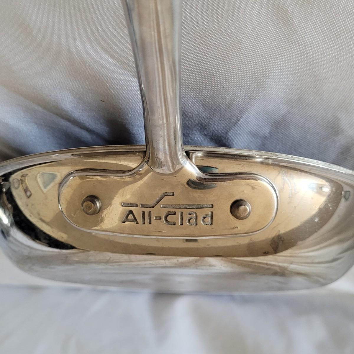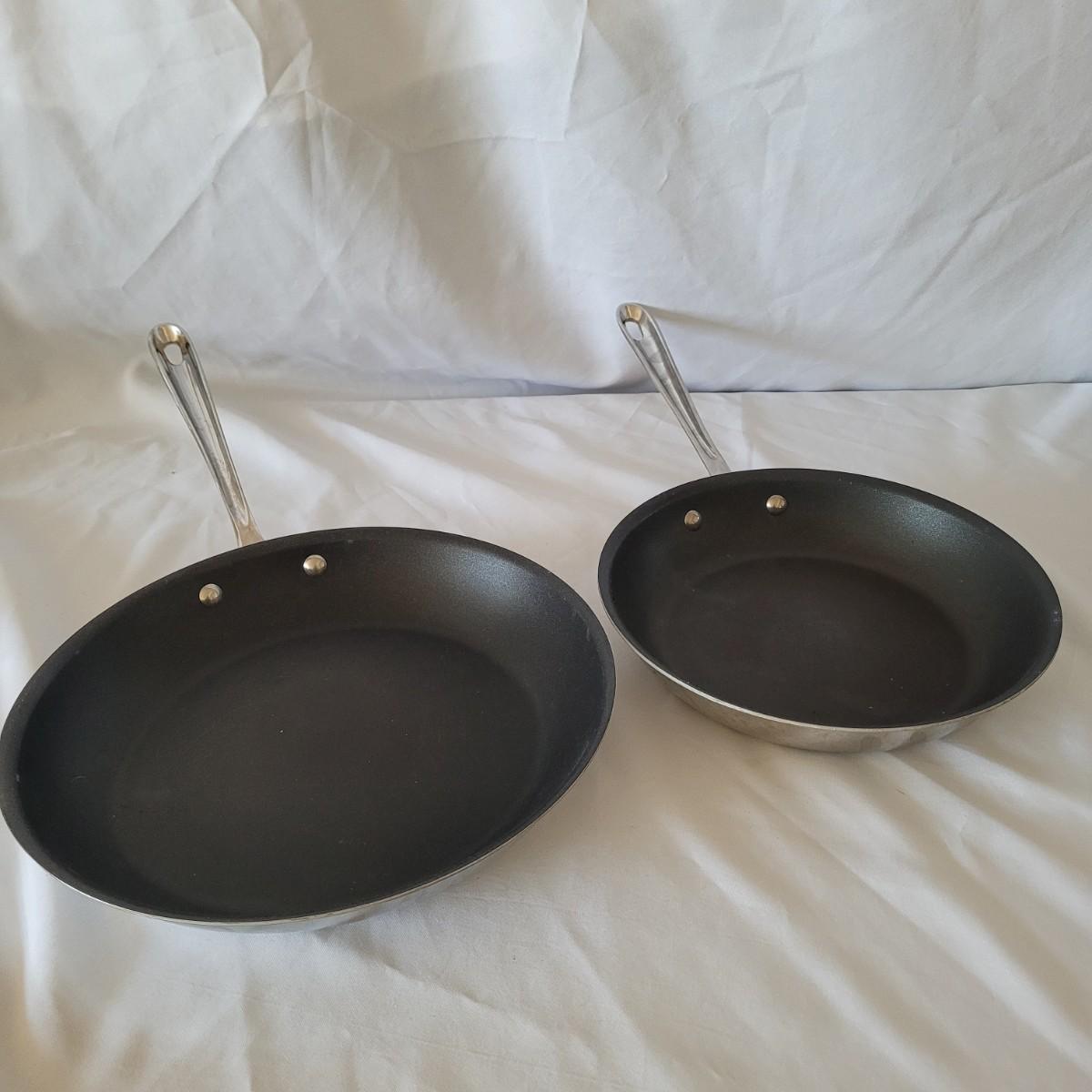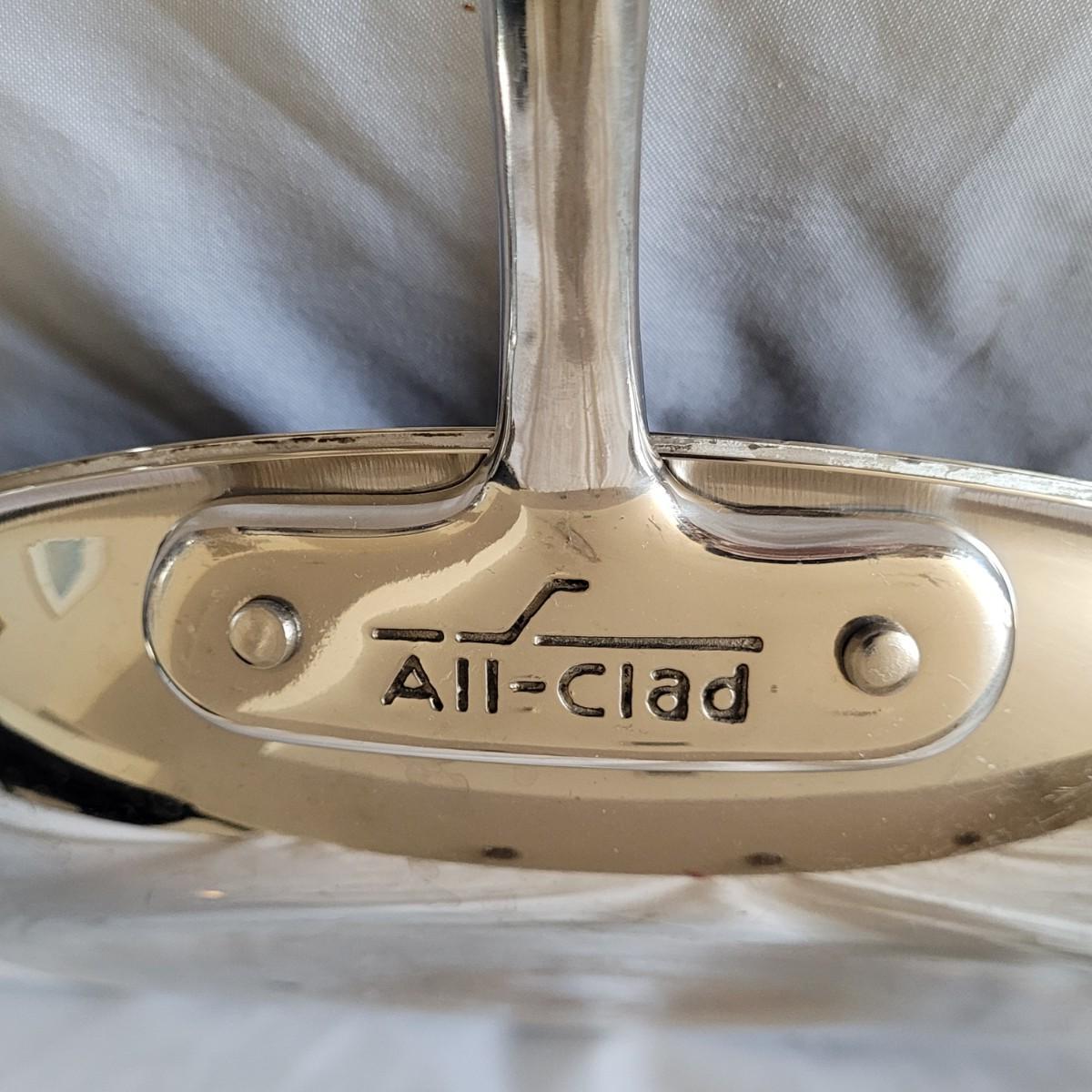 This lot includes five pieces of cookware. The two nonstick pans (10" and 12") and the short braising pot (11.5") are All-Clad brand. The braising pot includes matching lid. The other two items are Revere Ware brand and include a 10" saute pot with lid and a 9.5" stockpot with lid.