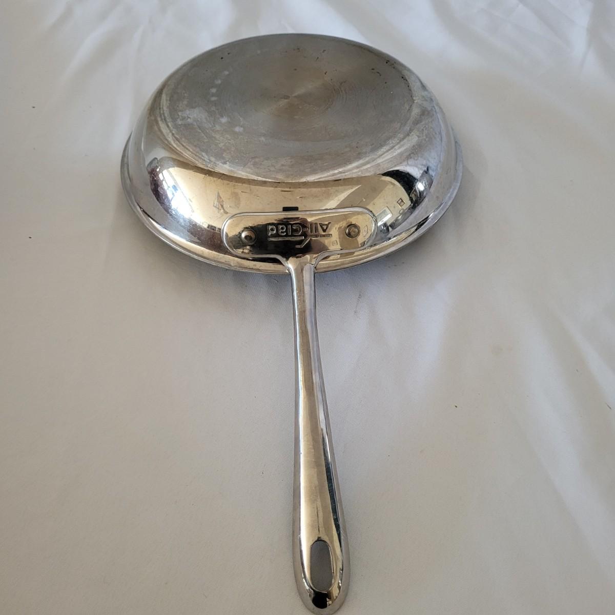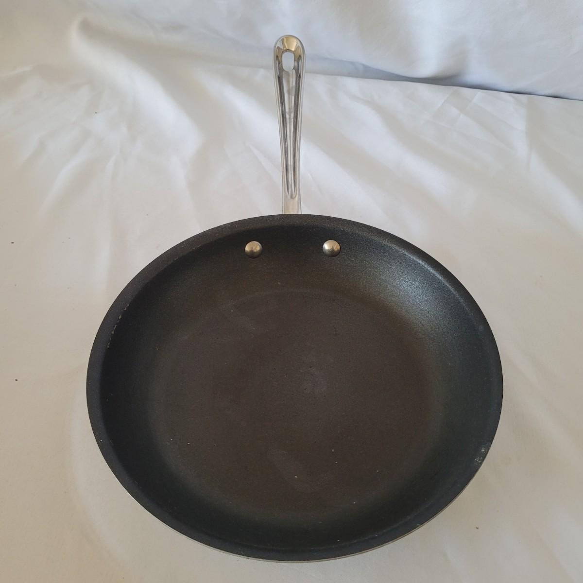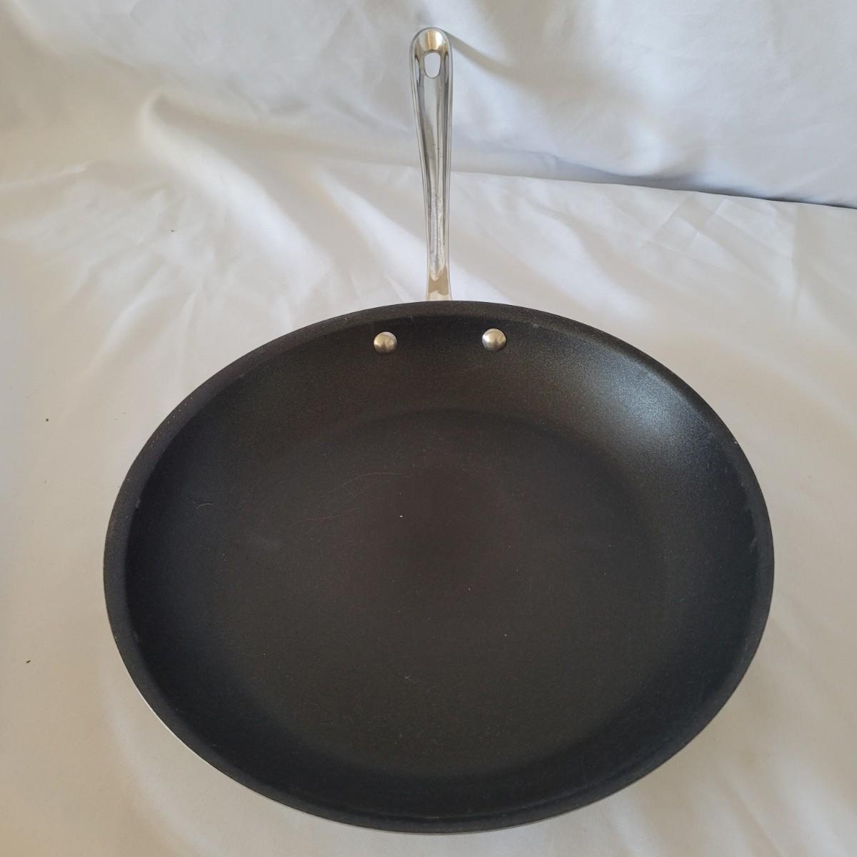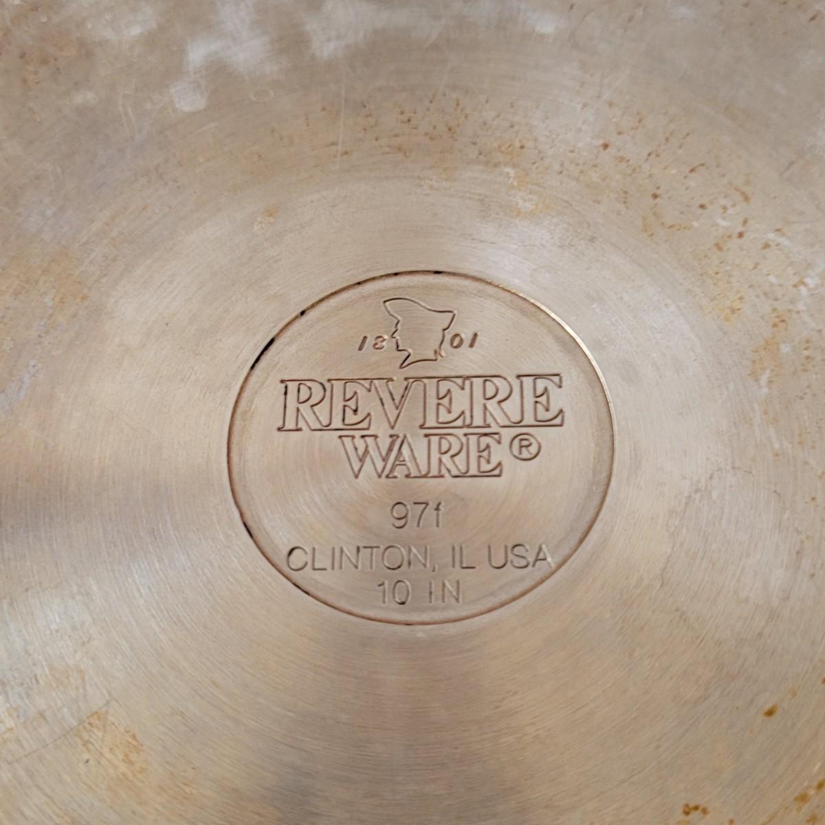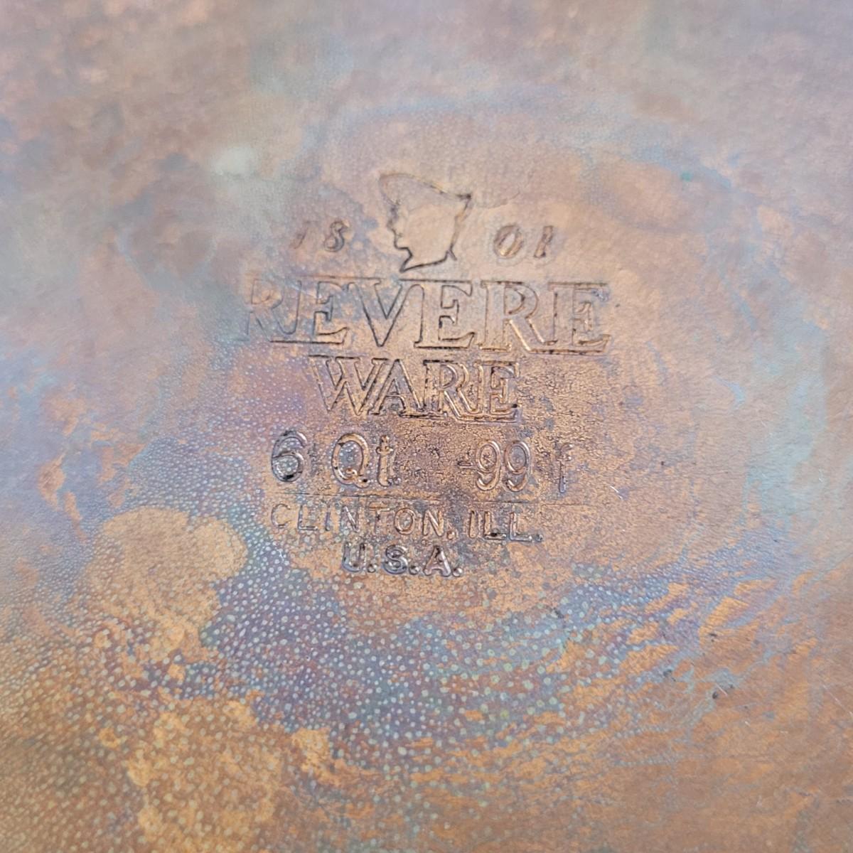 This lot includes five pieces of cookware. The two nonstick pans (10" and 12") and the short braising pot (11.5") are All-Clad brand. The braising pot includes matching lid. The other two items are Revere Ware brand and include a 10" saute pot with lid and a 9.5" stockpot with lid.