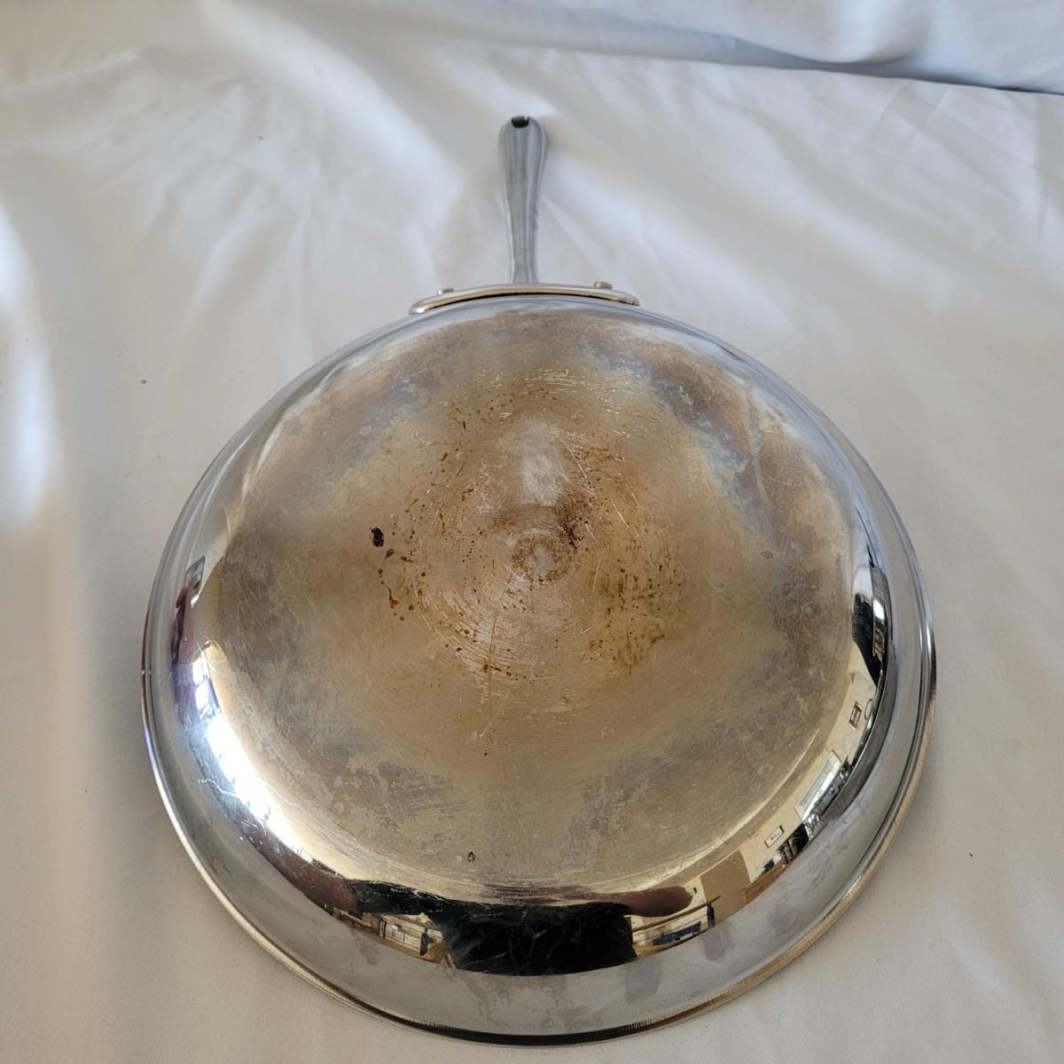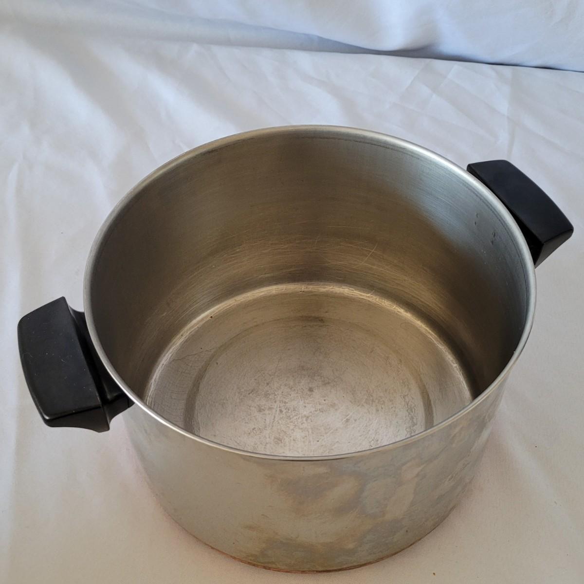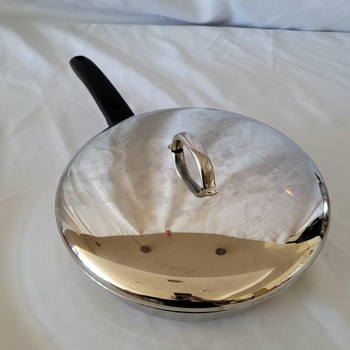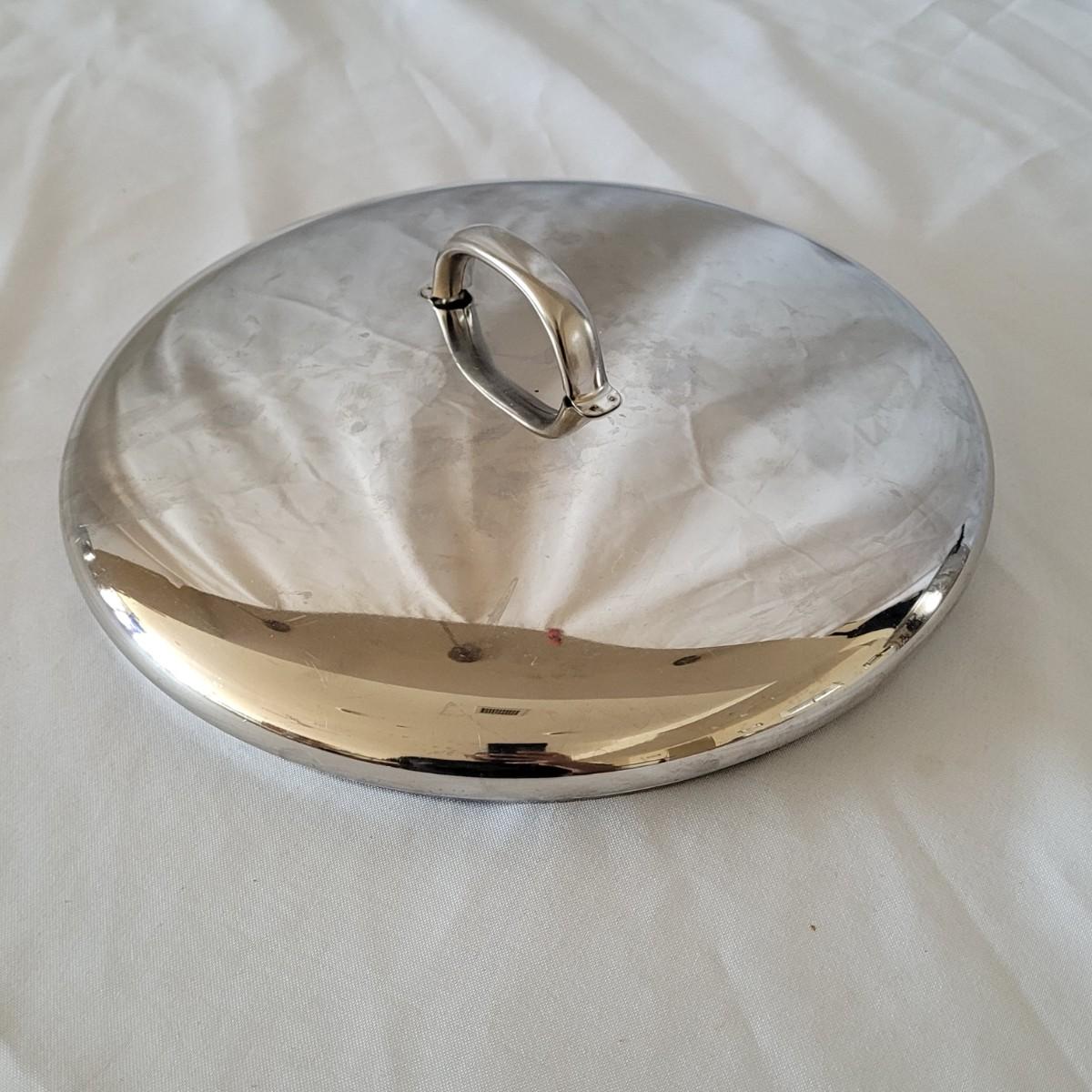 This lot includes five pieces of cookware. The two nonstick pans (10" and 12") and the short braising pot (11.5") are All-Clad brand. The braising pot includes matching lid. The other two items are Revere Ware brand and include a 10" saute pot with lid and a 9.5" stockpot with lid.