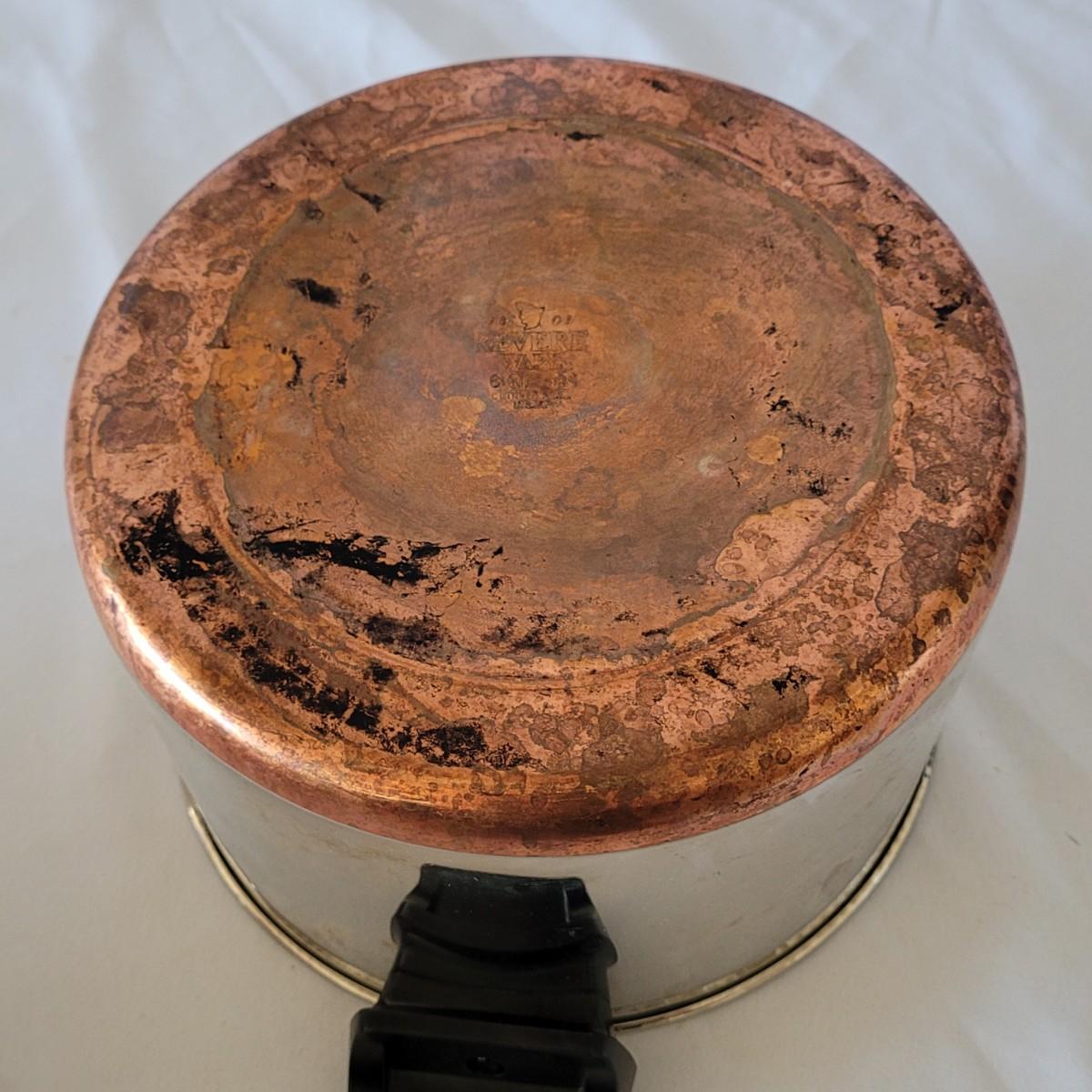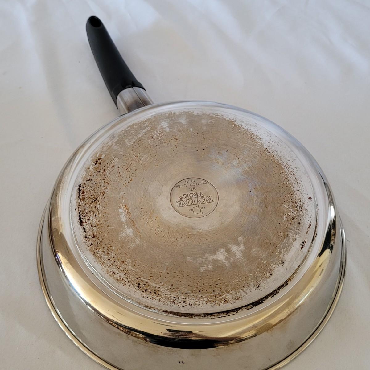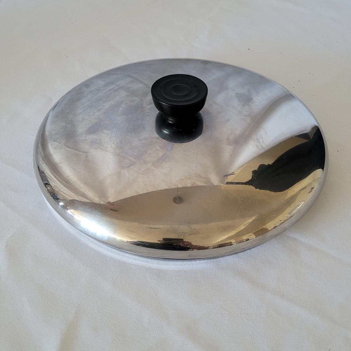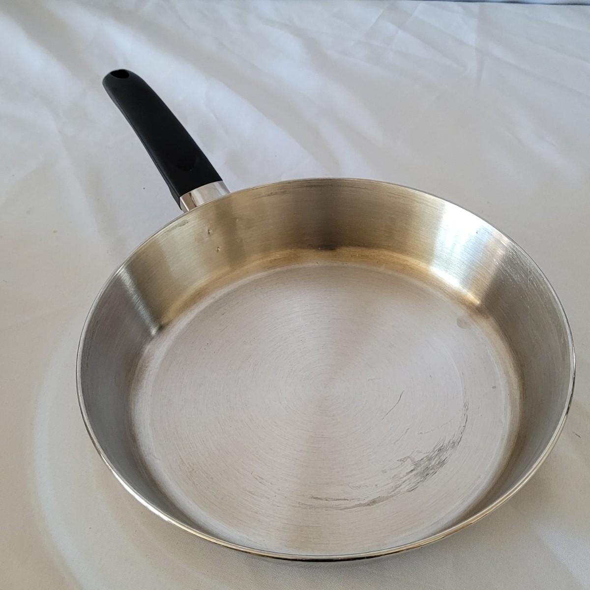 This lot includes five pieces of cookware. The two nonstick pans (10" and 12") and the short braising pot (11.5") are All-Clad brand. The braising pot includes matching lid. The other two items are Revere Ware brand and include a 10" saute pot with lid and a 9.5" stockpot with lid.