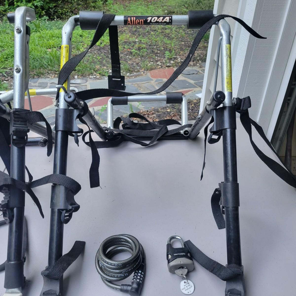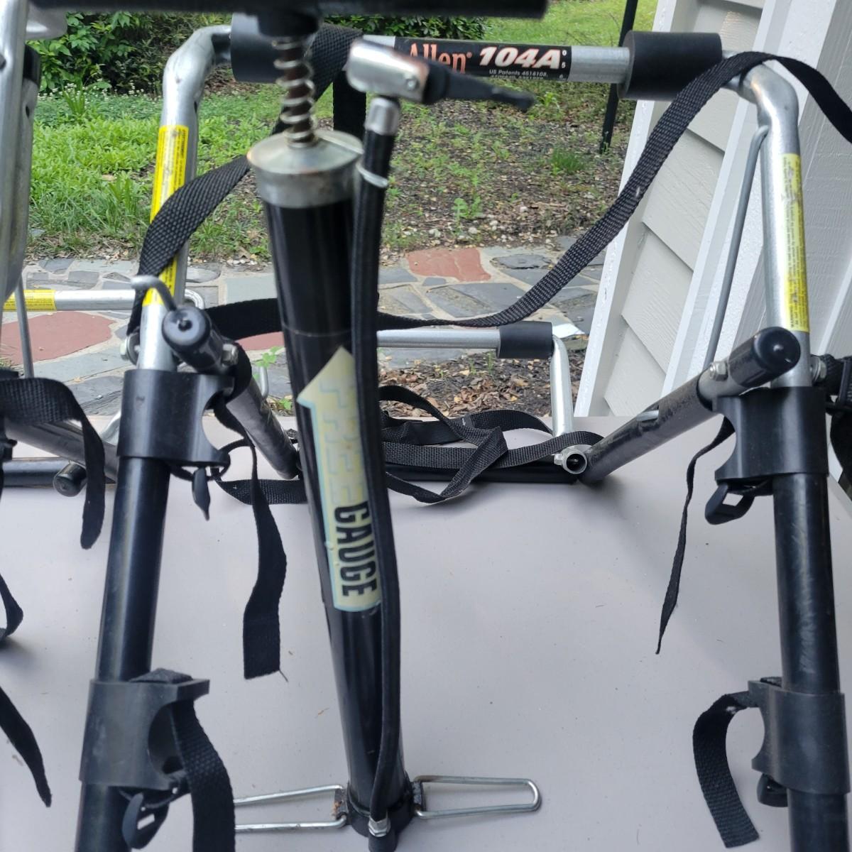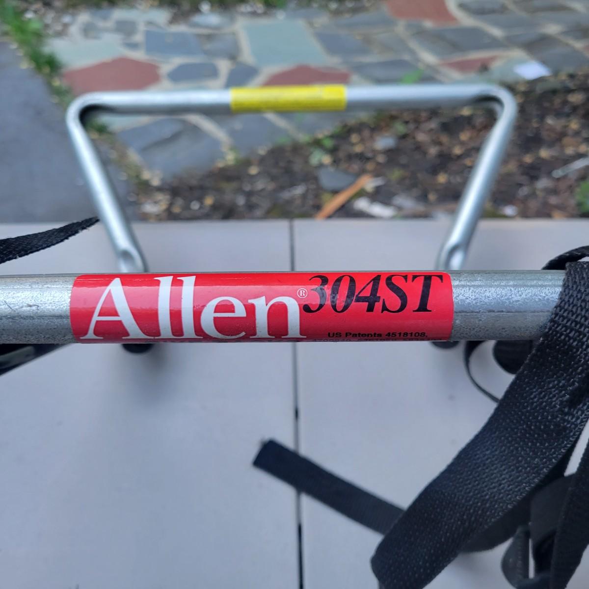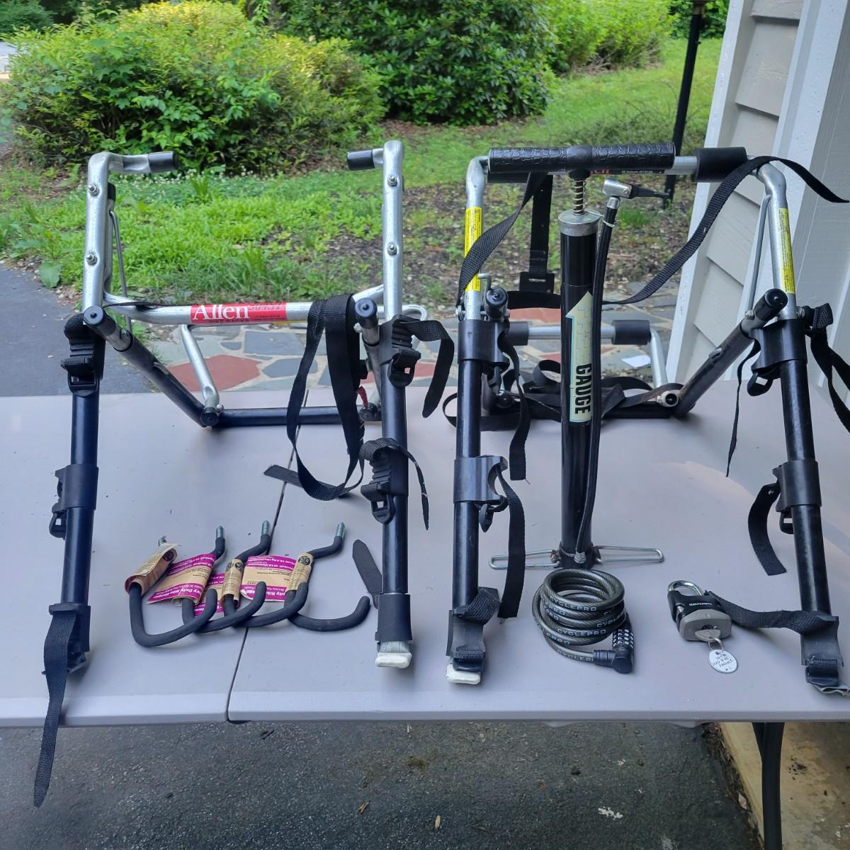 2 Allen bike racks in good condition. Both will carry 3 bikes. One is a 304st the other is a 104a. Also included is a air pump, 4 heavy duty bike hangers and 2 locks. Bike racks measure approximately 30" x 16" x 19" Local pickup only