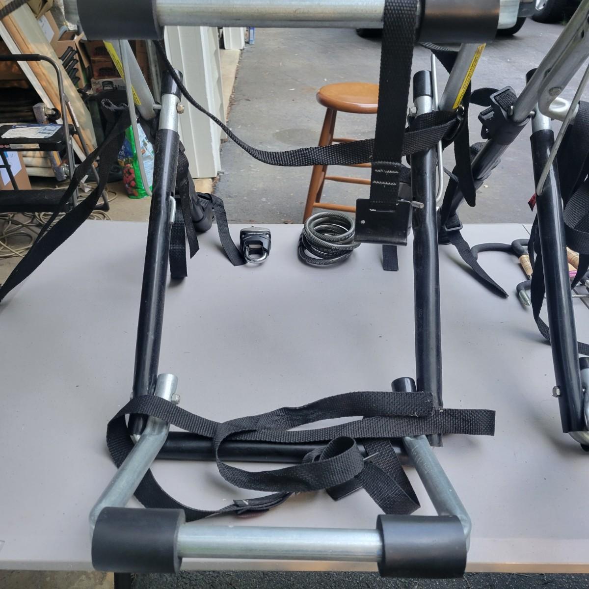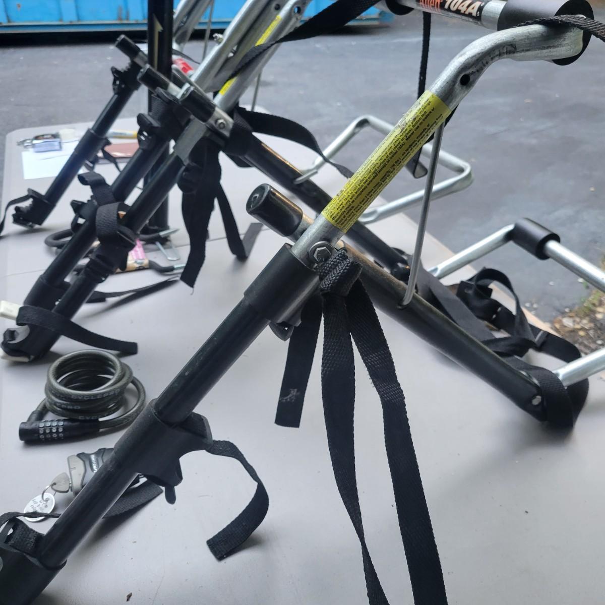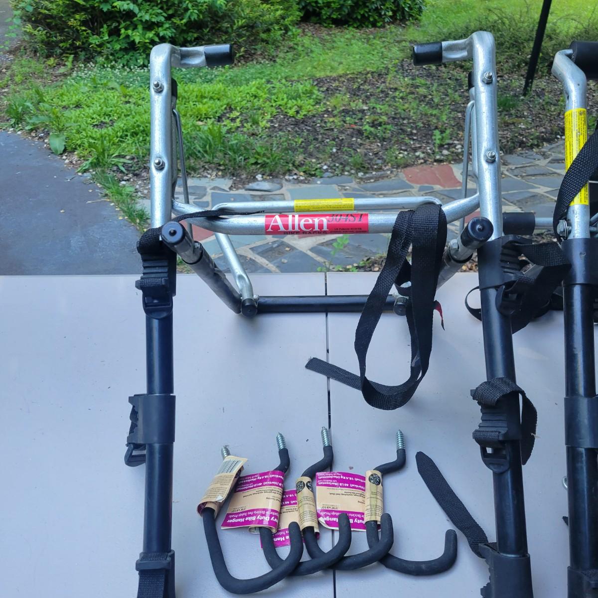 2 Allen bike racks in good condition. Both will carry 3 bikes. One is a 304st the other is a 104a. Also included is a air pump, 4 heavy duty bike hangers and 2 locks. Bike racks measure approximately 30" x 16" x 19" Local pickup only