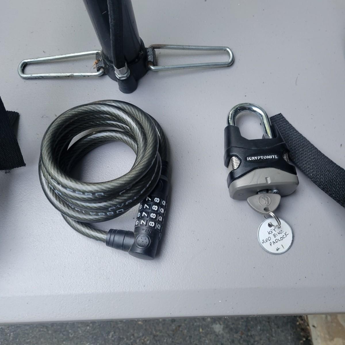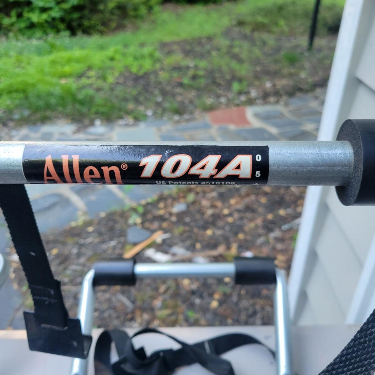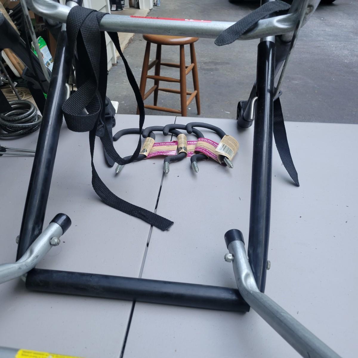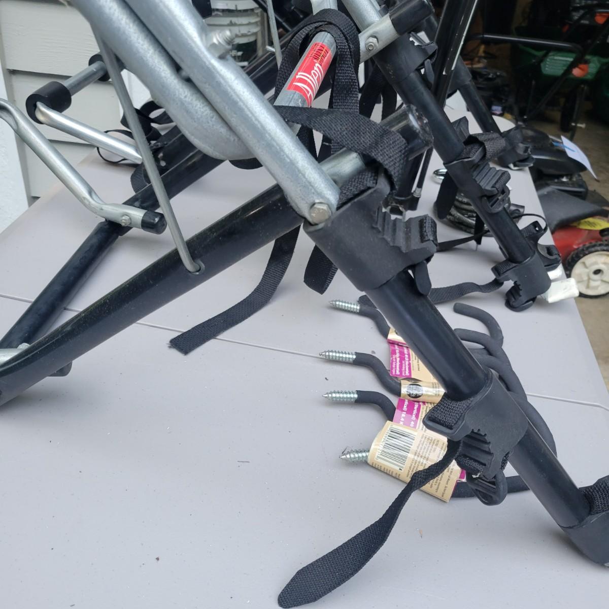2 Allen bike racks in good condition. Both will carry 3 bikes. One is a 304st the other is a 104a. Also included is a air pump, 4 heavy duty bike hangers and 2 locks. Bike racks measure approximately 30" x 16" x 19" Local pickup only