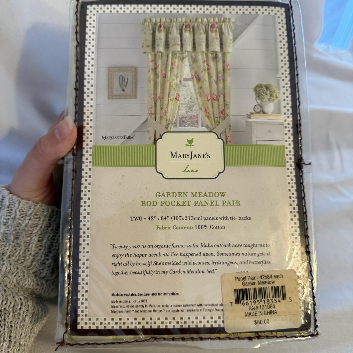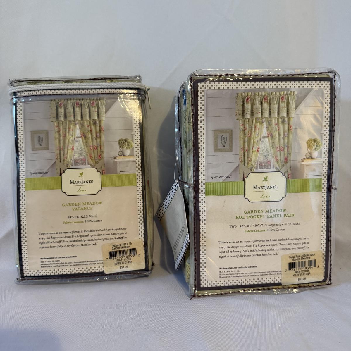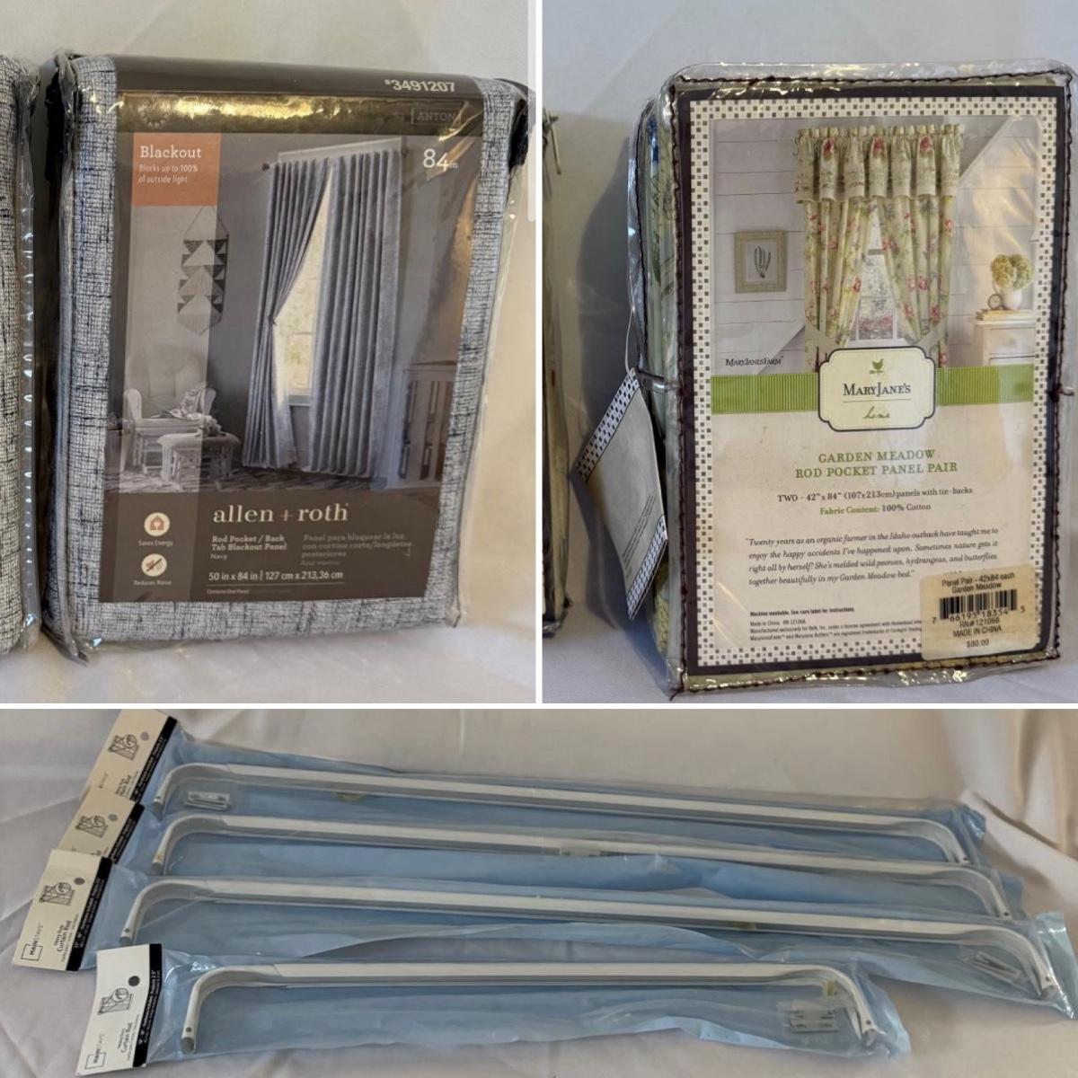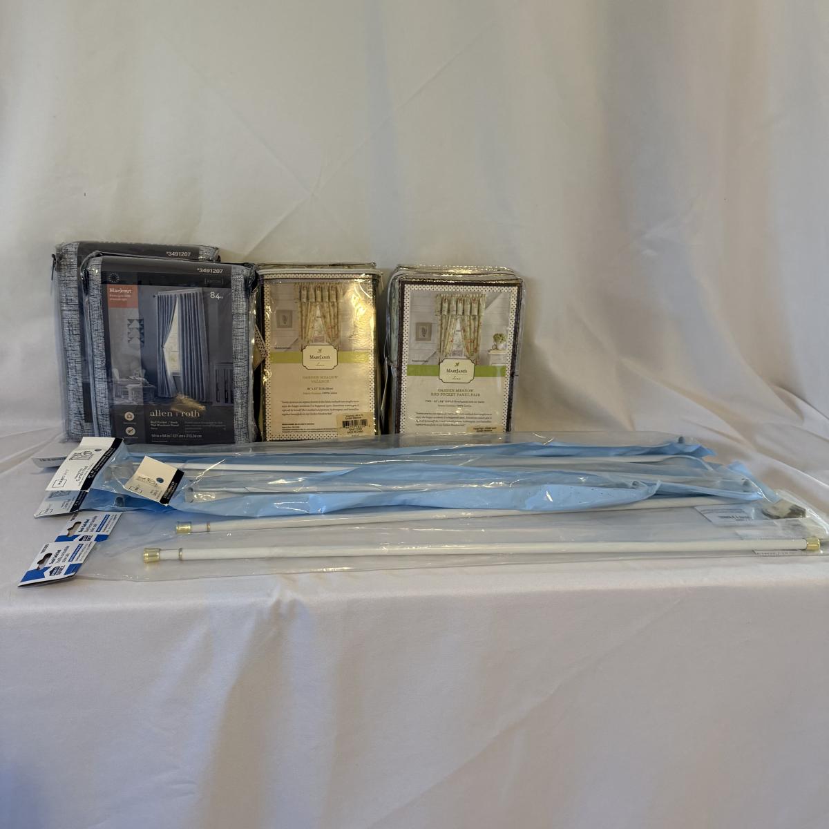 This lot contains ten NIB items. The first are two Allen & Roth blackout, rod pocket grey and black curtains. Both of these are NIB and measure 50” x 84”, are made of polyester, and each pouch contains one panel. Next we have a MaryJane’s “garden meadow” valance that is 100% cotton and measures 84” x 15”. Also included is a MaryJane’s “garden meadow” rod pocket panel pair which has two 42” x 84” panels with tie-backs also made with 100% cotton. Next we have three heavy duty adjustable curtain rods that measure 27”-48” as well as a single heavy duty adjustable curtain rod that measures 18”-30”. Lastly we have two adjustable sash cafe rods that measure 20”- 48”. Shipping available.