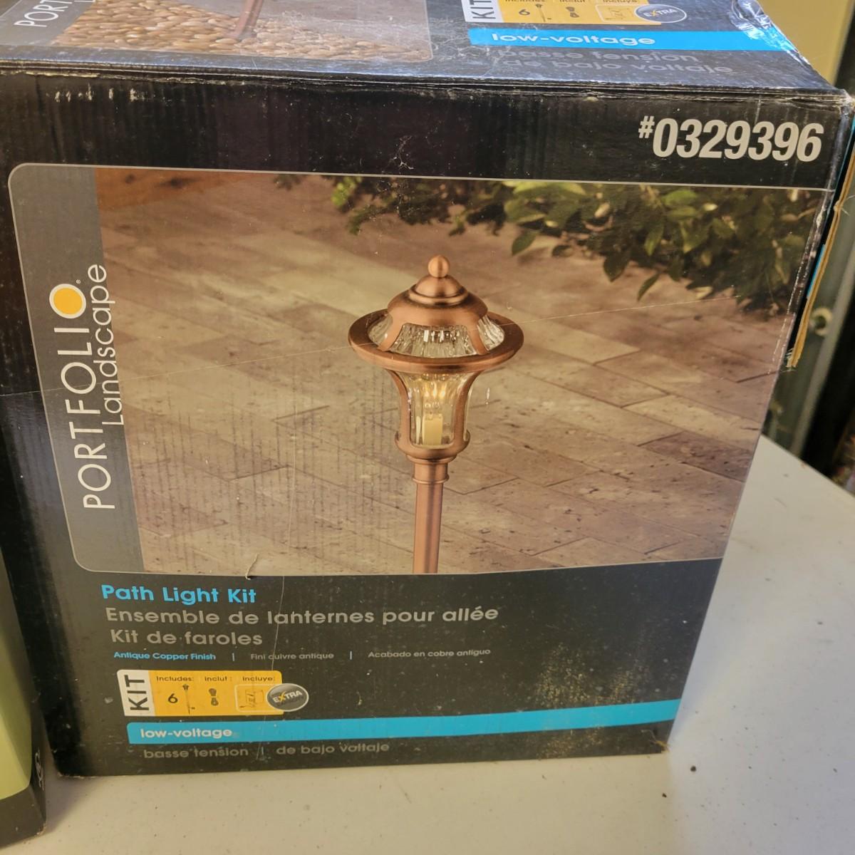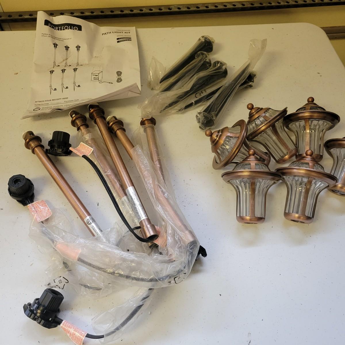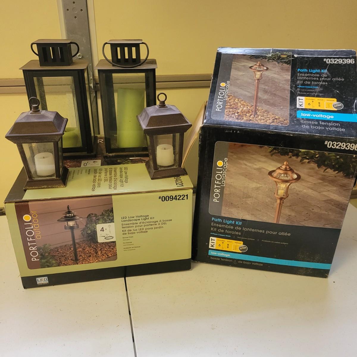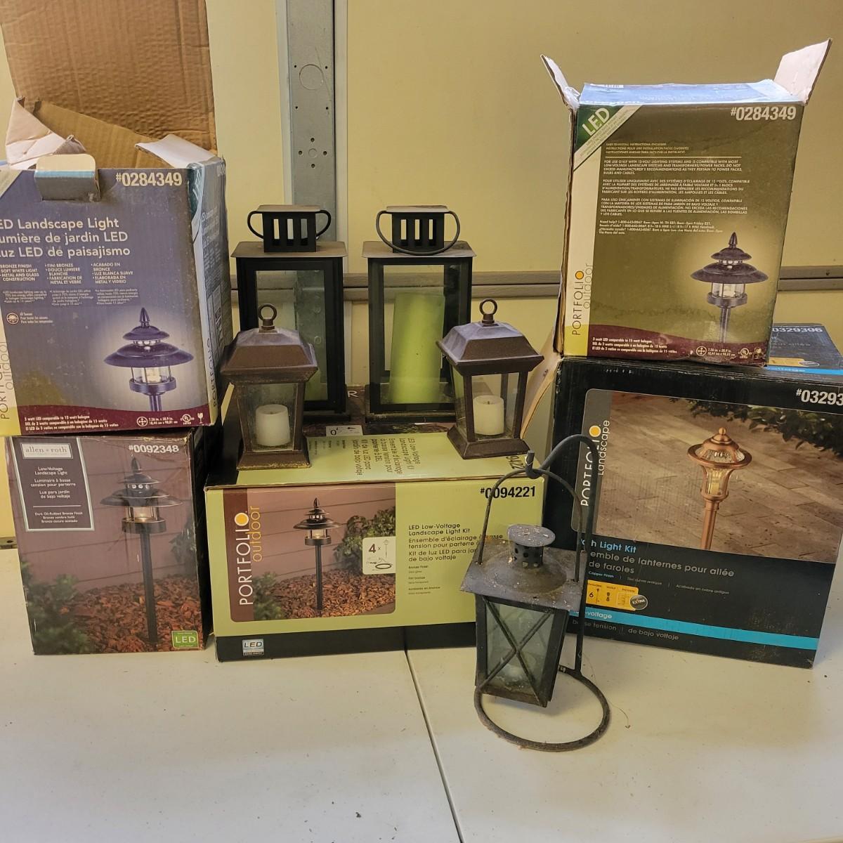 An assortment of luminaries in fair to good condition. None of the solar or powered lights were tested. Many of these items were used and cannot guarantee all items listed on the boxes are present. This lot includes an assortment of Roth and Allen, and Portfolio path lights. Also included are two candle lanterns made of metal, one hanging lantern made of metal and two battery powered votive lanterns. The two candle lanterns measure approximately 6' x 6" x 11". Shipping available. Shipping can be costly. We suggest calling our local UPS with dimensions and getting an estimate before bidding: (828) 252-6930