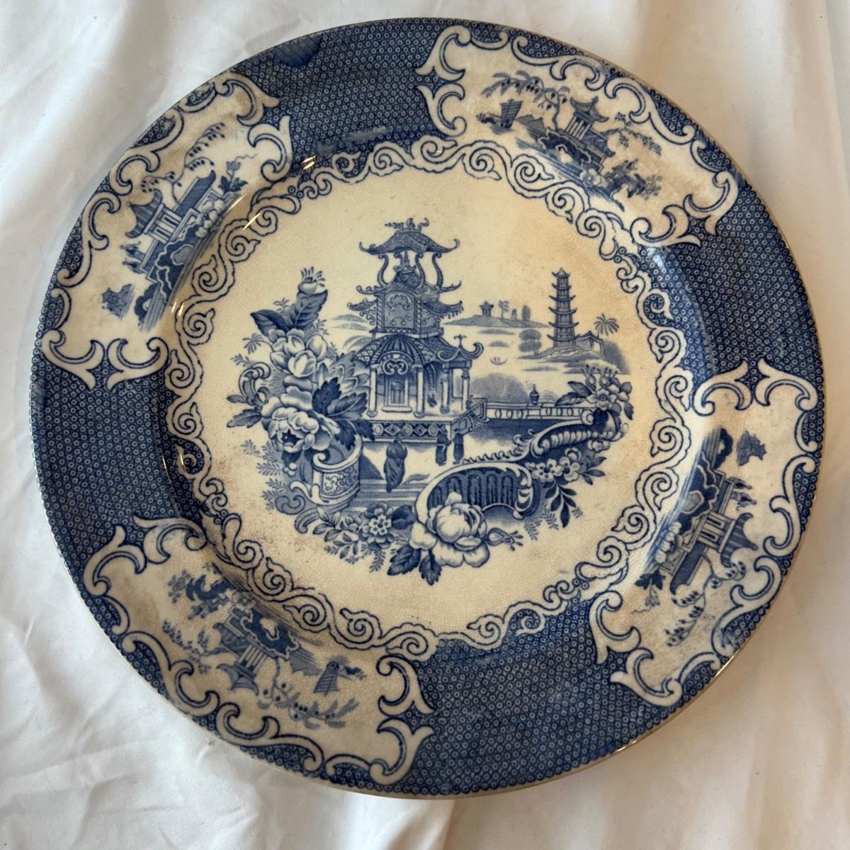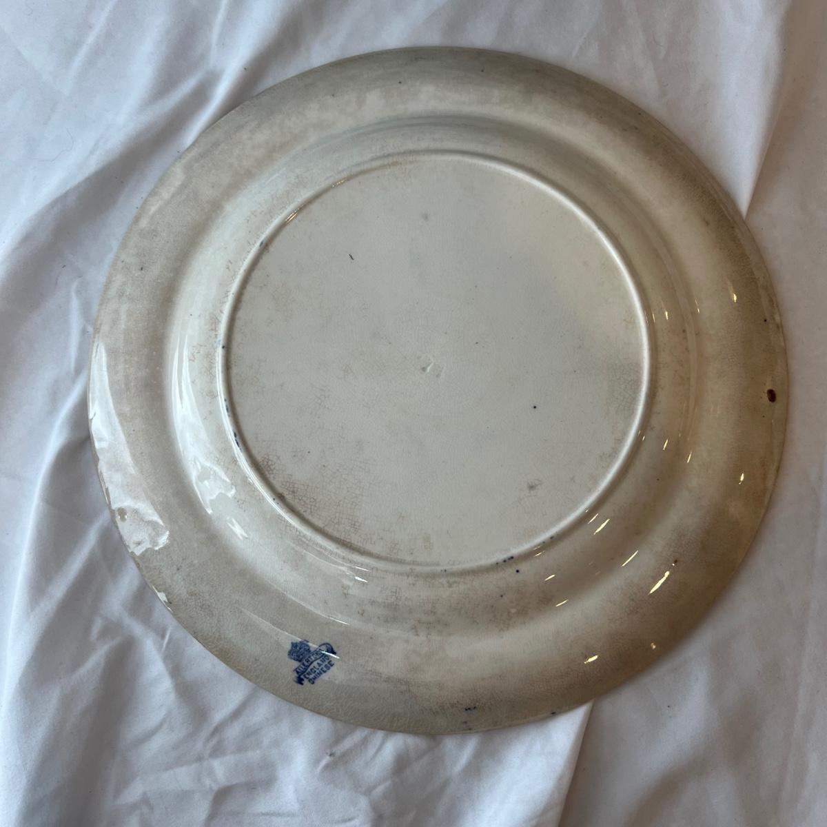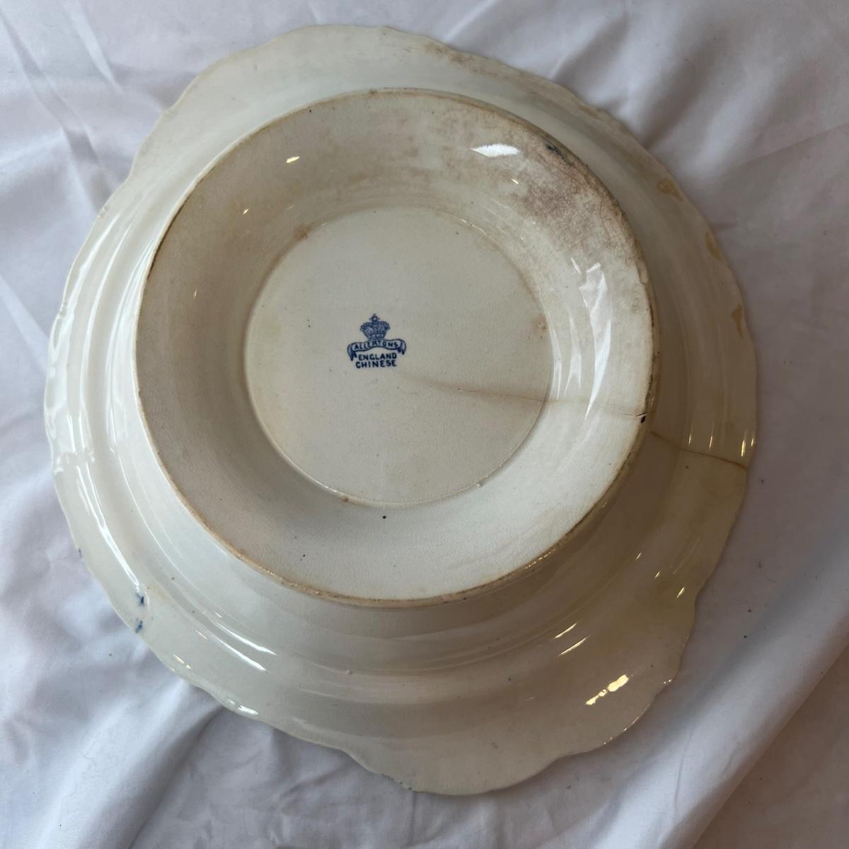 Six Allerton dinner 10”D plates, one 9”D plate plus one serving bowl that measures 10”D x 3”H. See photos for examples of wear.