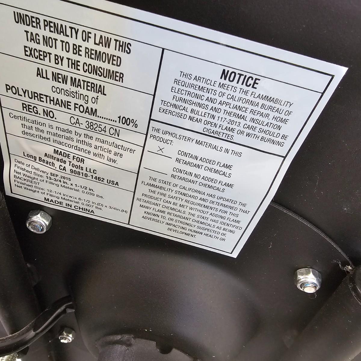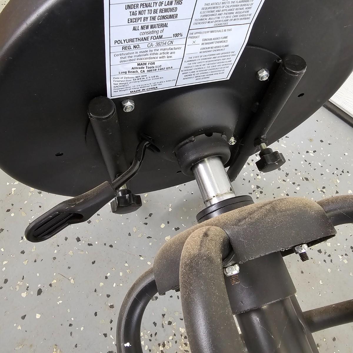 Traditional style shop stool by Alltrade. Has adjustable back and height, padded plasticized seat and back. Stool measures 20" x 20" x 39"H, seat height adjusts from 29" to 34"H. See photos for details. Local pickup only.