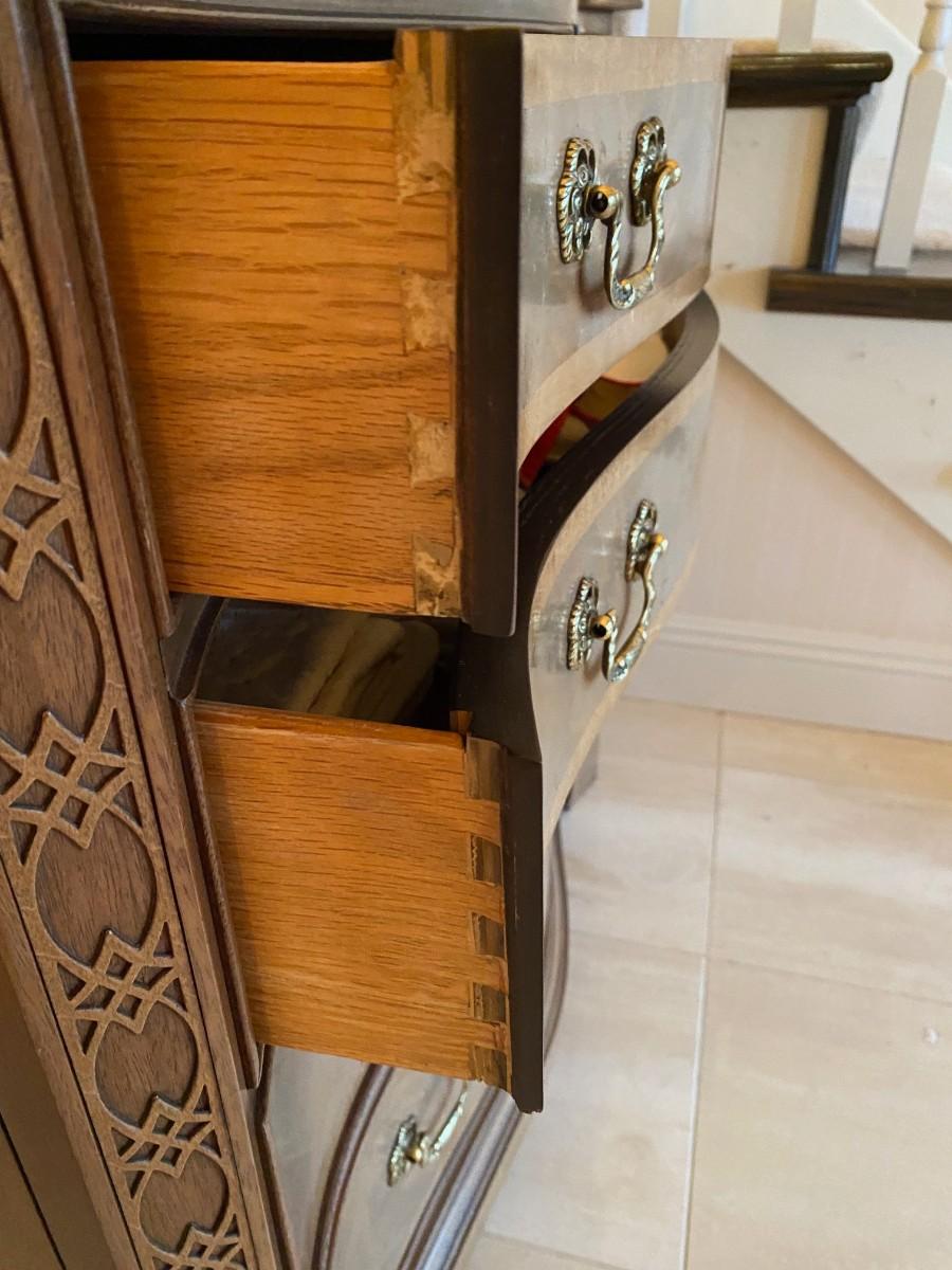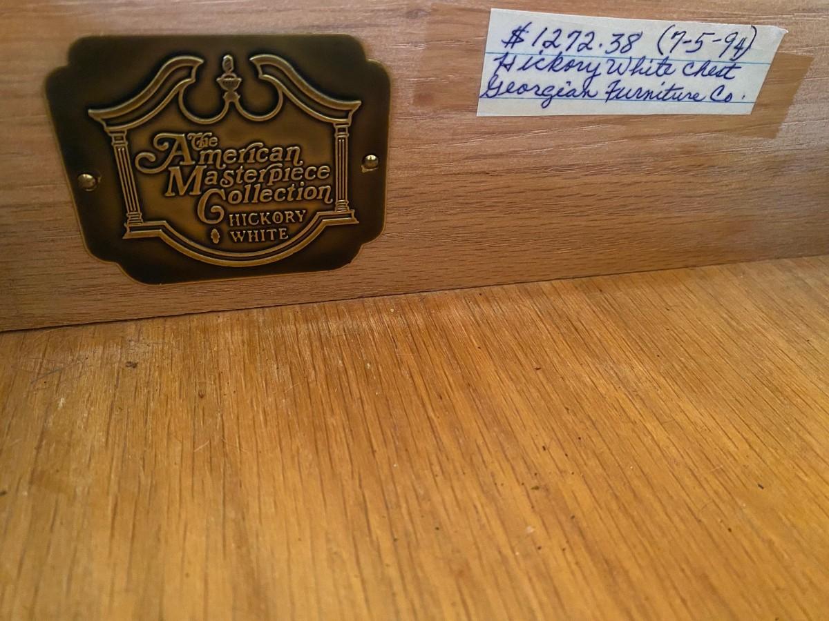 All-wood Hickory White chest, vintage. American Masterpiece Collection from Georgian Furniture Co., 5 dovetailed drawers. There is a little peeling of the finish on the front of the drawers. Otherwise, in very good condition. Original price $1272