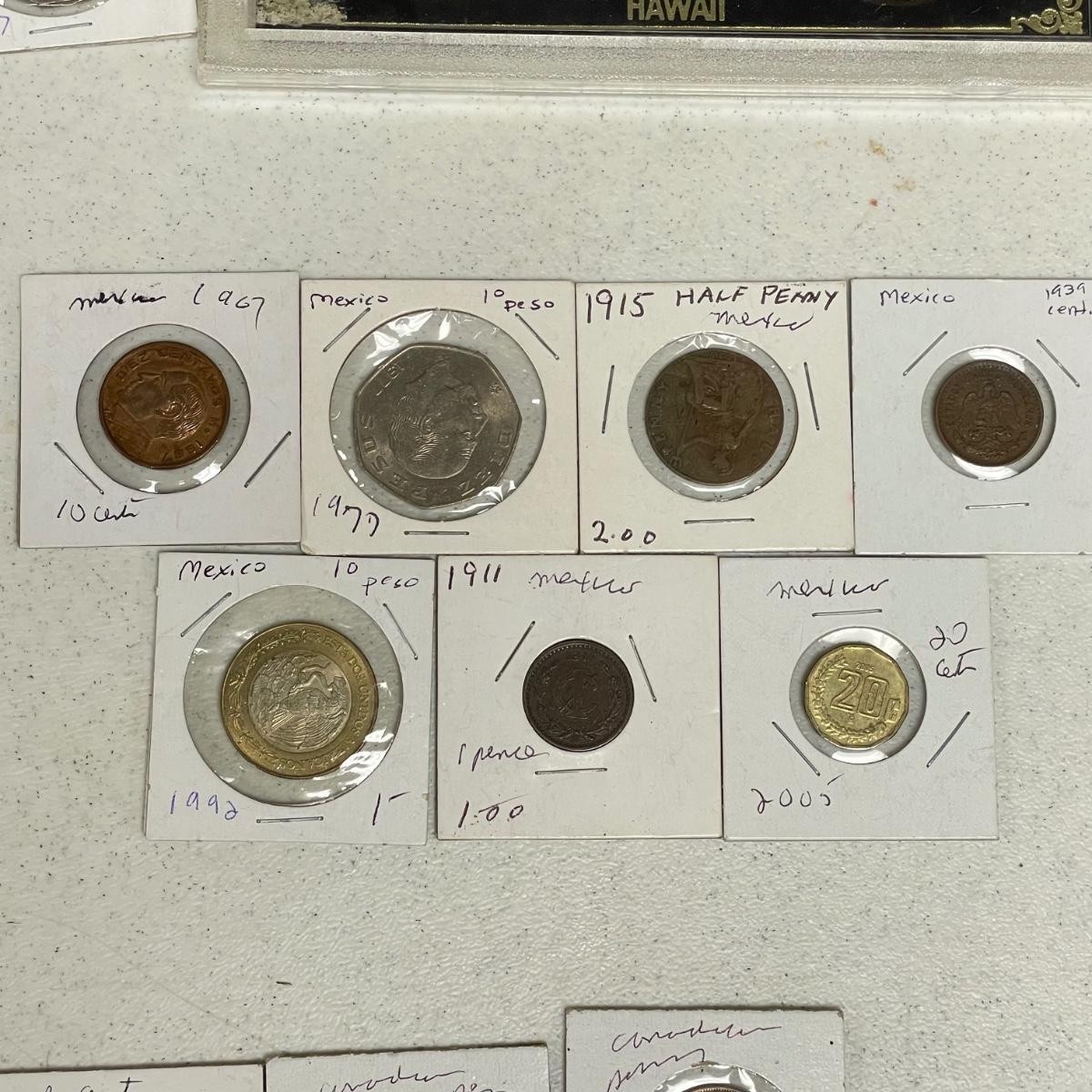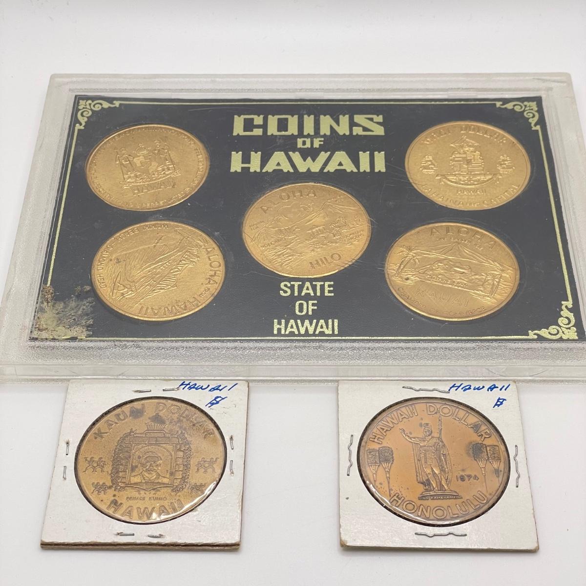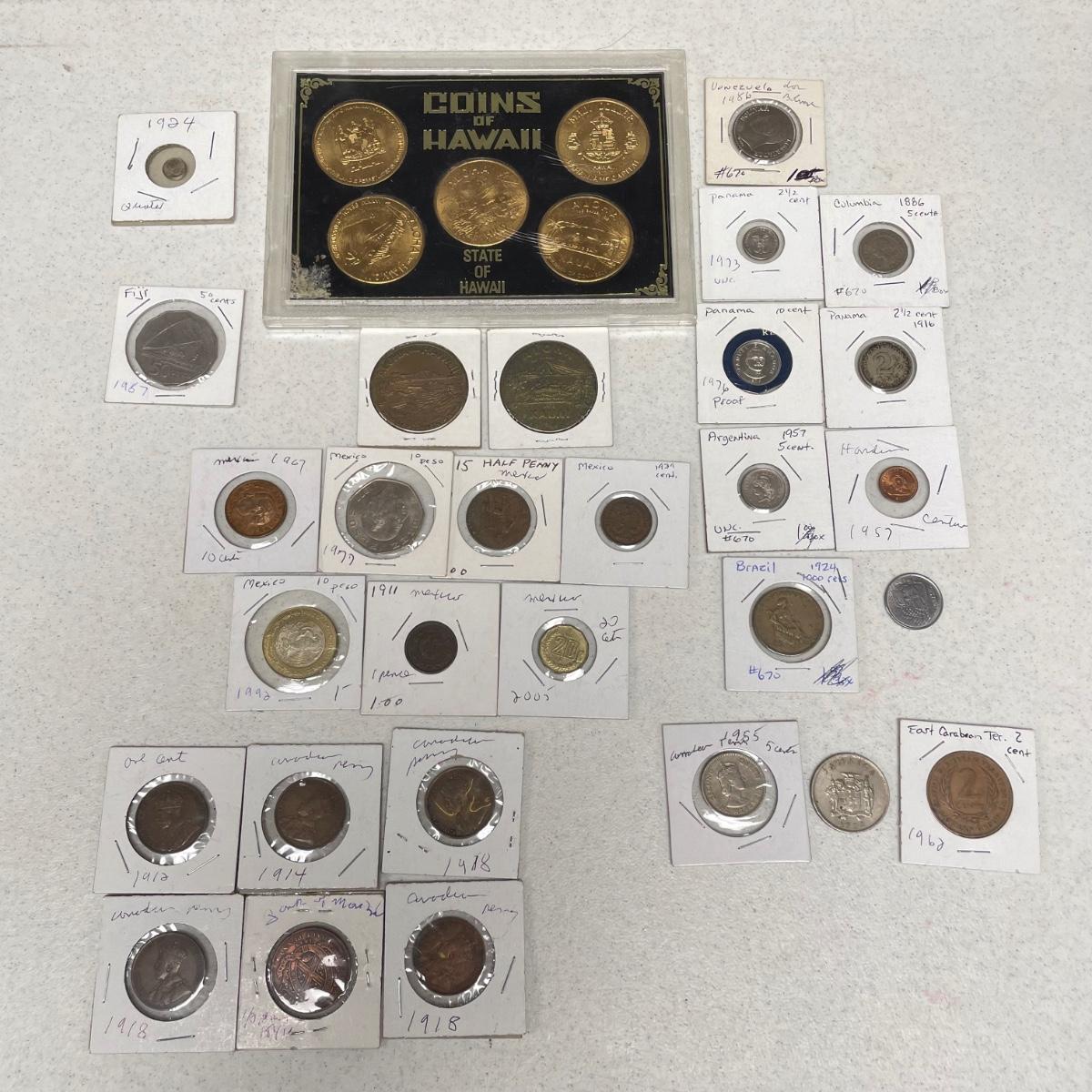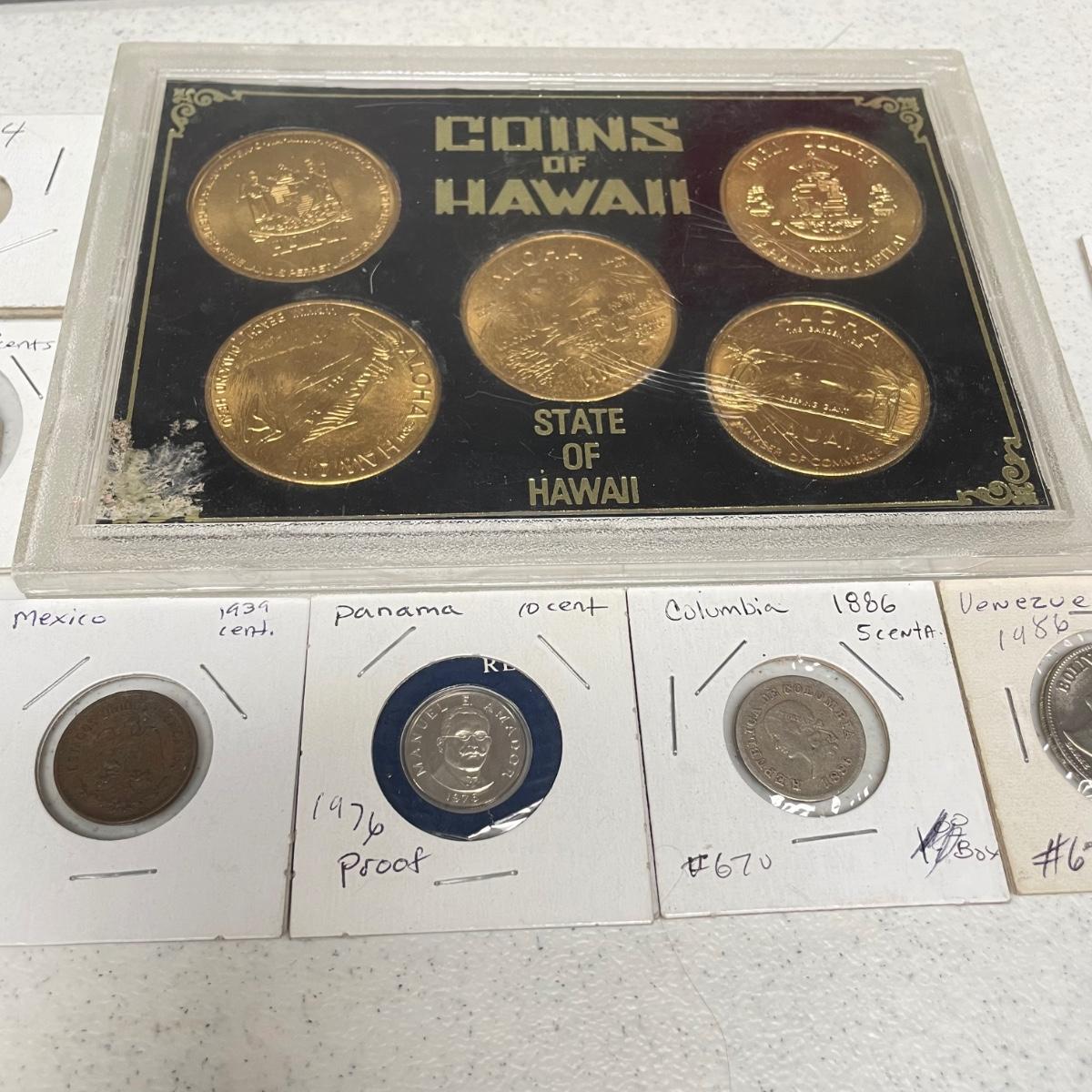 Large selection of North and South American coins plus Hawaii and Fiji. A capital plastic set of five Hawaiian dollar coins plus loose Honolulu and Kauai dollar coins. Sleeved coins include written out countries like Panama, Venezuela, Canada, Jamaica, Honduras, Argentina and more. Lot also features a miniature US Standing Quarter. All sales are final. No returns or refunds. Please bid accordingly. Shipping available.