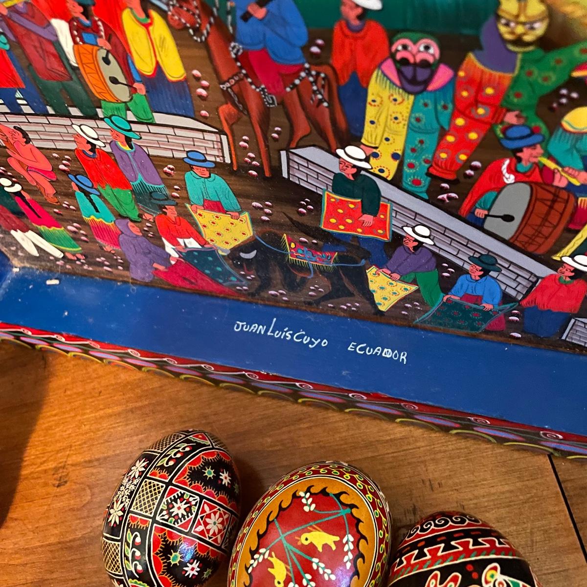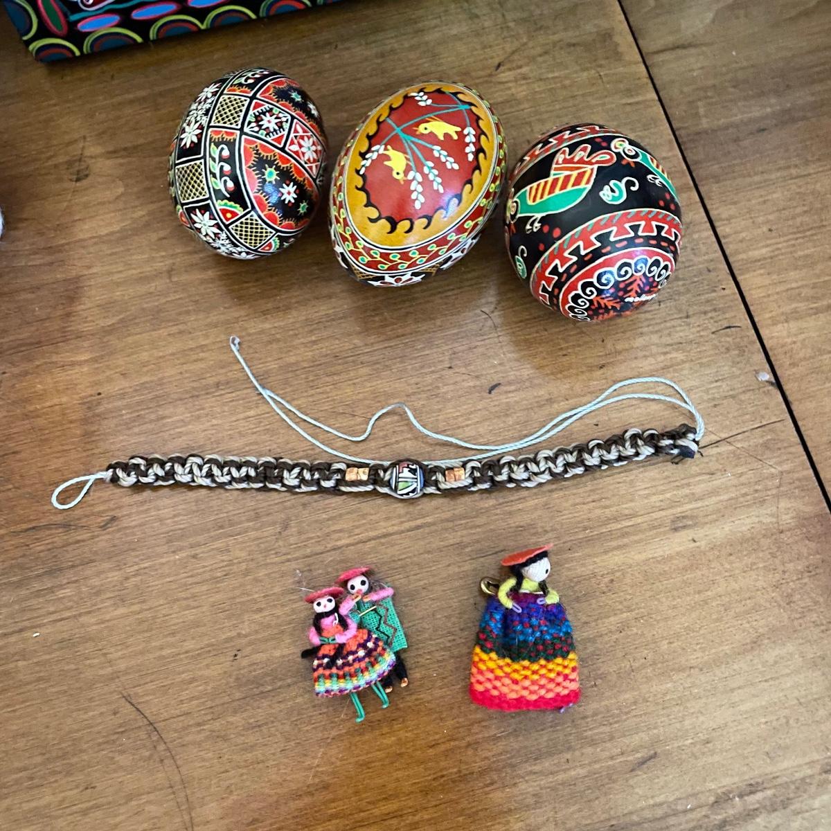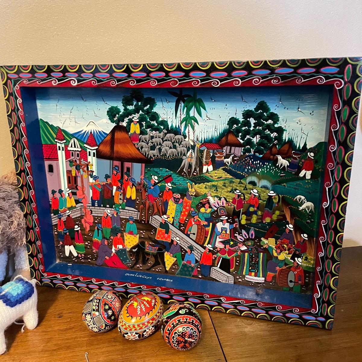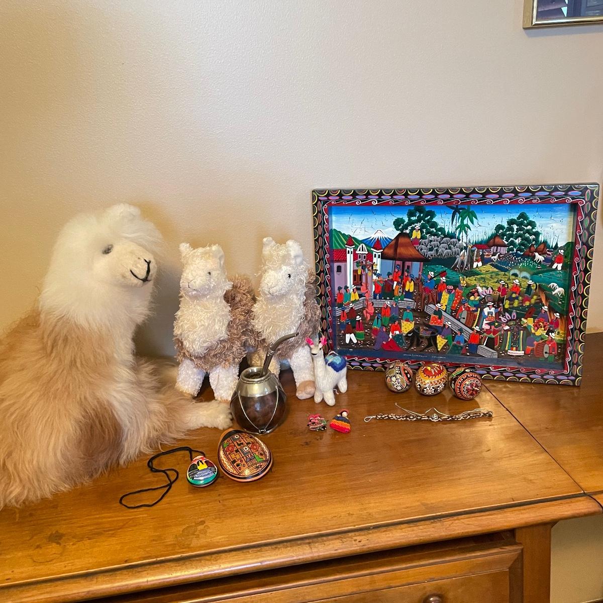 Colorful and fun lot from around the world. A Yerba Mate cup seems to be a mix of metal and leather. Three lightweight hand painted eggs, a colorful festival scene from Ecuador along with two Douglas alpacas and a larger stuffed alpaca with what appears to be real wool. A wooden pendant and a 4” wooden whistle. See images. The festival art is 16” x 12”. Local pick up only.