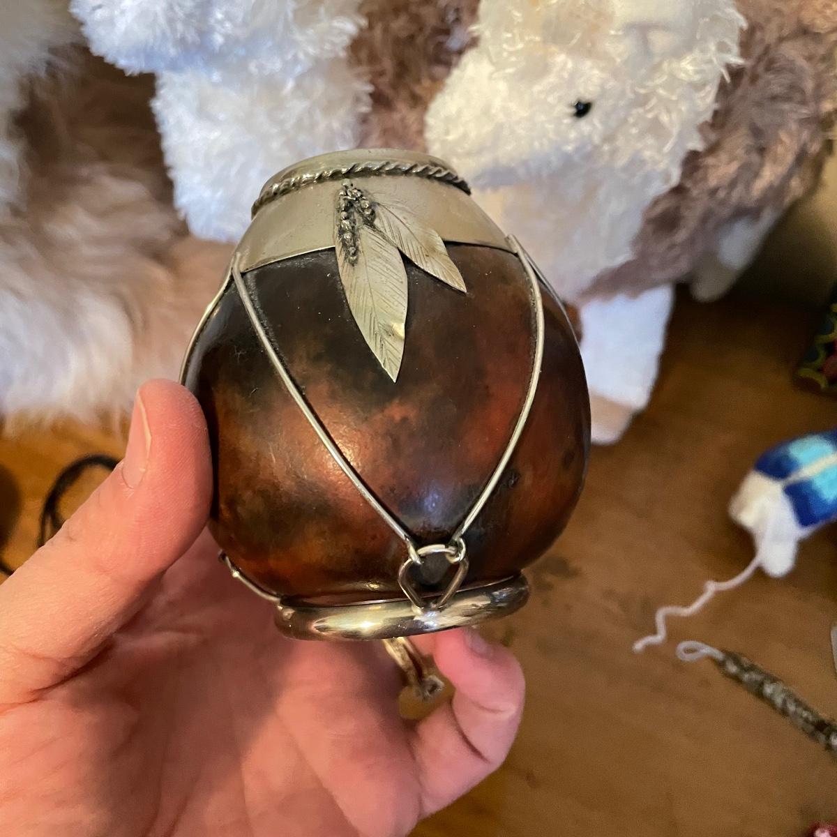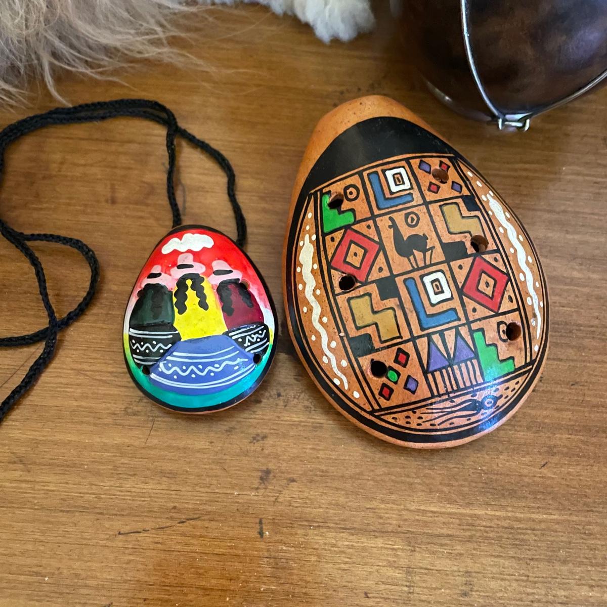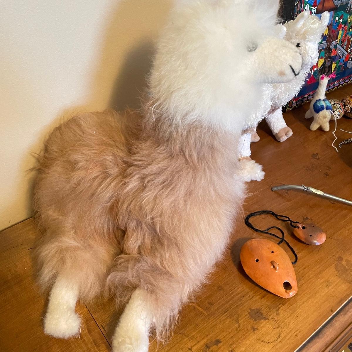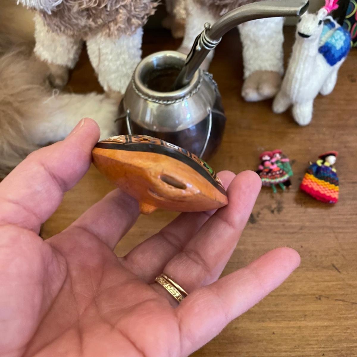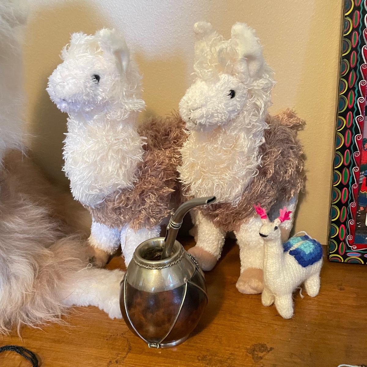 Colorful and fun lot from around the world. A Yerba Mate cup seems to be a mix of metal and leather. Three lightweight hand painted eggs, a colorful festival scene from Ecuador along with two Douglas alpacas and a larger stuffed alpaca with what appears to be real wool. A wooden pendant and a 4” wooden whistle. See images. The festival art is 16” x 12”. Local pick up only.