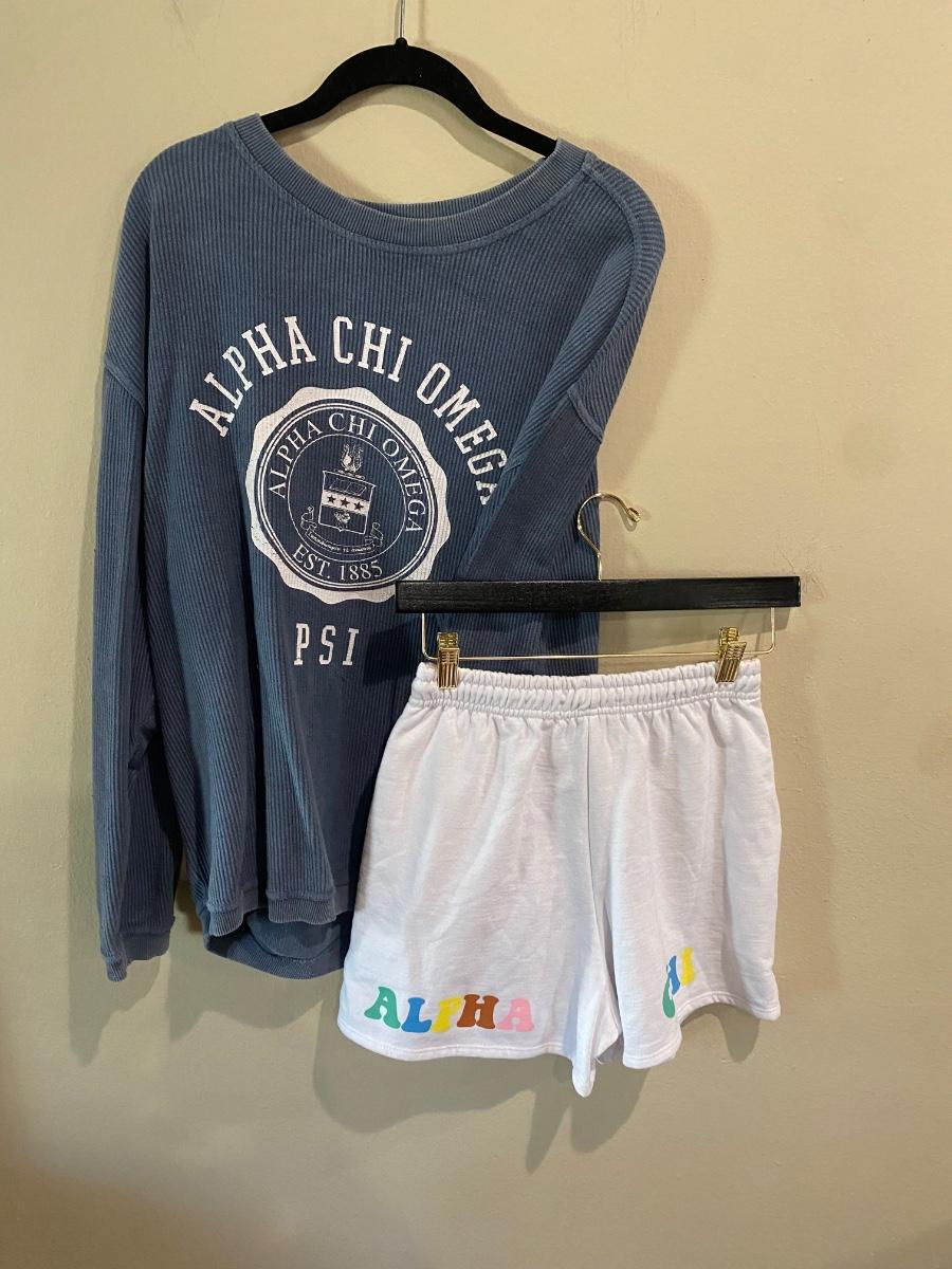 Alpha Chi Omega sweatshorts (XS) and shirt (medium)
