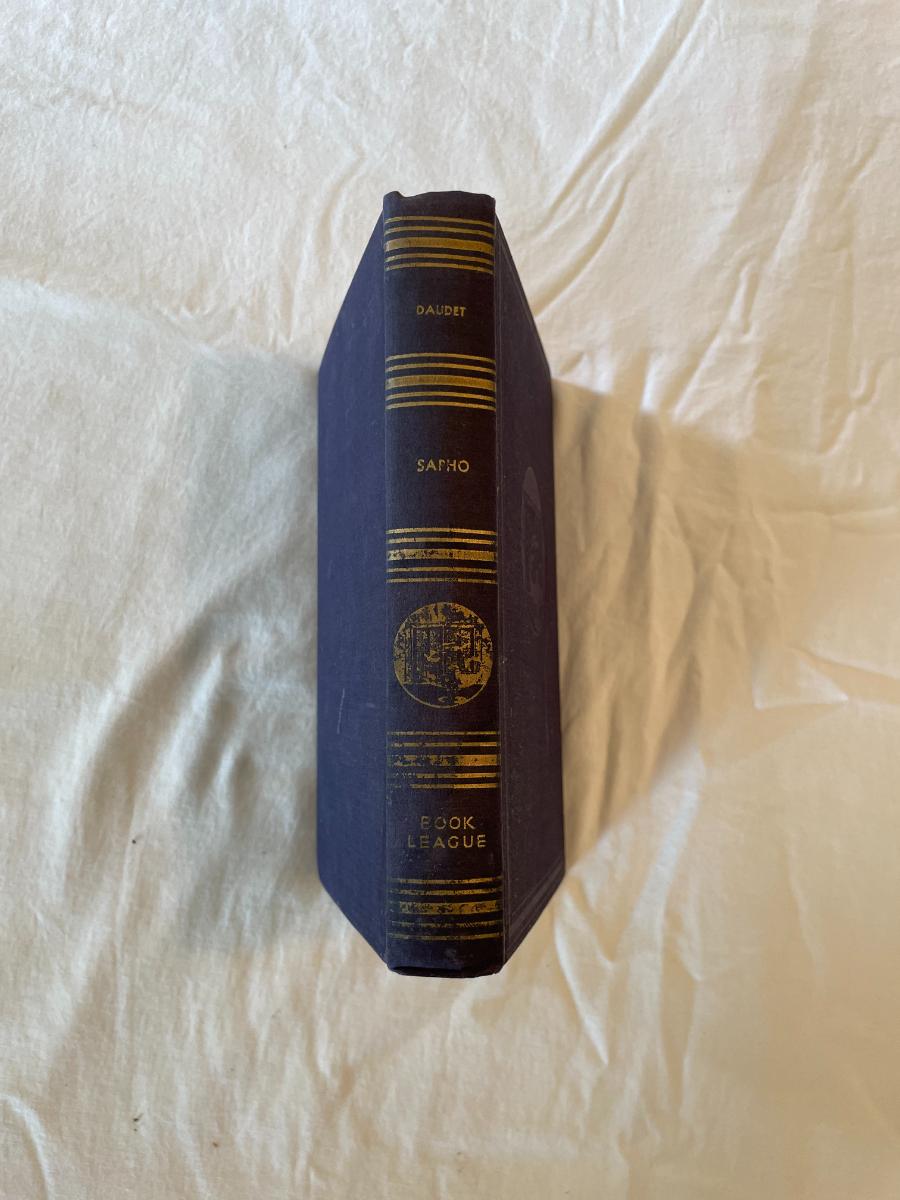 Hardcover copy of "Sapho" by Alphonse Daudet, published in 1946 by The Book League of America, Inc. Features an introduction by Carl Van Doren. Bound in dark cloth with embossed cover emblem and gold titling on the spine. Interior pages are free of notable markings or annotations. Includes blank endpapers. Condition shows minor wear to the cover with no significant damage.