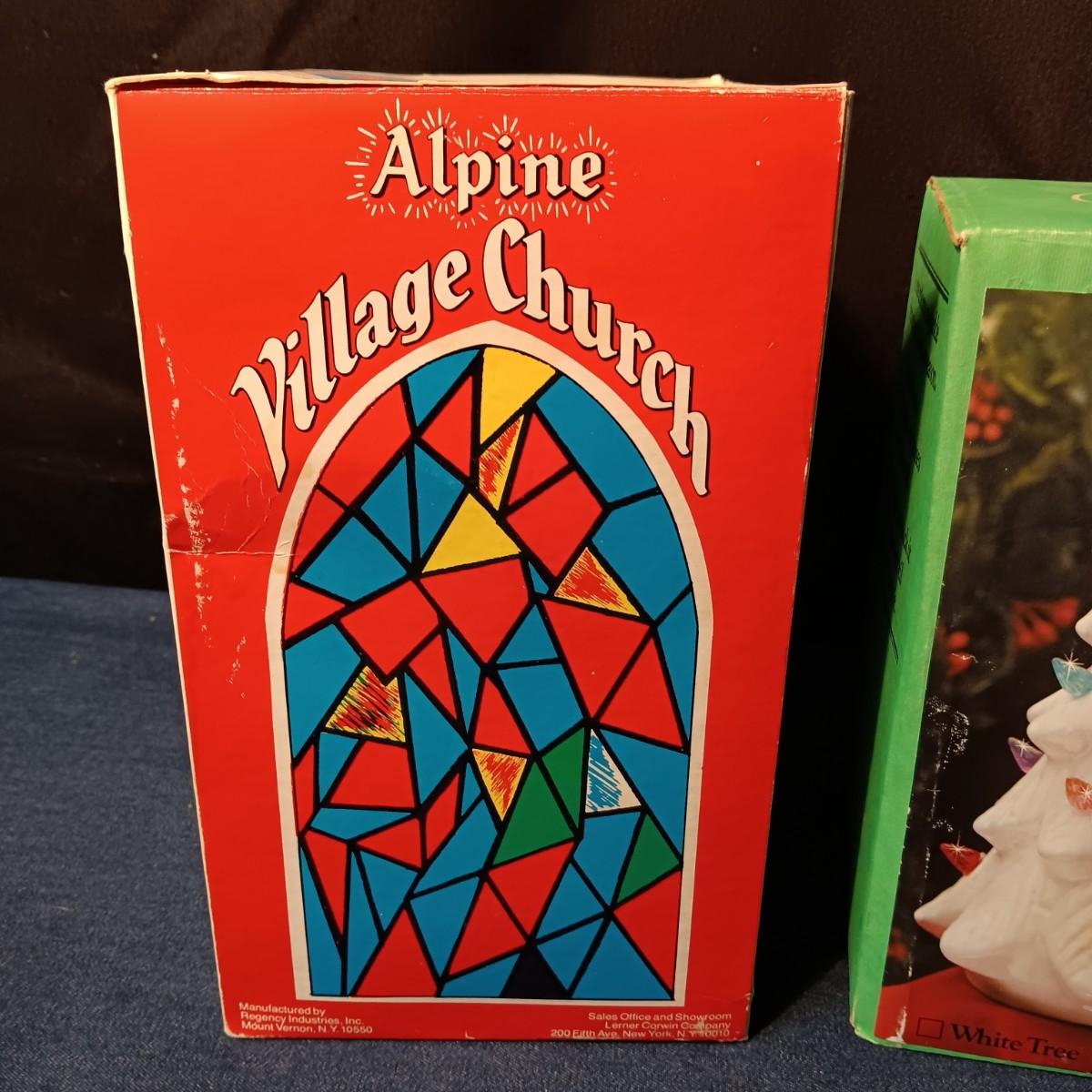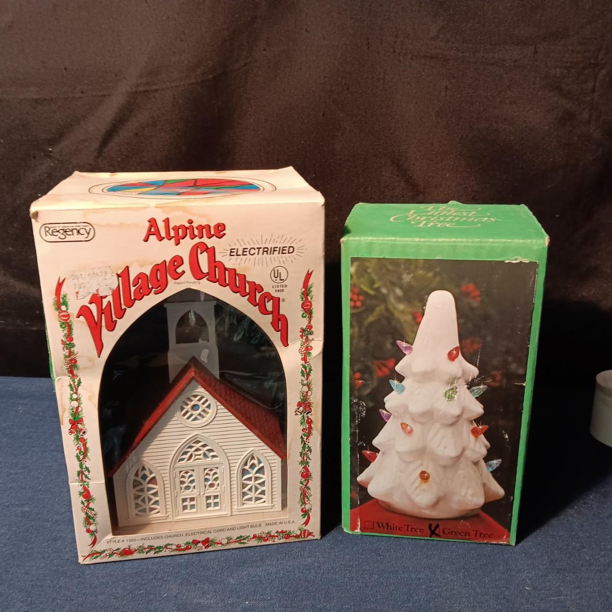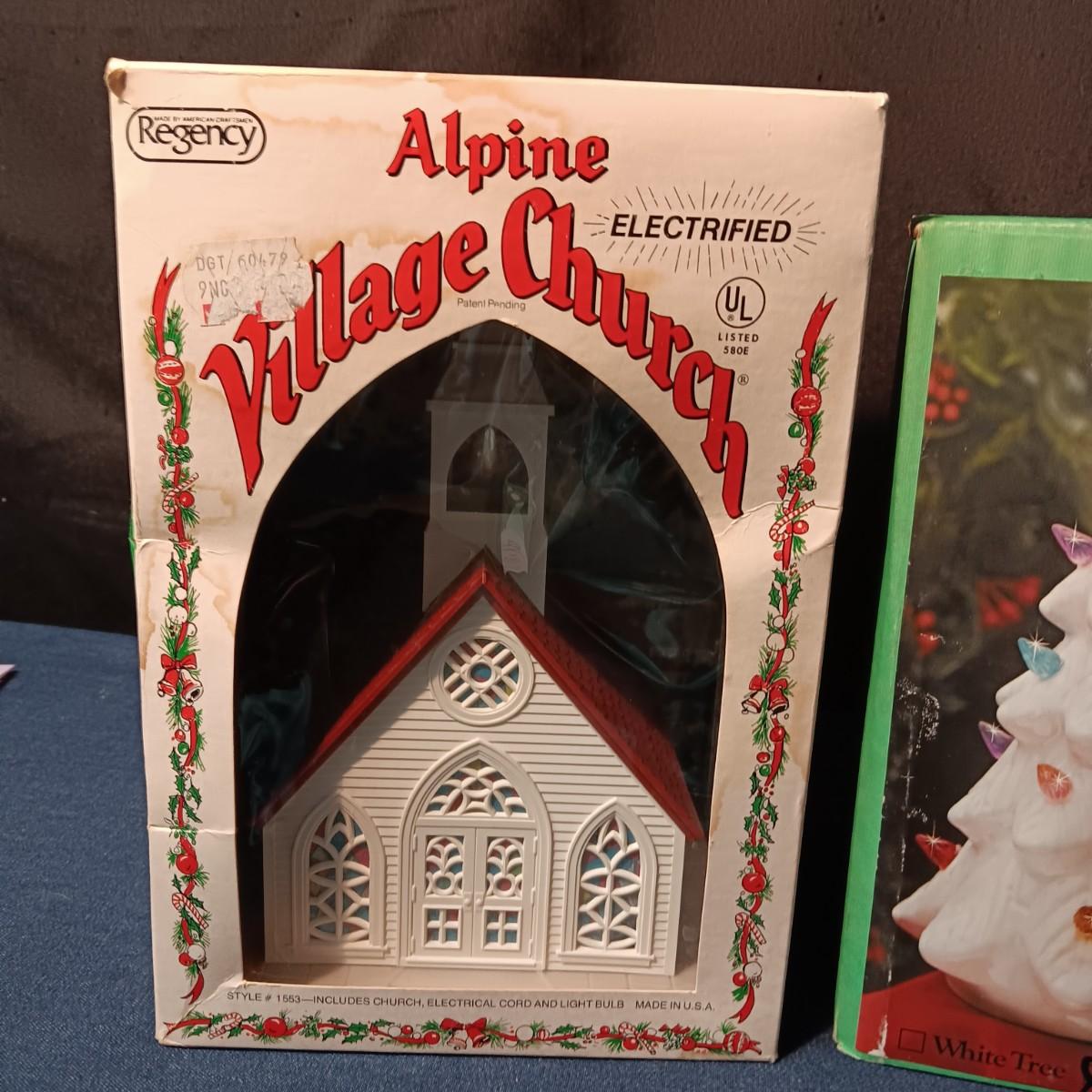 ALPINE VILLAGE LIGHTED CHURCH AND CERAMIC CHRISTMAS TREE