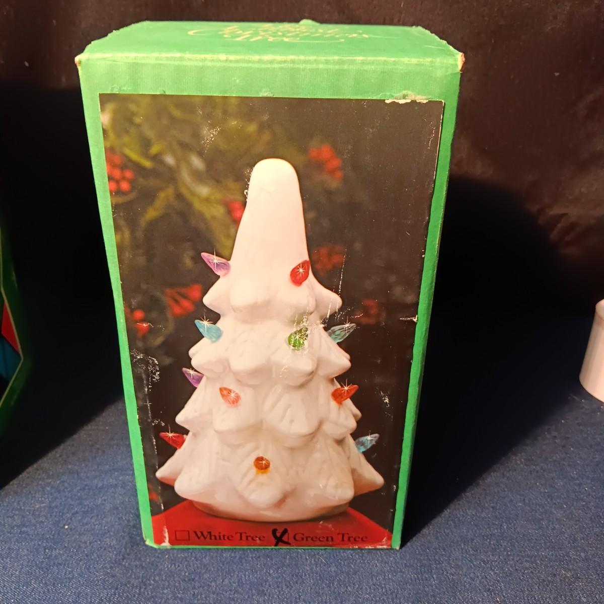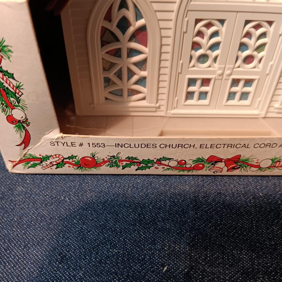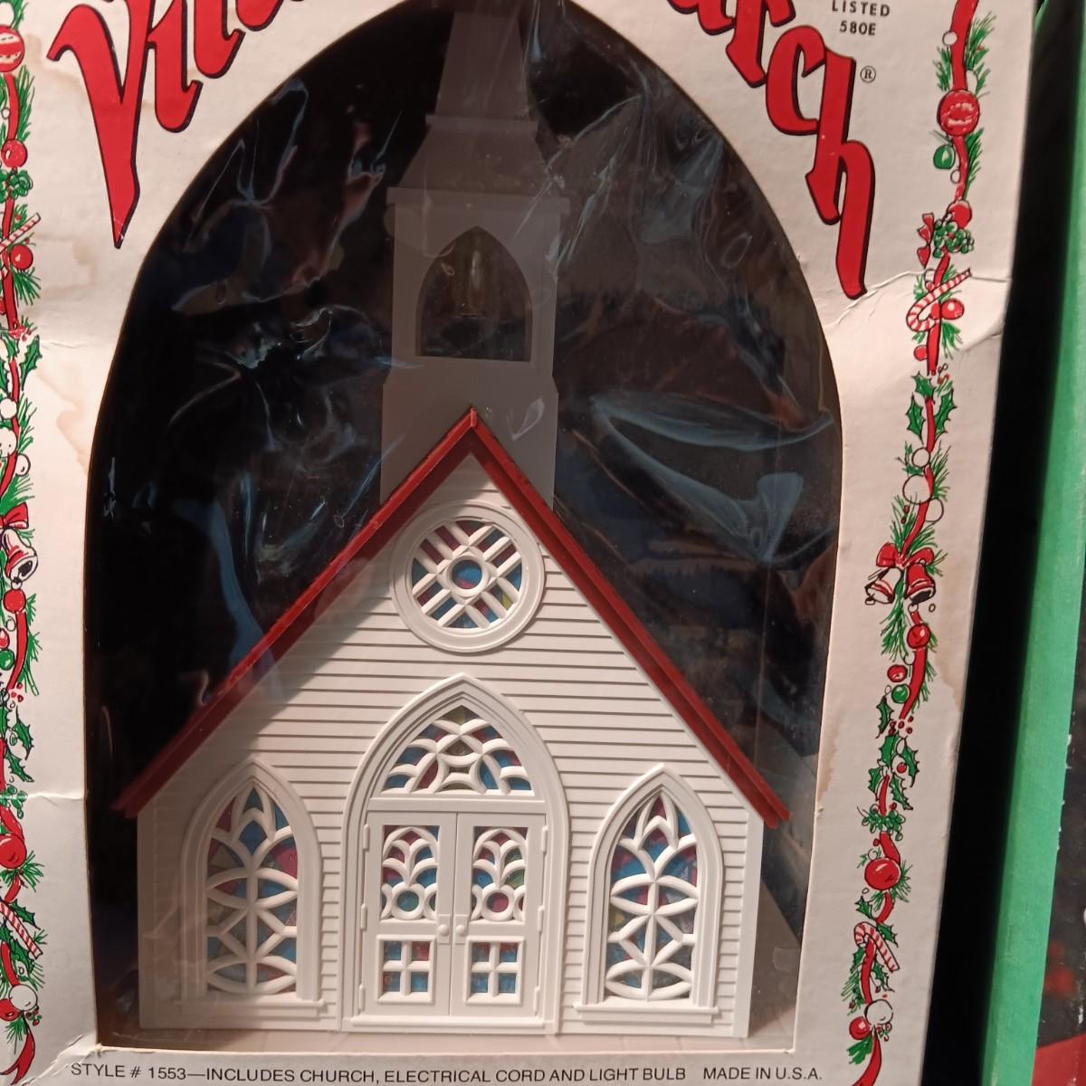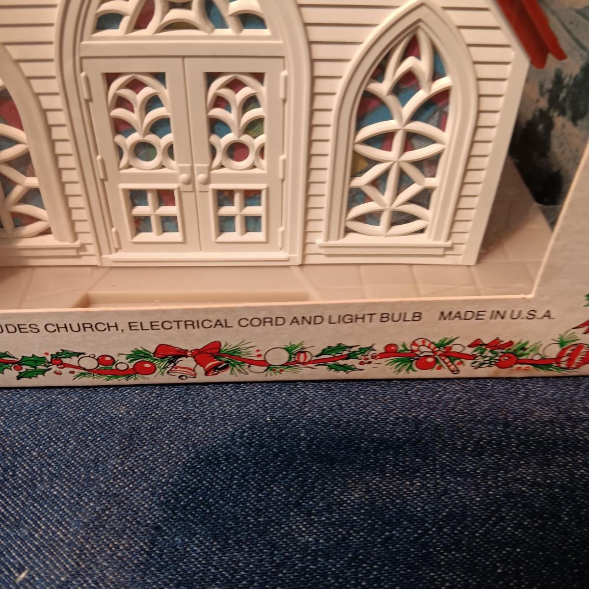 ALPINE VILLAGE LIGHTED CHURCH AND CERAMIC CHRISTMAS TREE