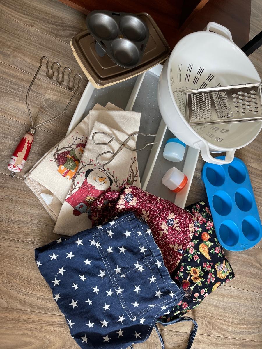 Four holiday towels, three aprons, silicone muffin dish, strainer, utensil organizer, grater etc