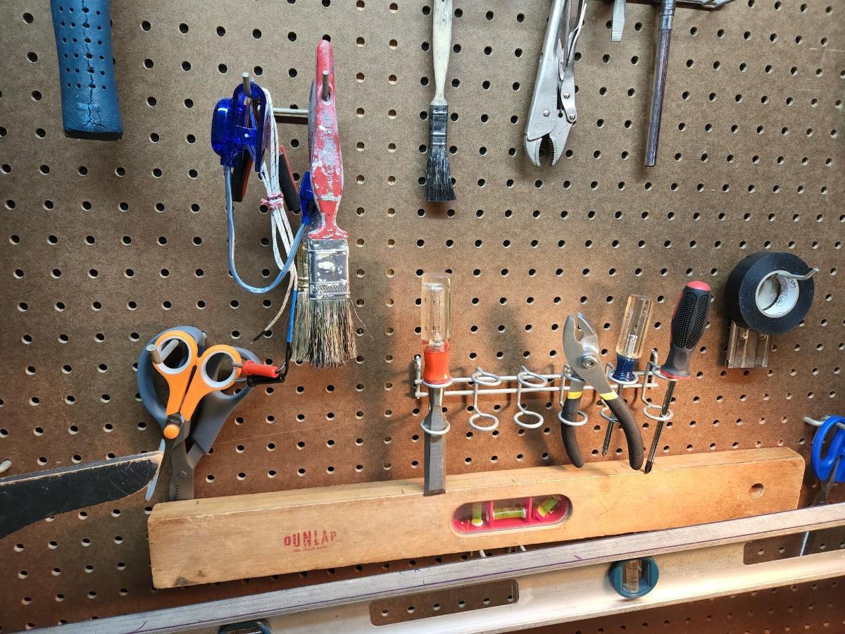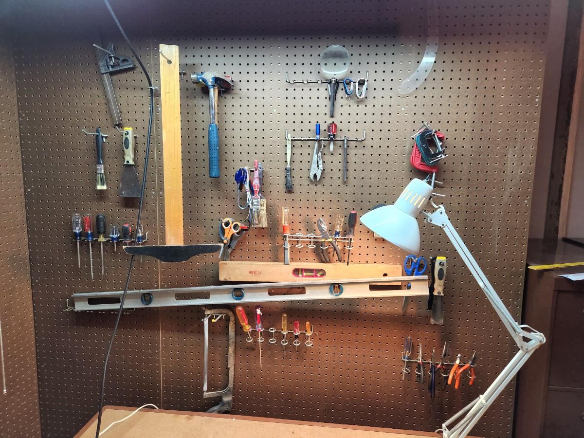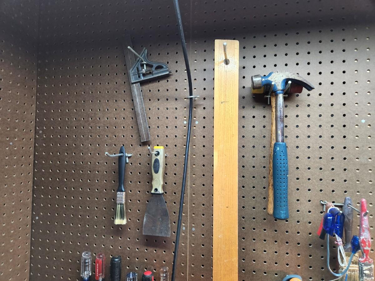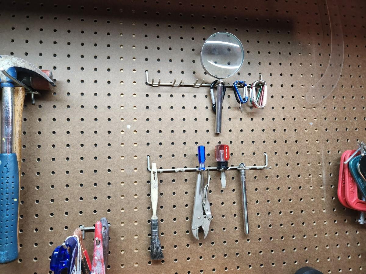 Square, Levels, Clamps, Hammer, Screw Drivers, Peg Board holders, and more.