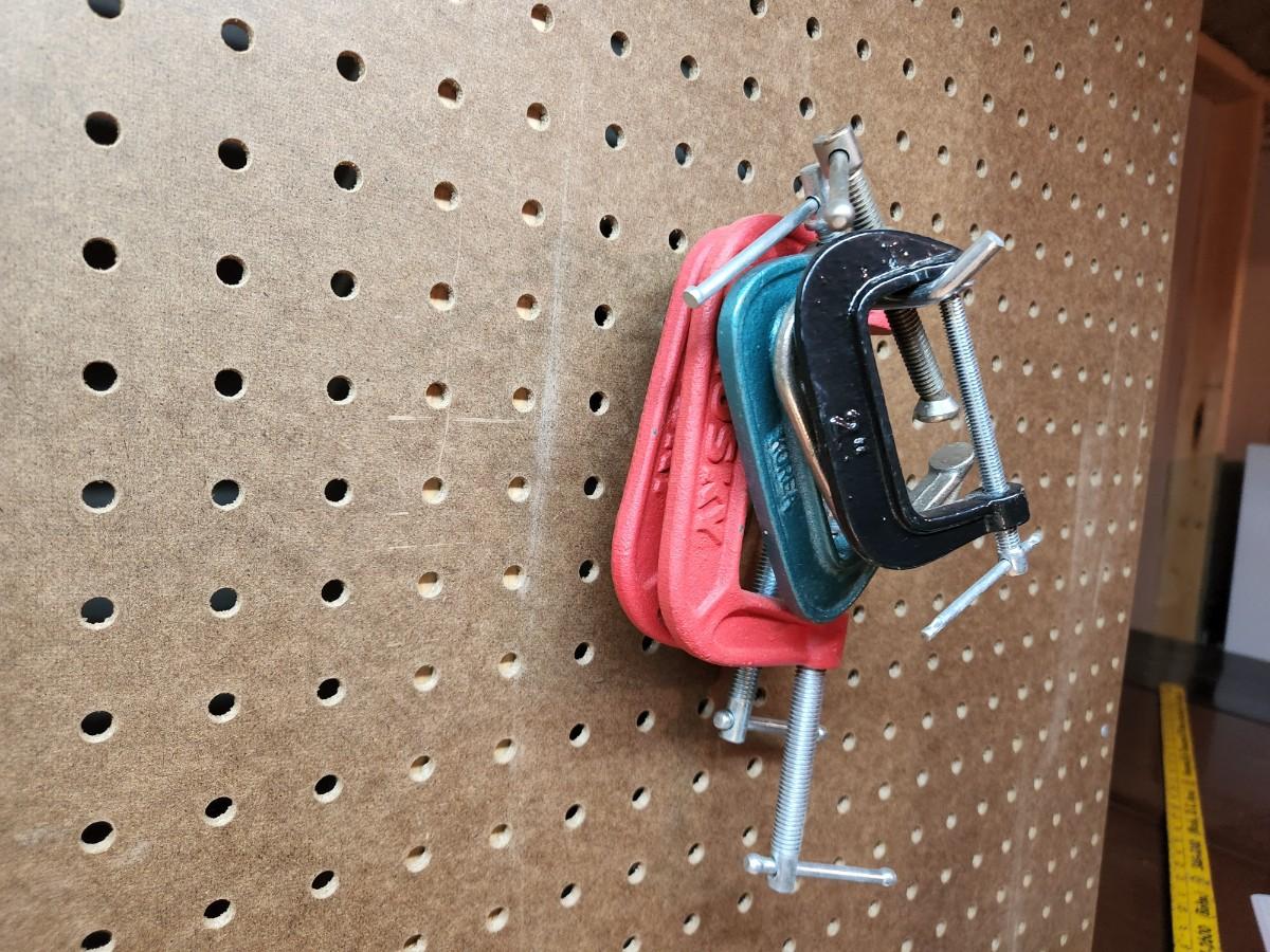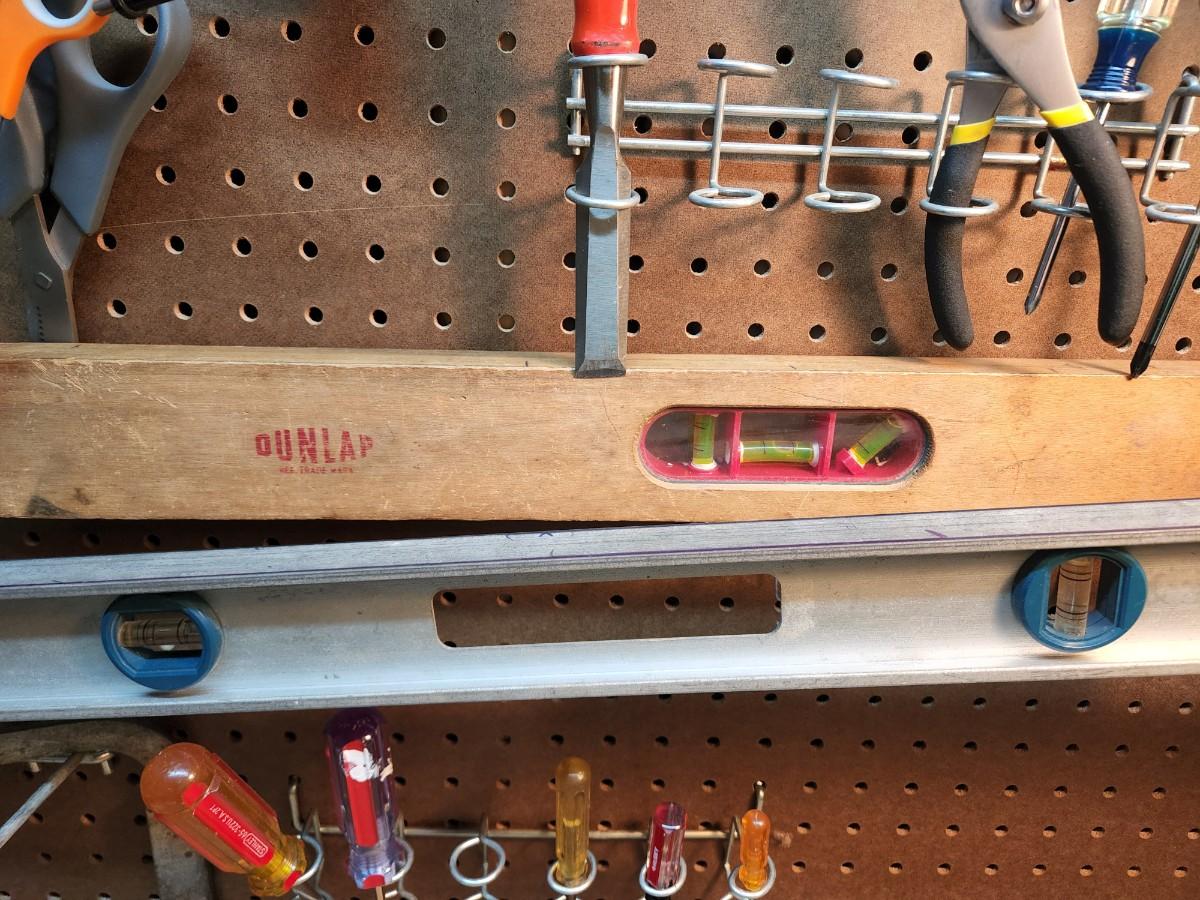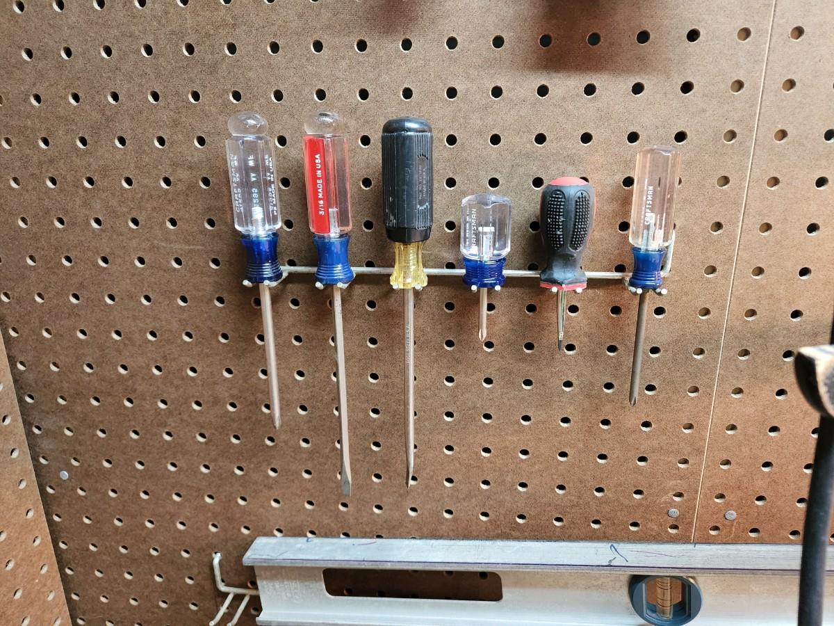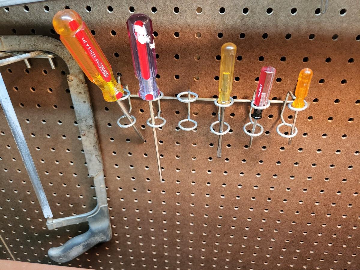 Square, Levels, Clamps, Hammer, Screw Drivers, Peg Board holders, and more.
