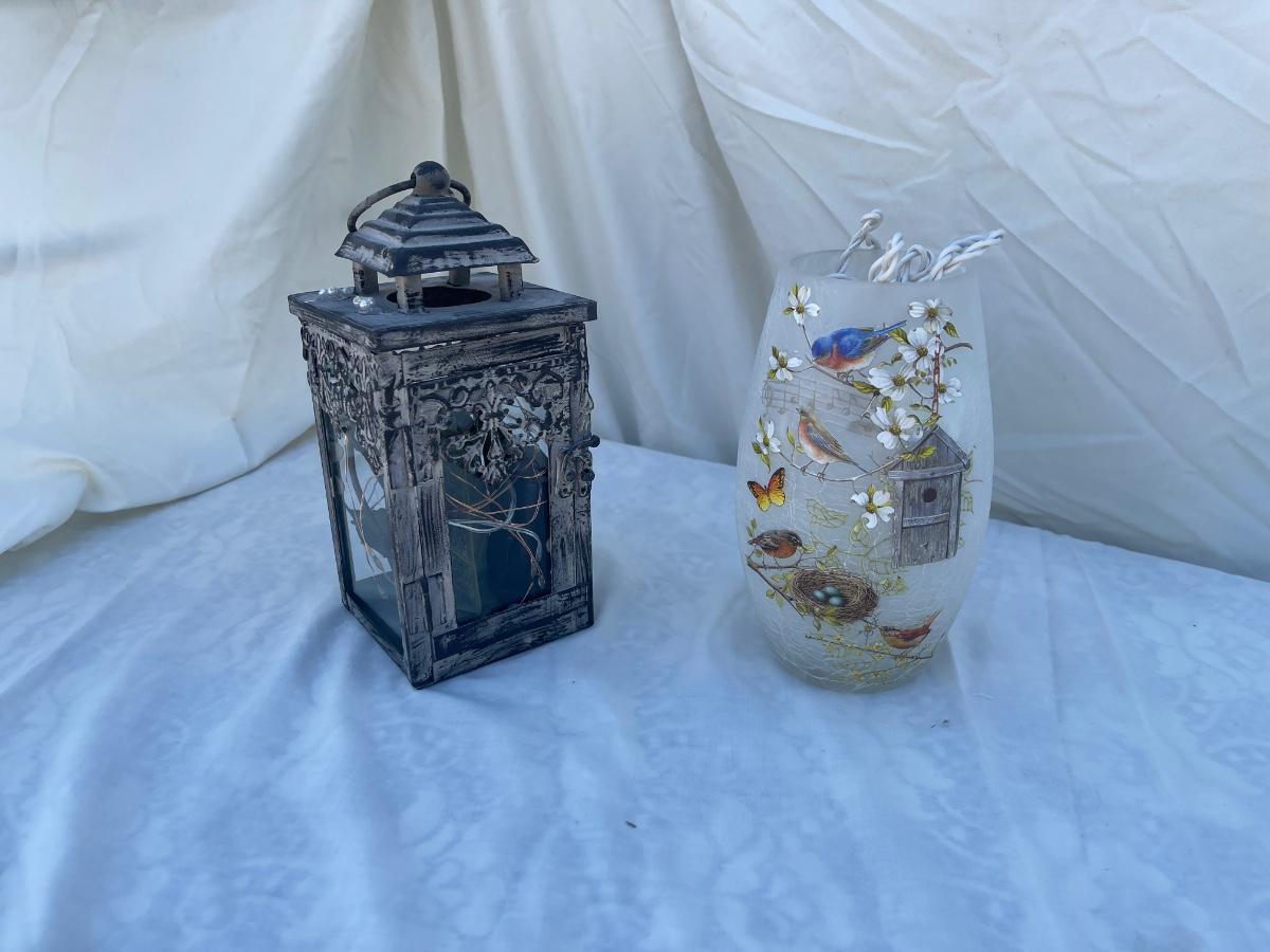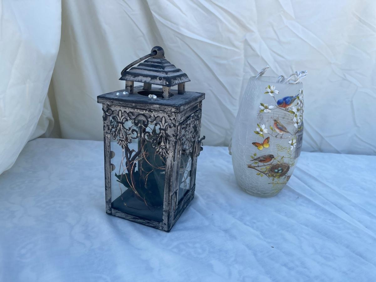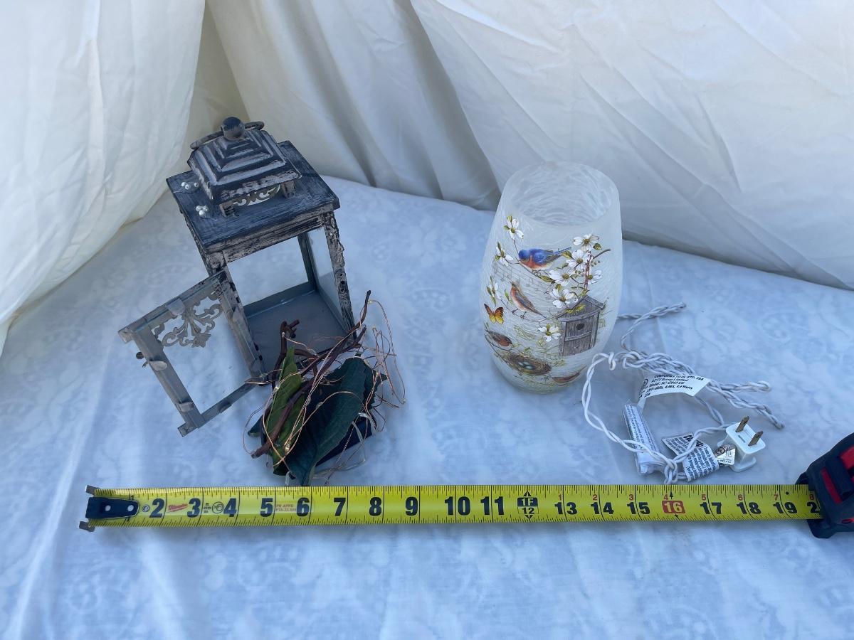 Two decorative lamps, each approximately 8" tall. Left lantern is made of metal with glass sides, has a latched door and a ring on top for hanging, and has battery operated string lights and fake foliage inside. Right lamp is a glass vase with bird graphic on outside and has string lights inside connecting to a 2-prong wall plug. Selling as a set.