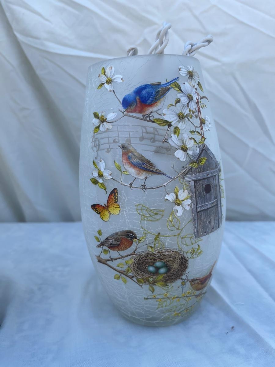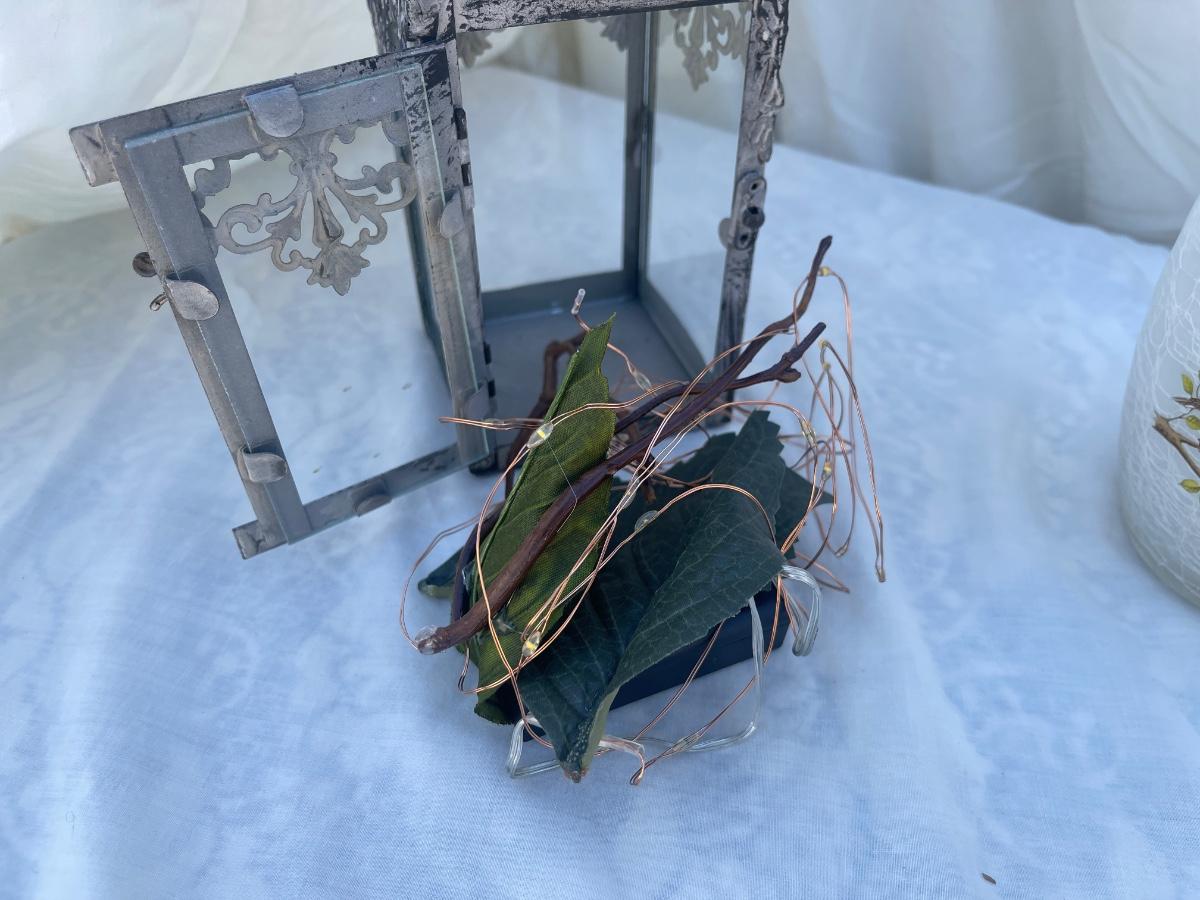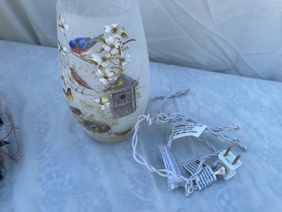 Two decorative lamps, each approximately 8" tall. Left lantern is made of metal with glass sides, has a latched door and a ring on top for hanging, and has battery operated string lights and fake foliage inside. Right lamp is a glass vase with bird graphic on outside and has string lights inside connecting to a 2-prong wall plug. Selling as a set.