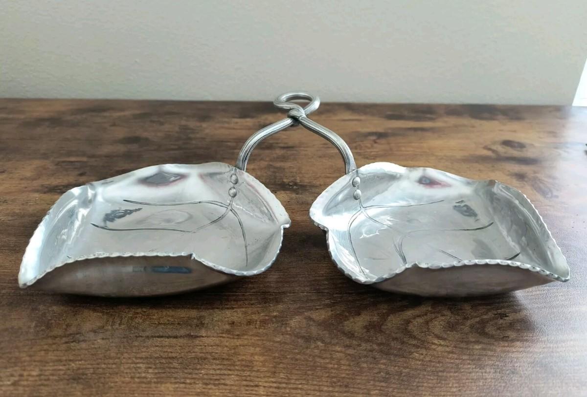 Vintage buenlinium (Buehner‑Wanner Company) hammered hand-forged aluminum double leaf candy nut dish