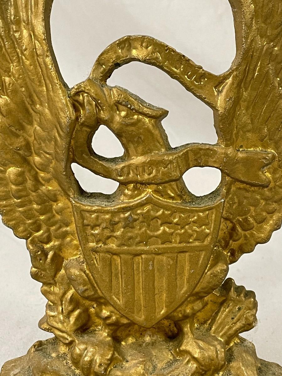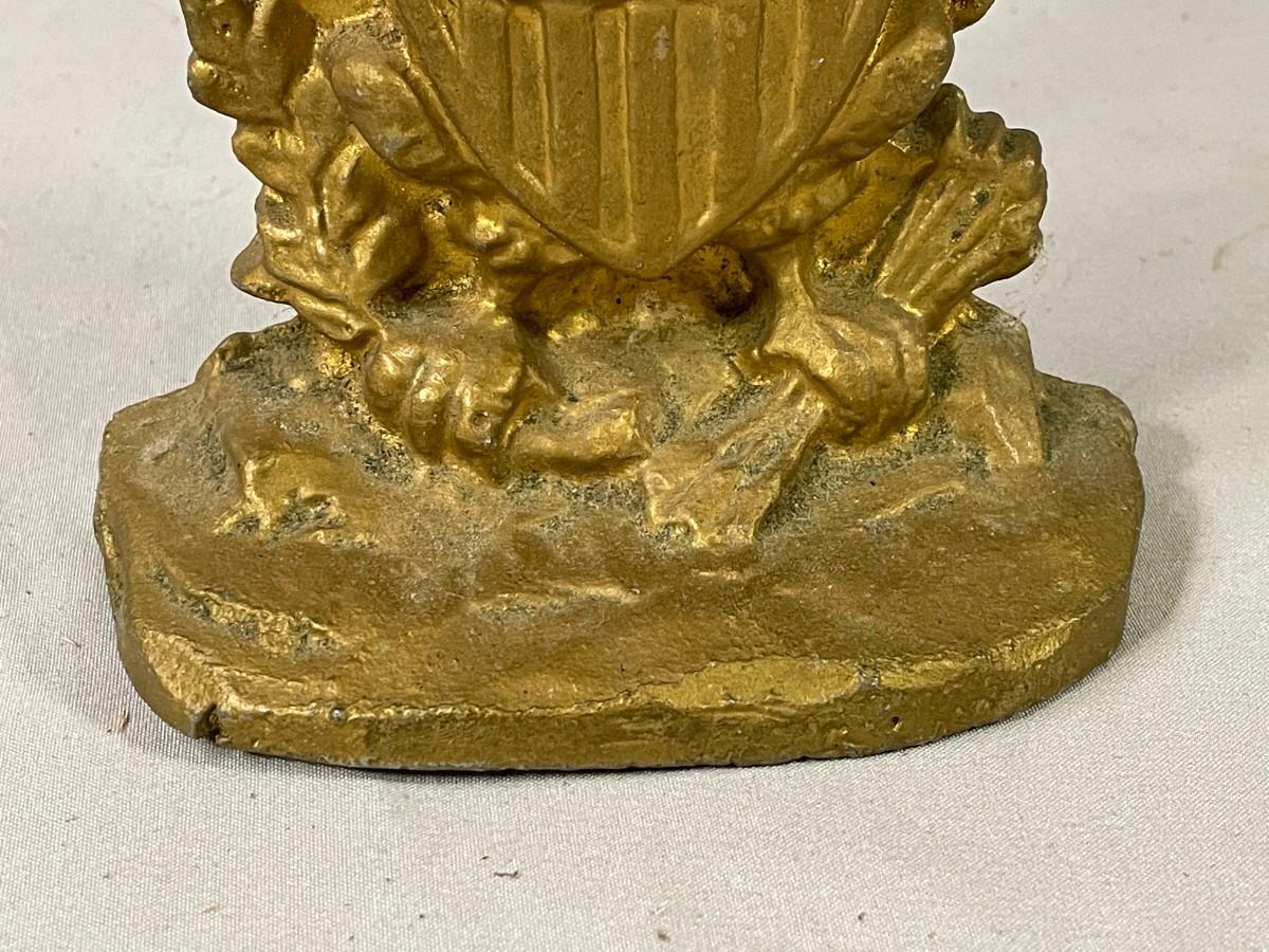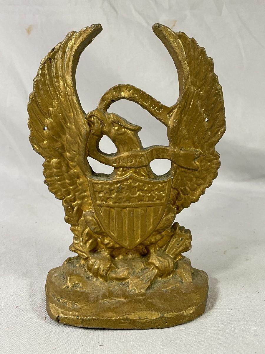 This eagle is holding a shield and a ribbon and painted gold on the front and left plain on the back. It stands about 7.25" tall and is about 5.25" wide.