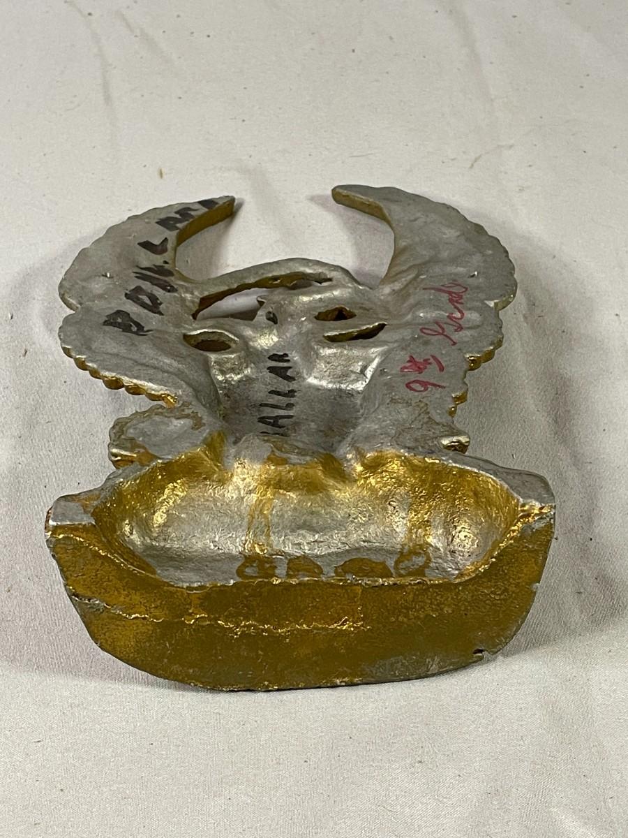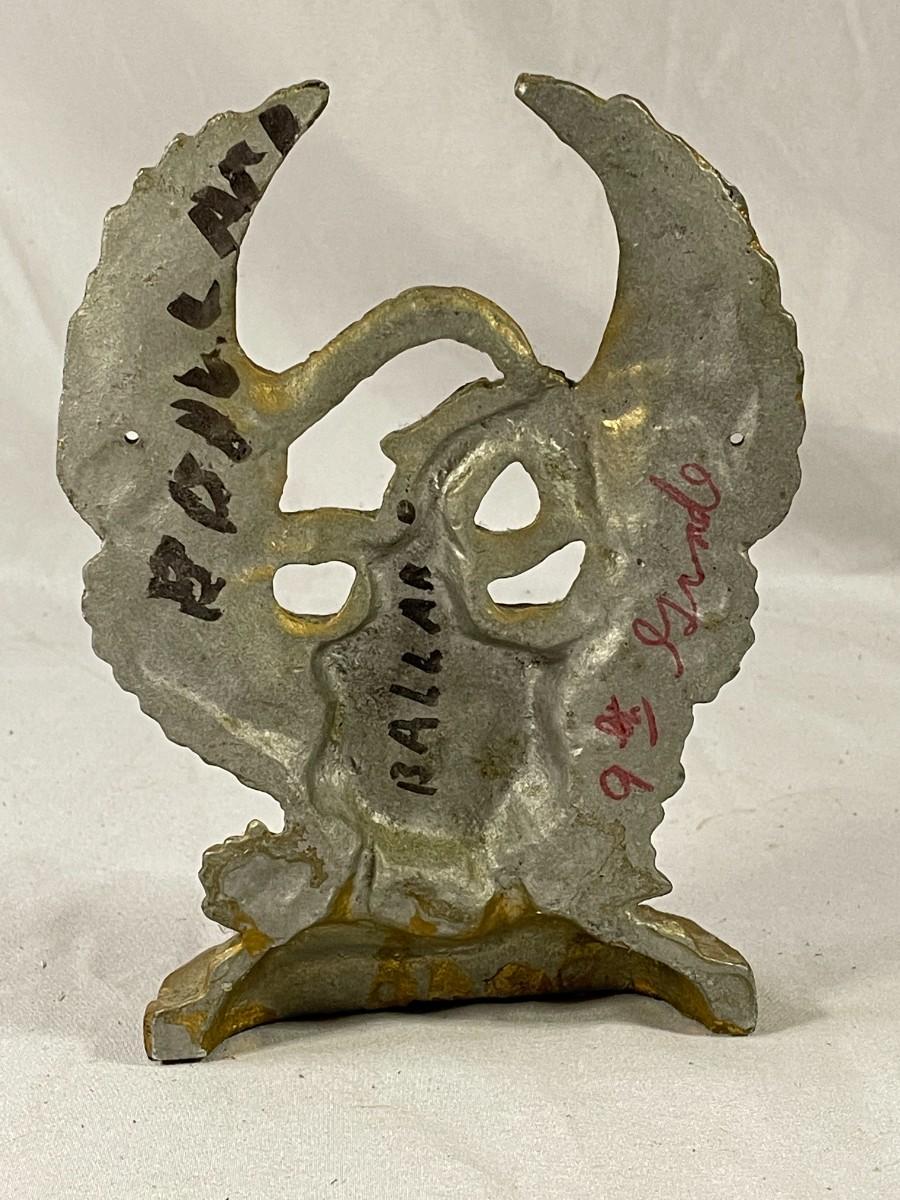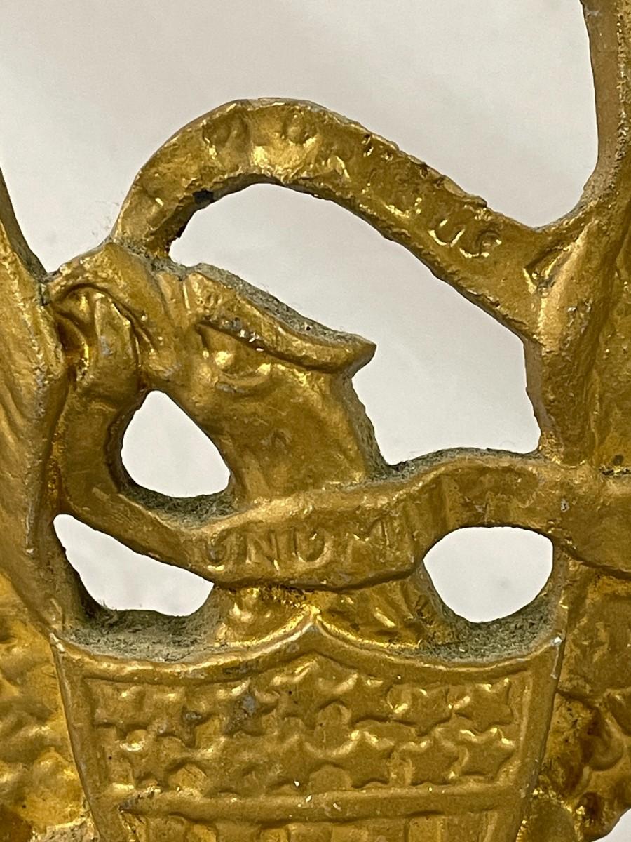 This eagle is holding a shield and a ribbon and painted gold on the front and left plain on the back. It stands about 7.25" tall and is about 5.25" wide.