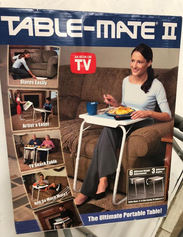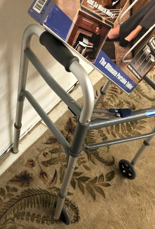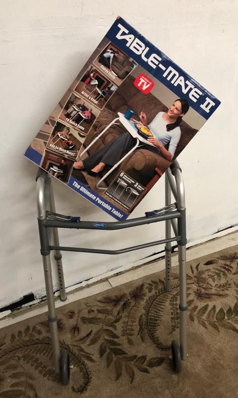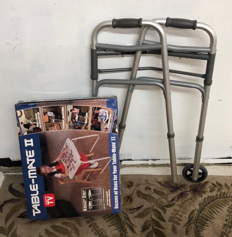 Excellent condition on this grey metal walker and a new Table-Mate II TV tray...