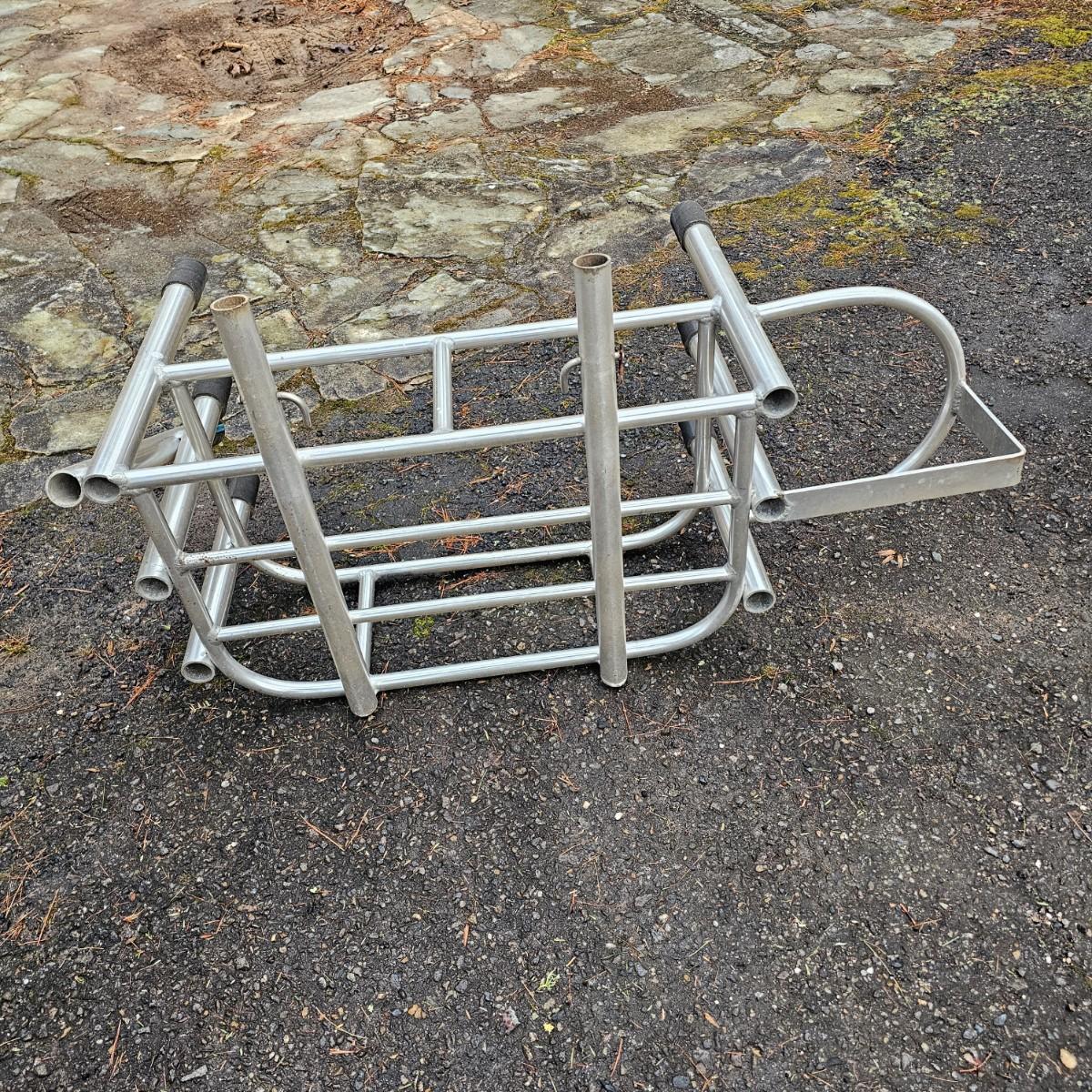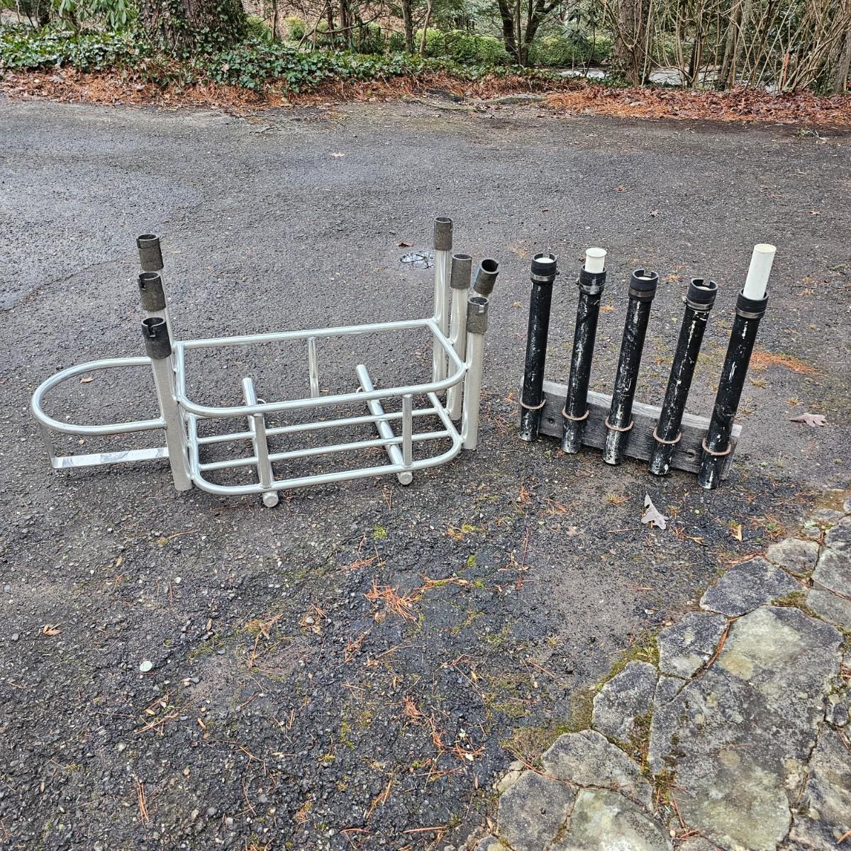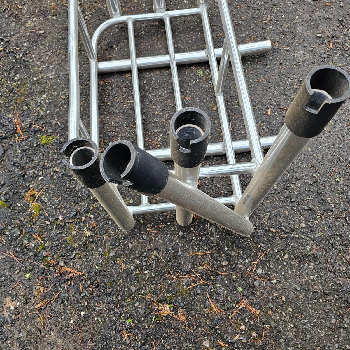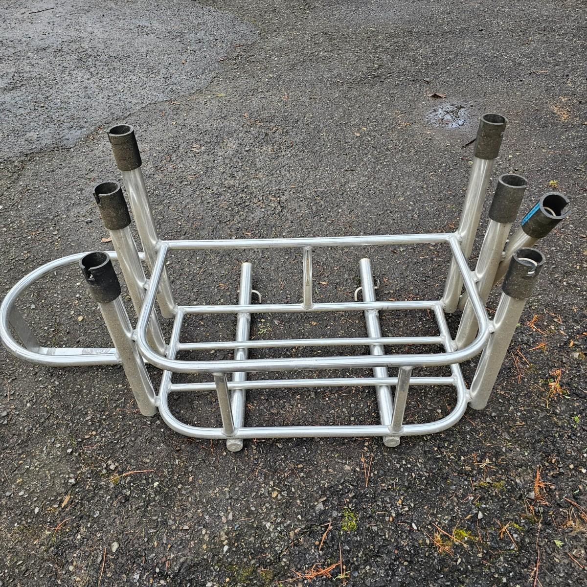 One welded aluminum rod holder that mounts onto mount on vehicle, most likely used for surf fishing. Holder has places for seven rods, a cooler and a bait bucket. Tubing diameter is approximately 1.75" for the rod openings, and 1.625" for the mounting tubes. No mounting bracket included. Unit measures 51" x 27" x 25"H, cooler opening is 16" x 30" and bait bucket area is 12"D. Also included is a homemade rod holder mounted to wood board, will hold five rods. Measures 26" x 30". See photos for details. Local pickup only.