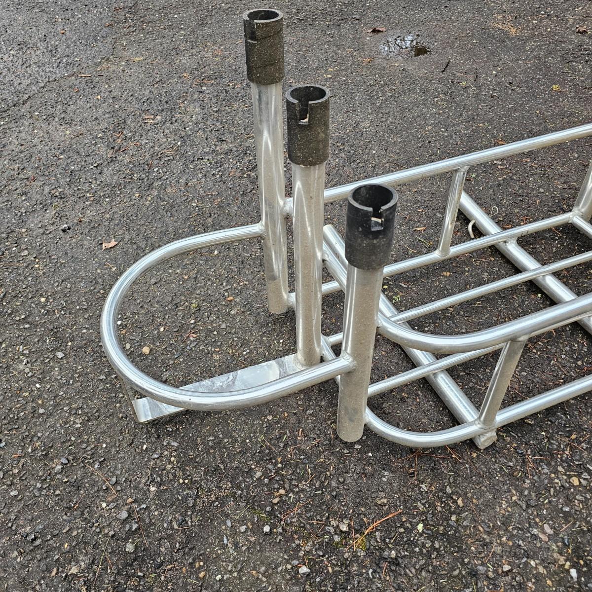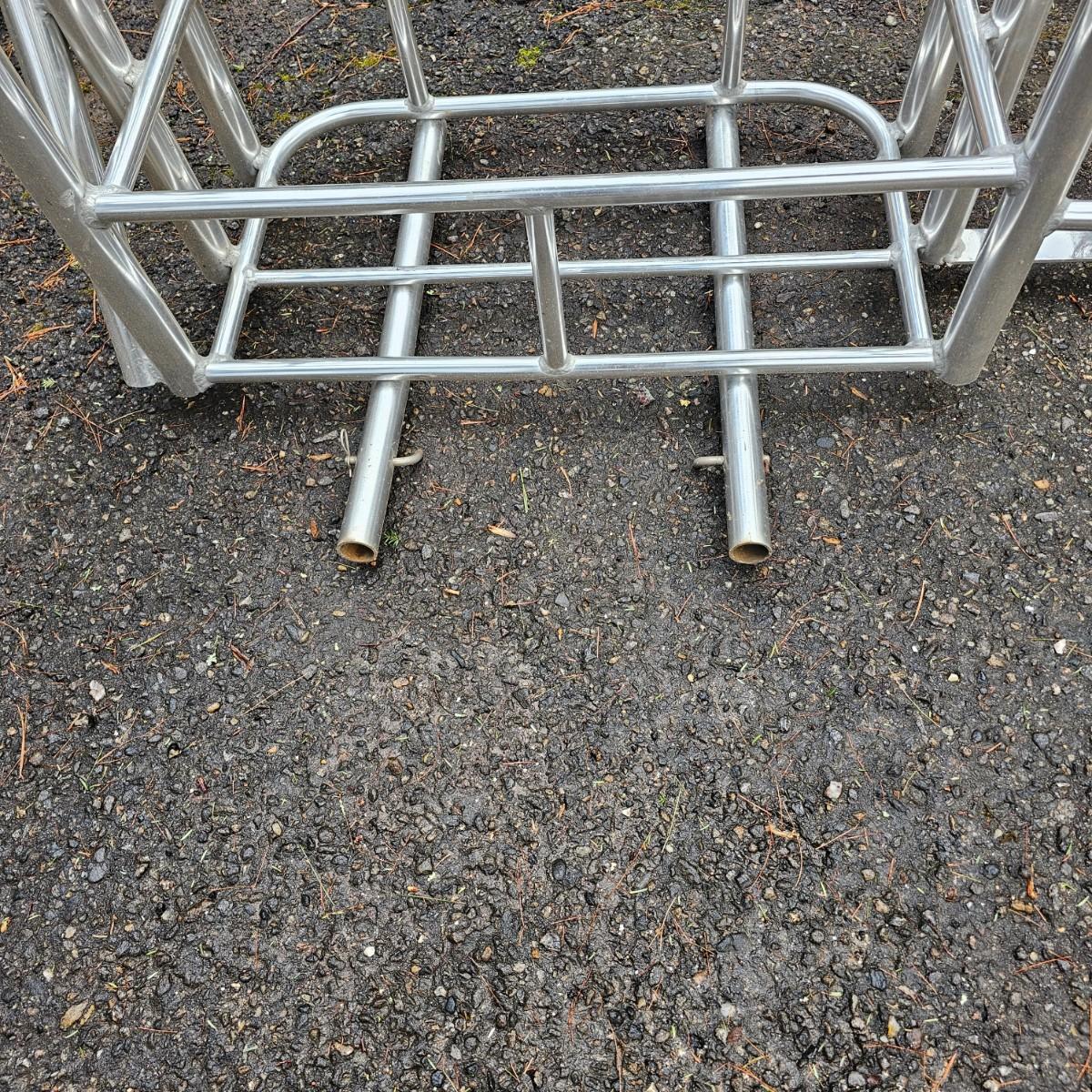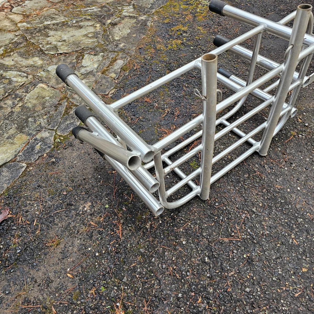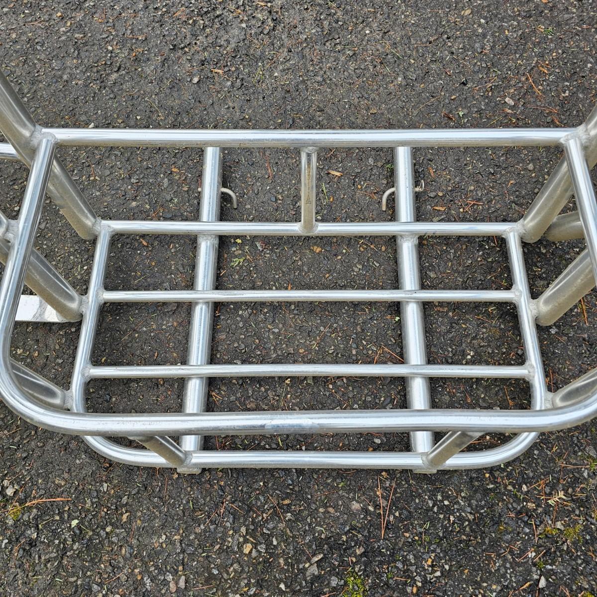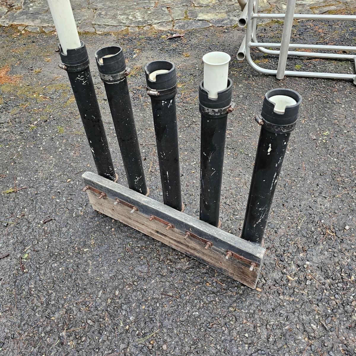 One welded aluminum rod holder that mounts onto mount on vehicle, most likely used for surf fishing. Holder has places for seven rods, a cooler and a bait bucket. Tubing diameter is approximately 1.75" for the rod openings, and 1.625" for the mounting tubes. No mounting bracket included. Unit measures 51" x 27" x 25"H, cooler opening is 16" x 30" and bait bucket area is 12"D. Also included is a homemade rod holder mounted to wood board, will hold five rods. Measures 26" x 30". See photos for details. Local pickup only.