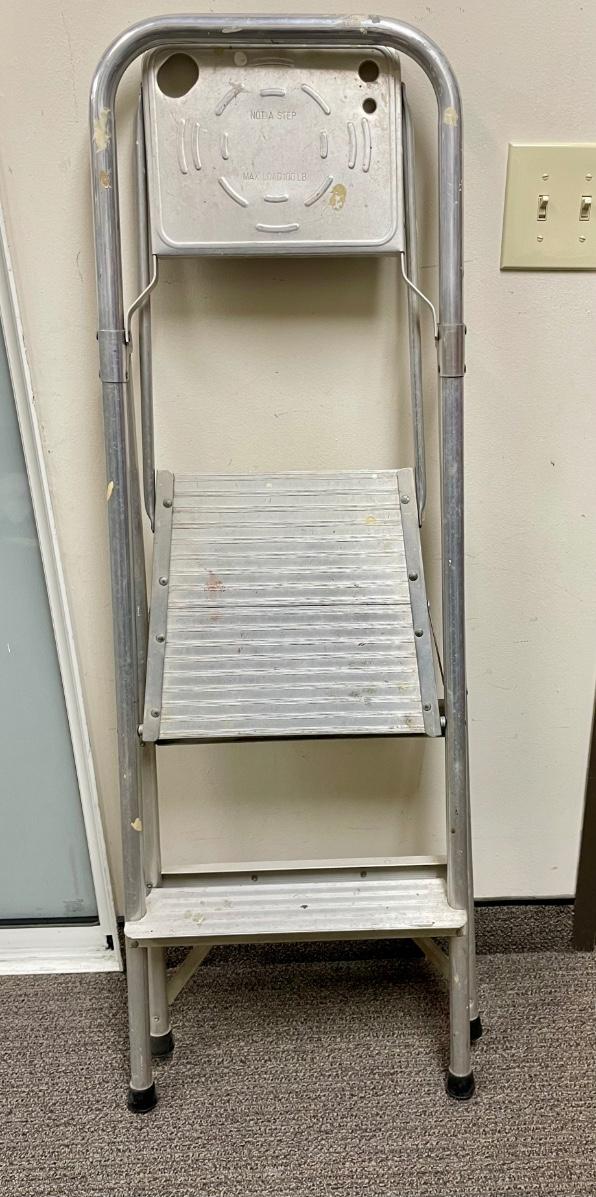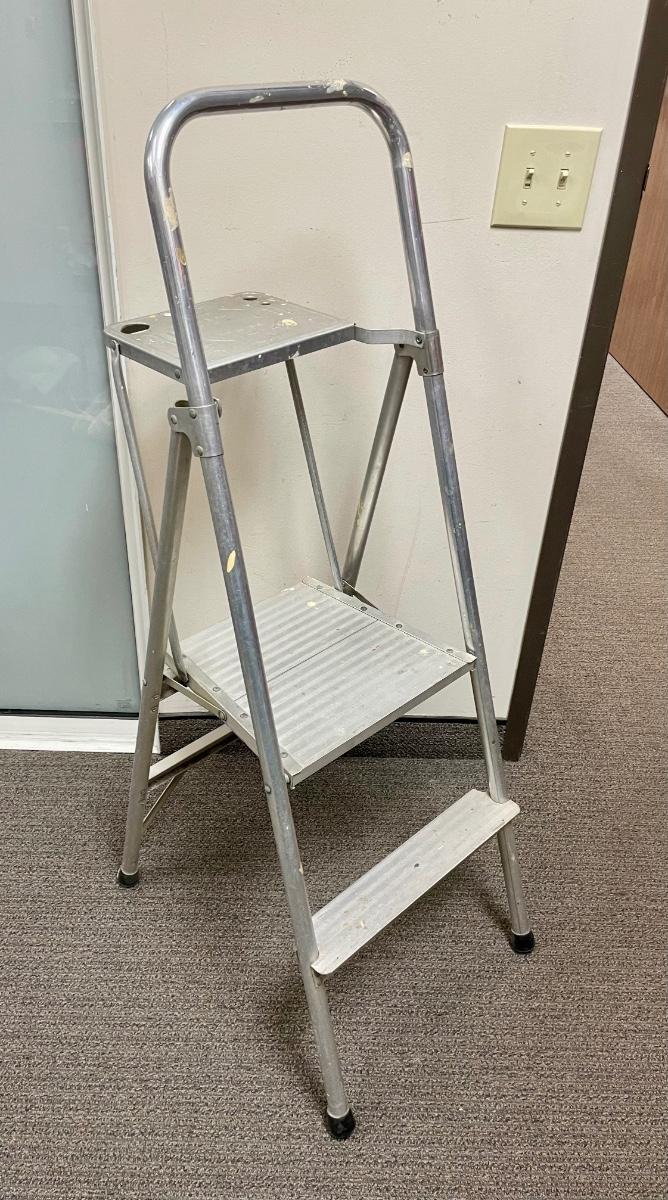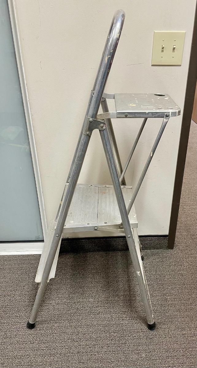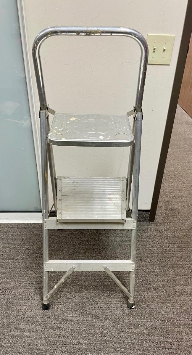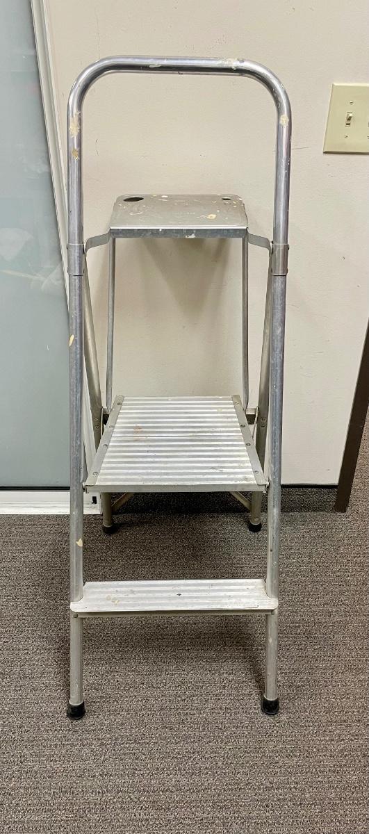2-step aluminum ladder with fold-down platform for a paint can or tools. Handhold top ring. Solid used condition.