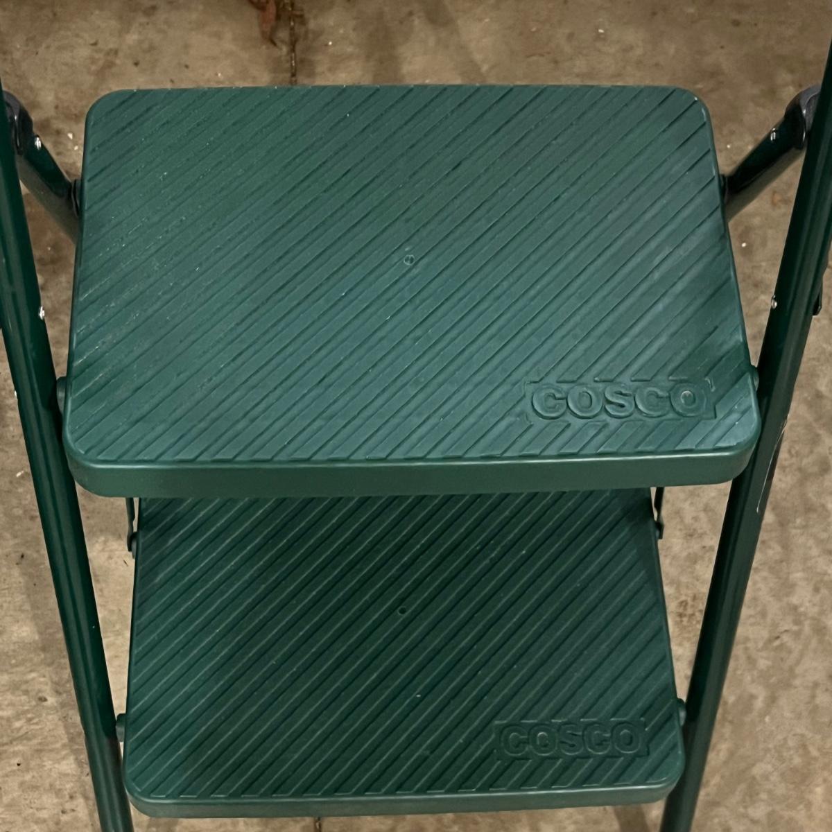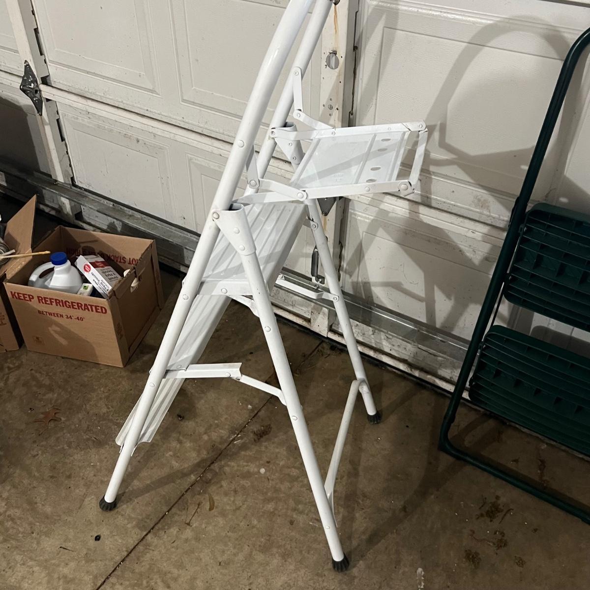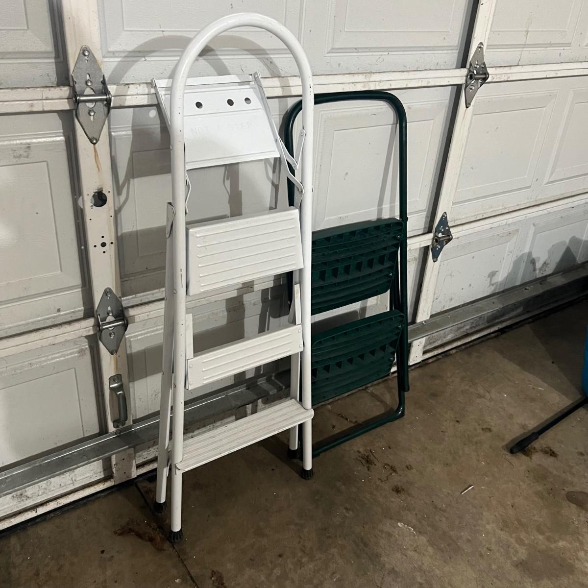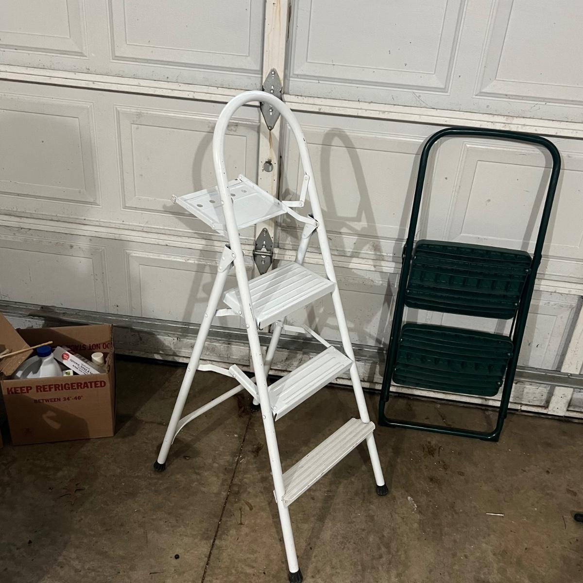 Three step ladders that all fold and includes an aluminum ladder that is 73” high (top rung is approximately 60” high), a white metal ladder and a green Costco ladder. The Costco ladder’s top step is 20” high. Aluminum ladder has paint marks but is still structurally sound.