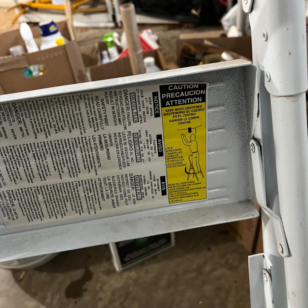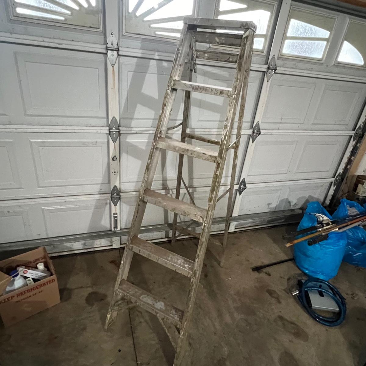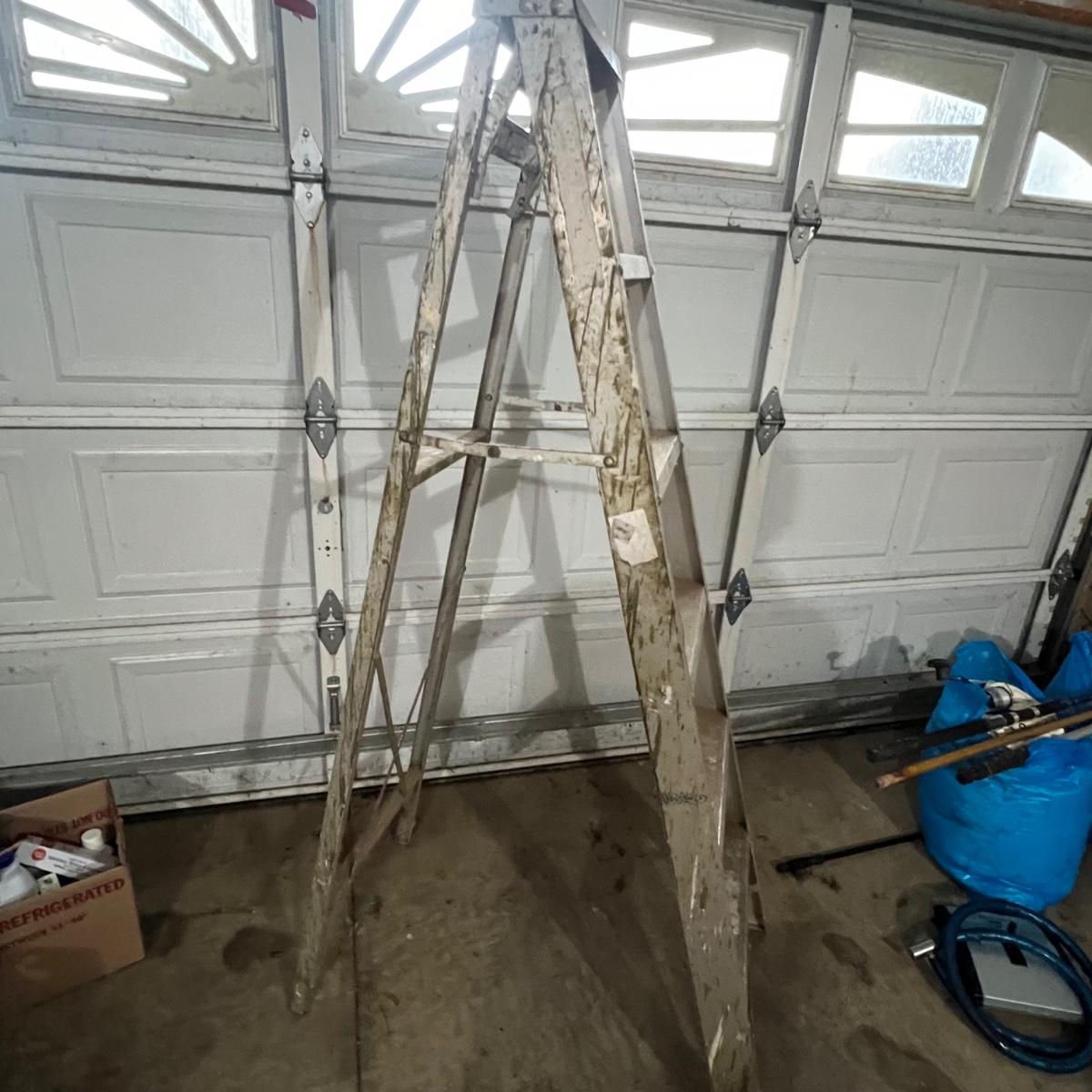 Three step ladders that all fold and includes an aluminum ladder that is 73” high (top rung is approximately 60” high), a white metal ladder and a green Costco ladder. The Costco ladder’s top step is 20” high. Aluminum ladder has paint marks but is still structurally sound.