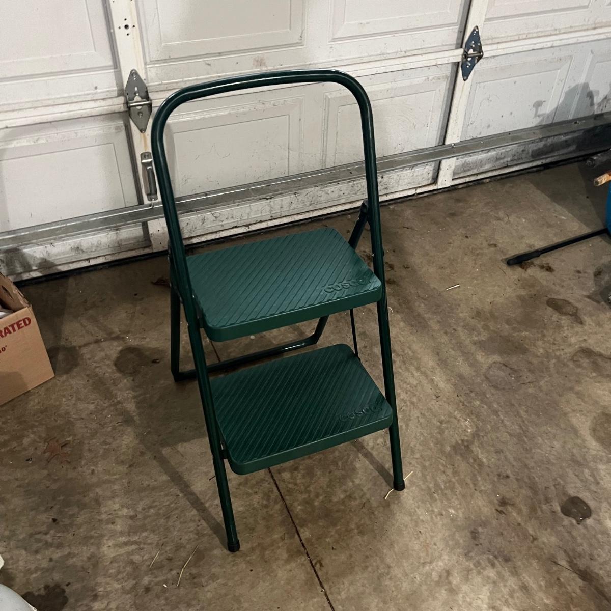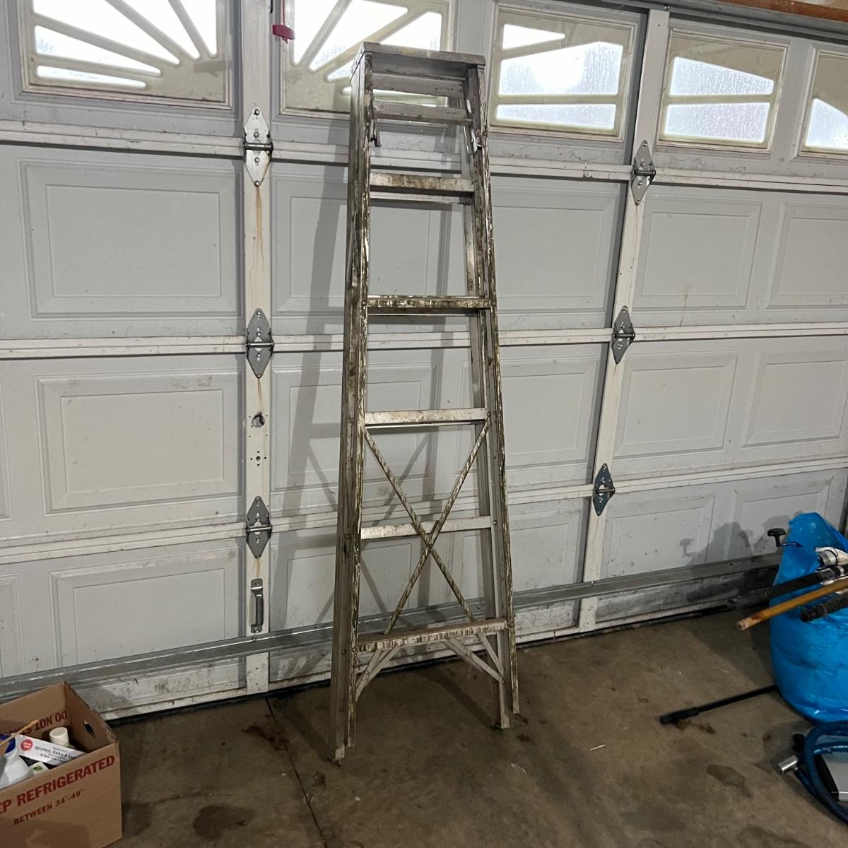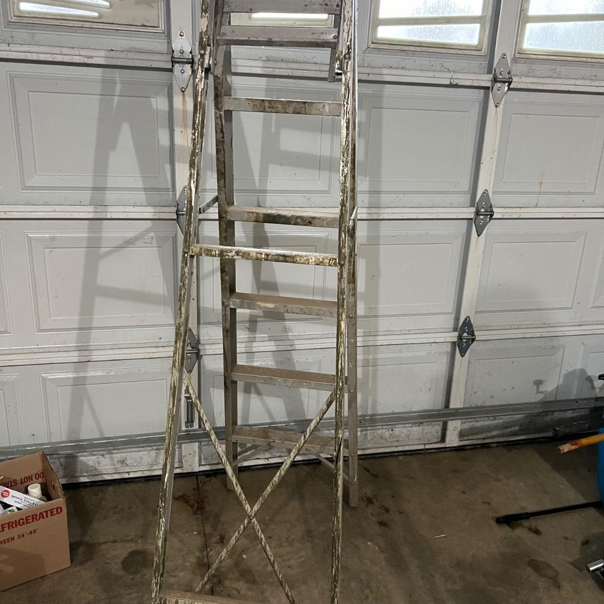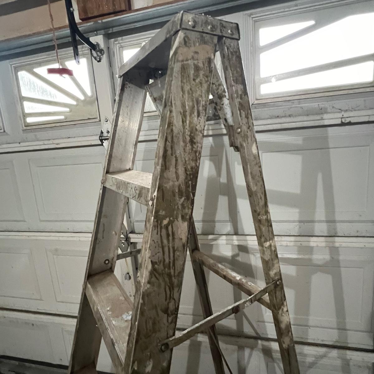 Three step ladders that all fold and includes an aluminum ladder that is 73” high (top rung is approximately 60” high), a white metal ladder and a green Costco ladder. The Costco ladder’s top step is 20” high. Aluminum ladder has paint marks but is still structurally sound.