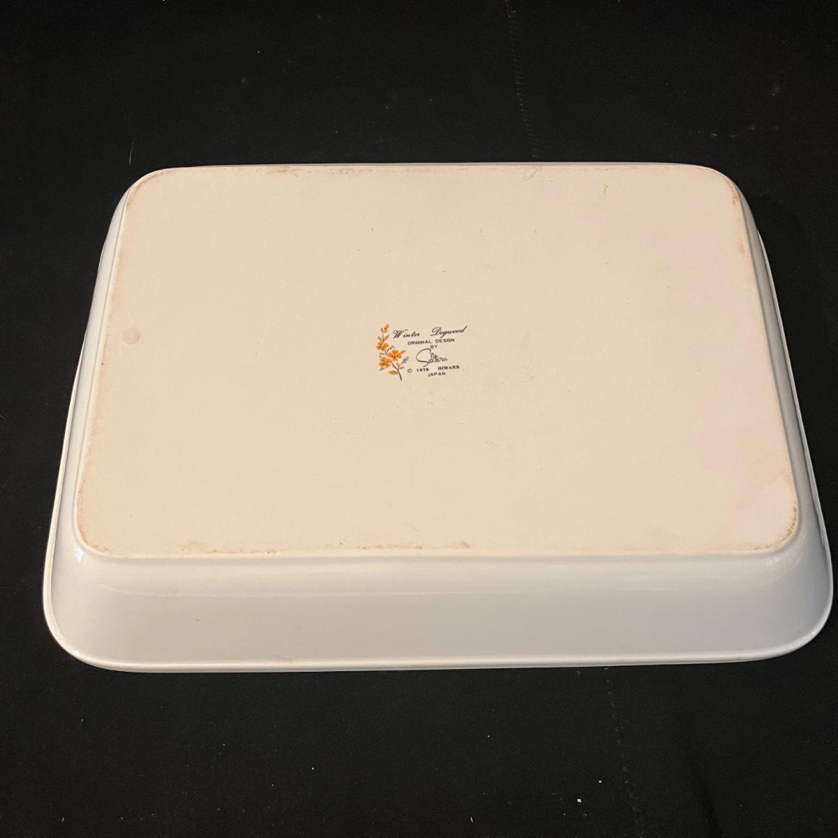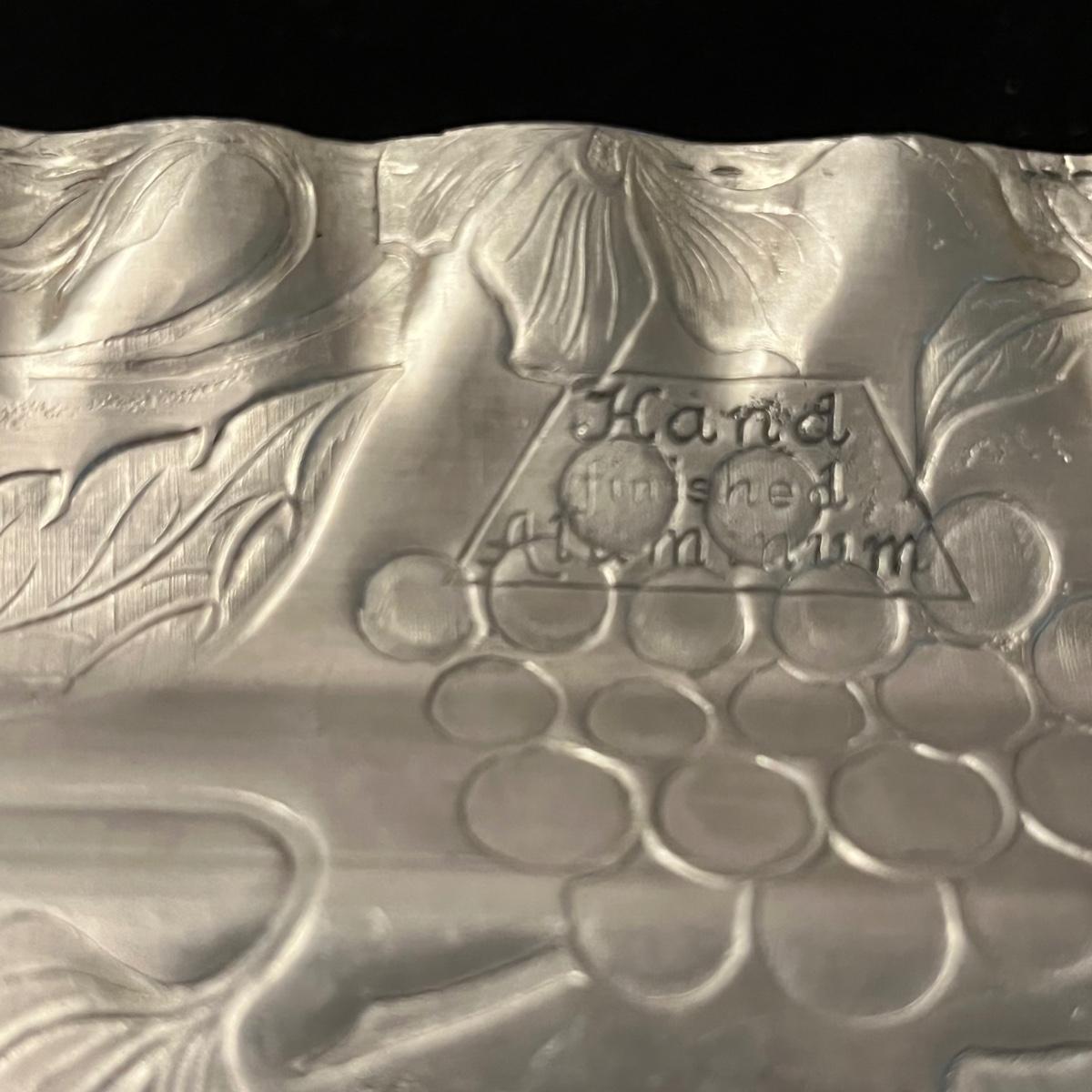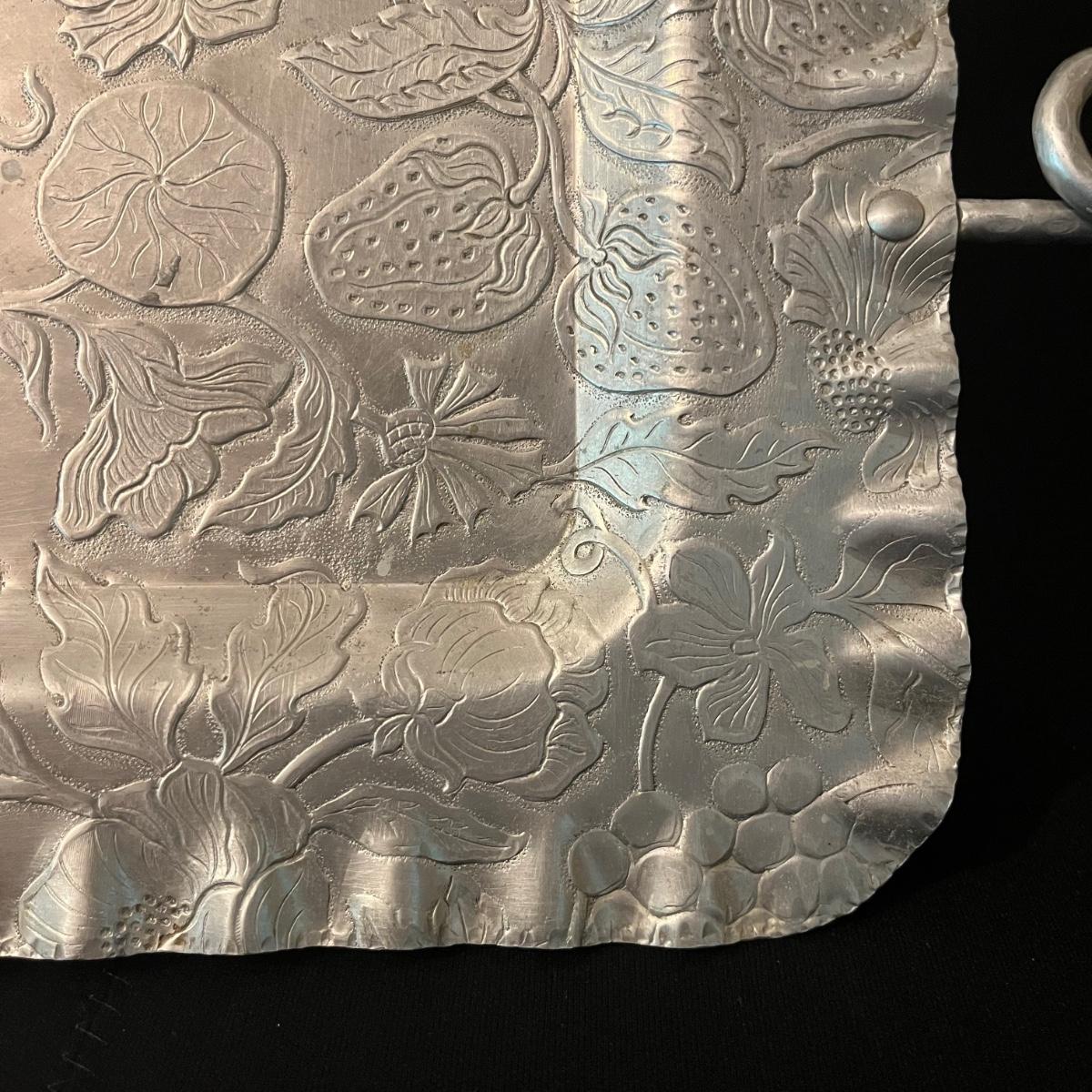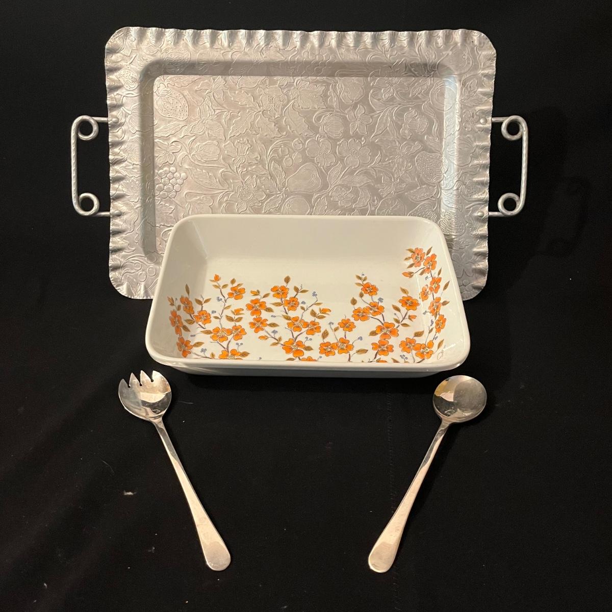 Lot includes a hand finished aluminum tray that measures 13” x 21” x 1”. Also includes a ceramic Salters Japanese dish in the Winter Dogwood pattern and two silver plated serving utensils.