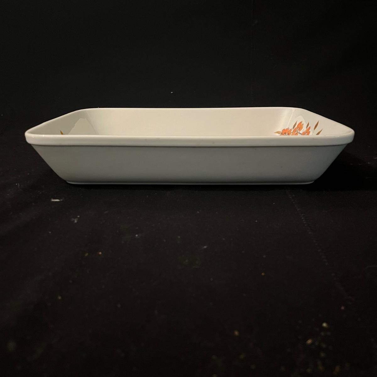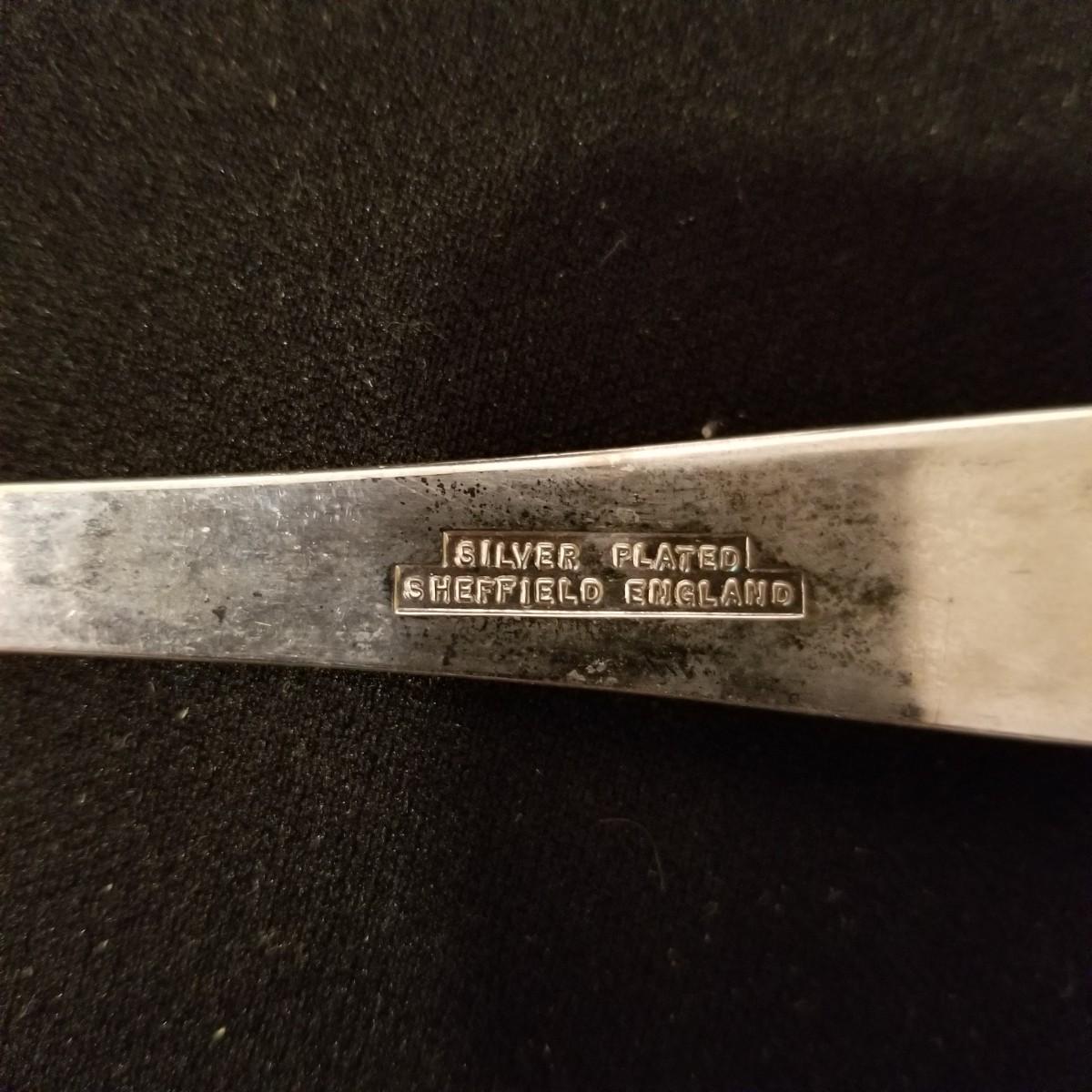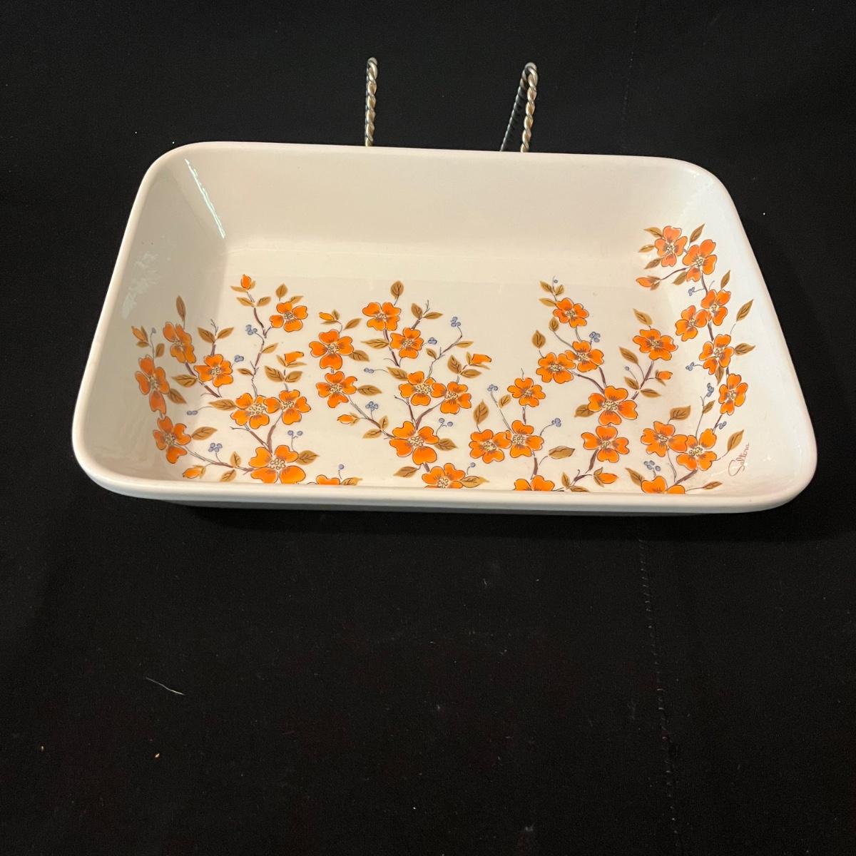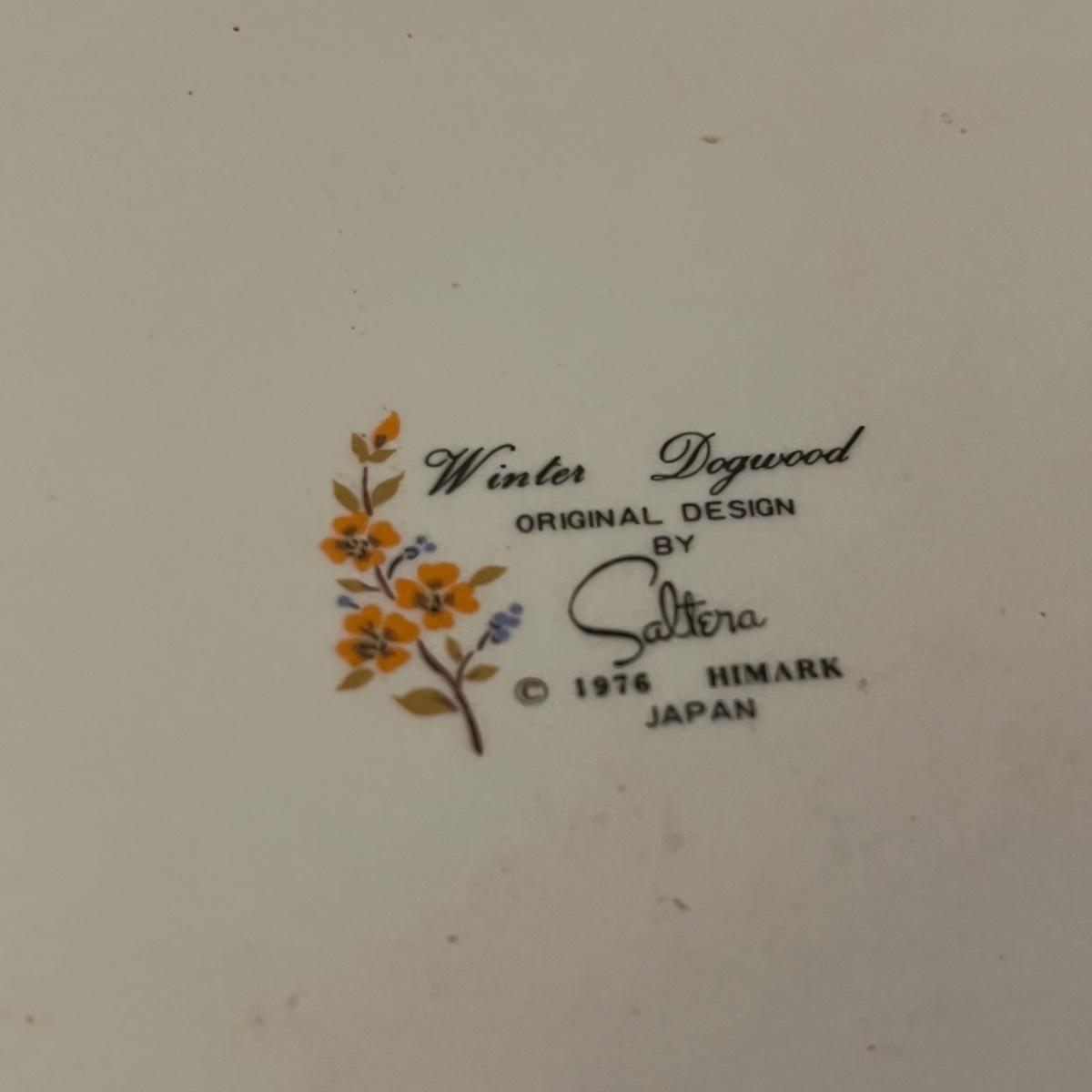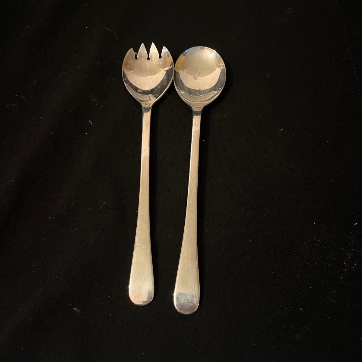 Lot includes a hand finished aluminum tray that measures 13” x 21” x 1”. Also includes a ceramic Salters Japanese dish in the Winter Dogwood pattern and two silver plated serving utensils.