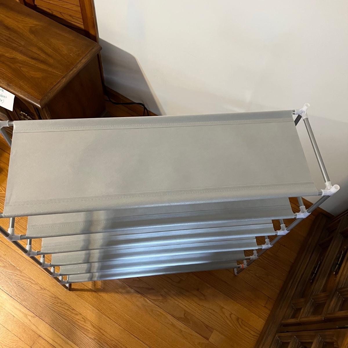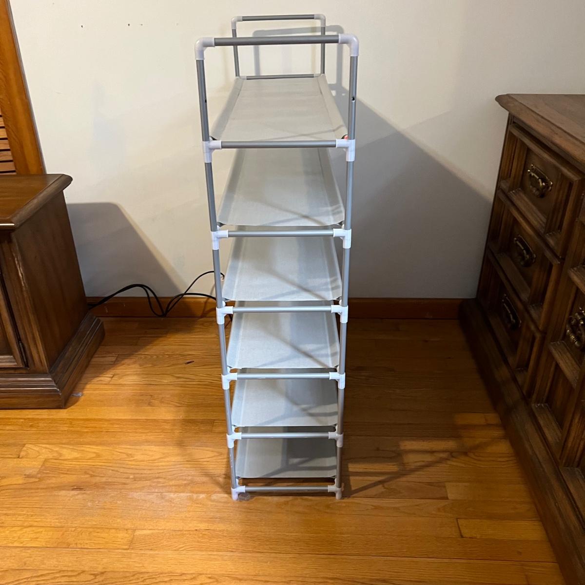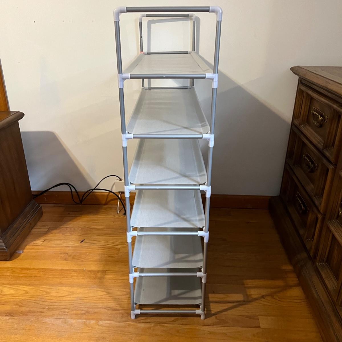 Lightweight aluminum and vinyl shelf. Seems to be ideal for storing shoes in a closet. The shelves themselves are sewn vinyl fabric and the material is hollow tubing made of aluminum. It is very lightweight. Item measures 34” x 11” x 42"H.