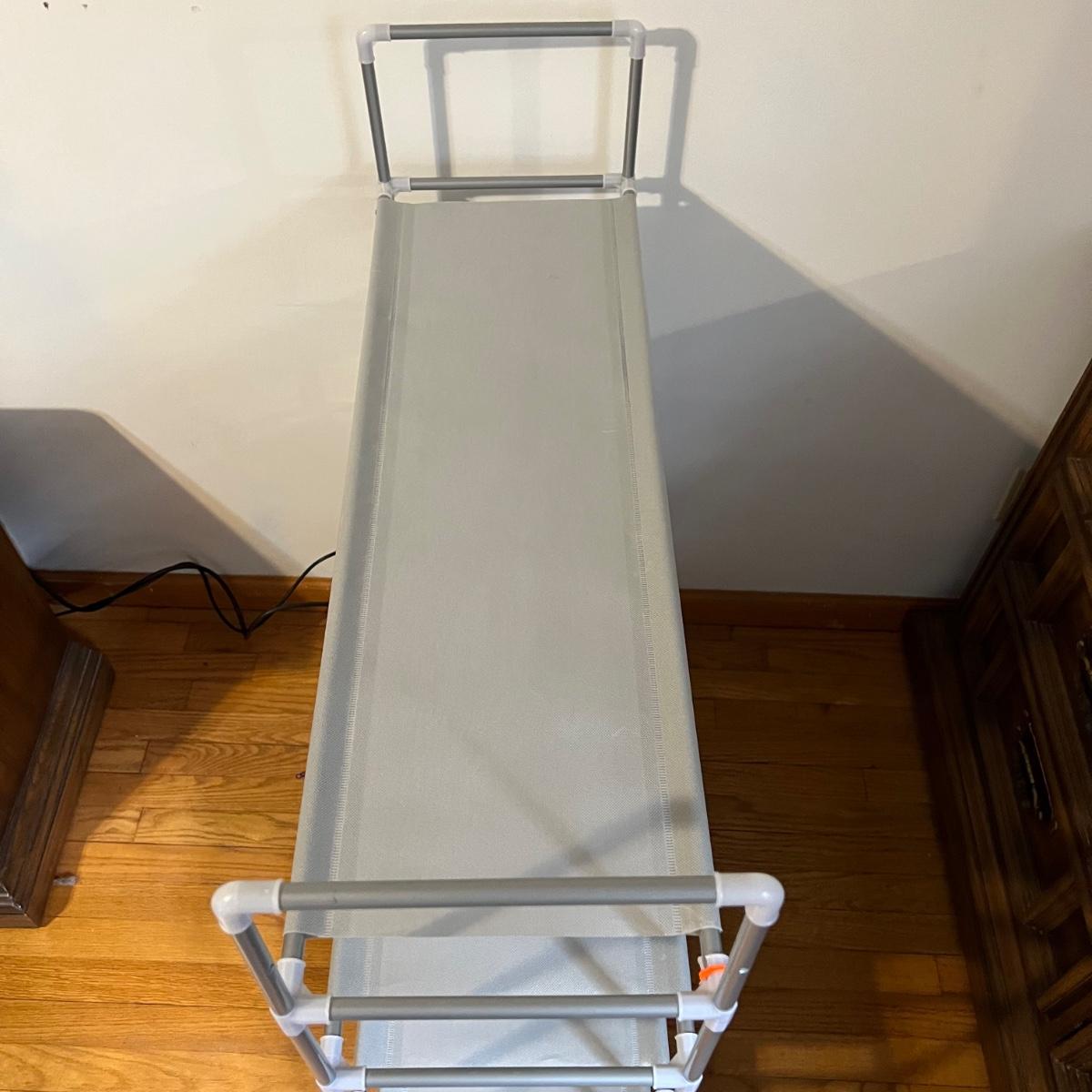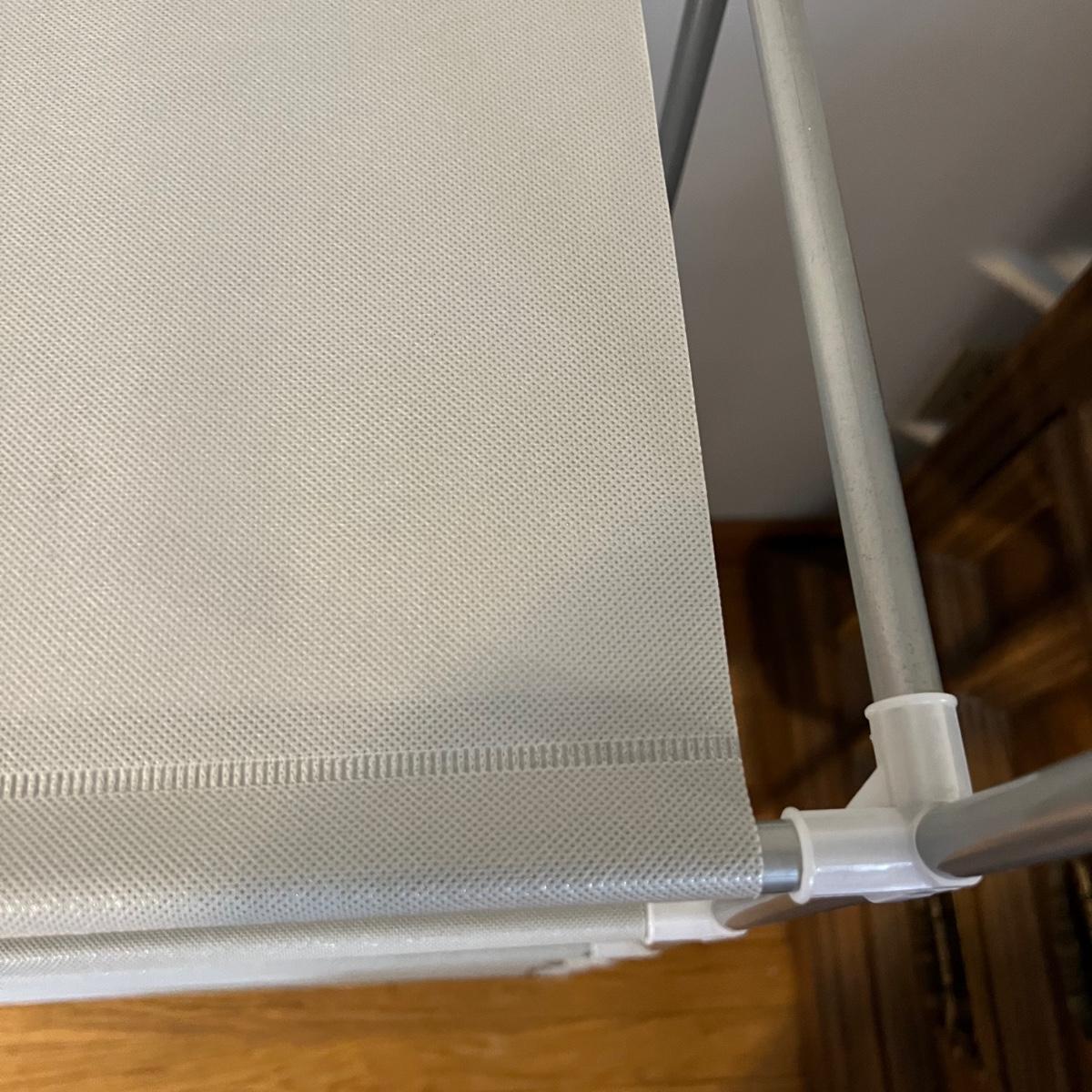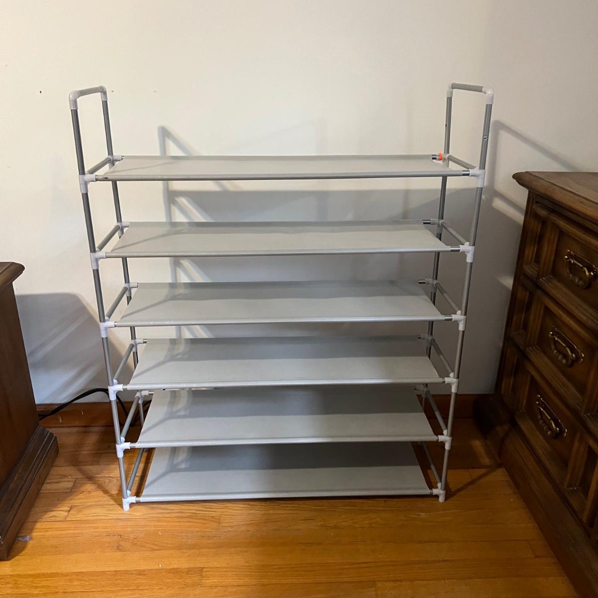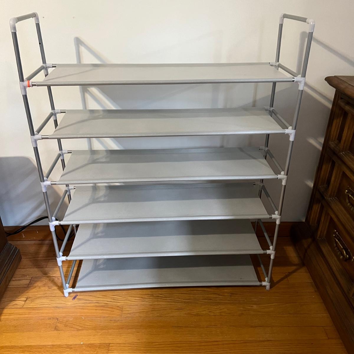 Lightweight aluminum and vinyl shelf. Seems to be ideal for storing shoes in a closet. The shelves themselves are sewn vinyl fabric and the material is hollow tubing made of aluminum. It is very lightweight. Item measures 34” x 11” x 42"H.
