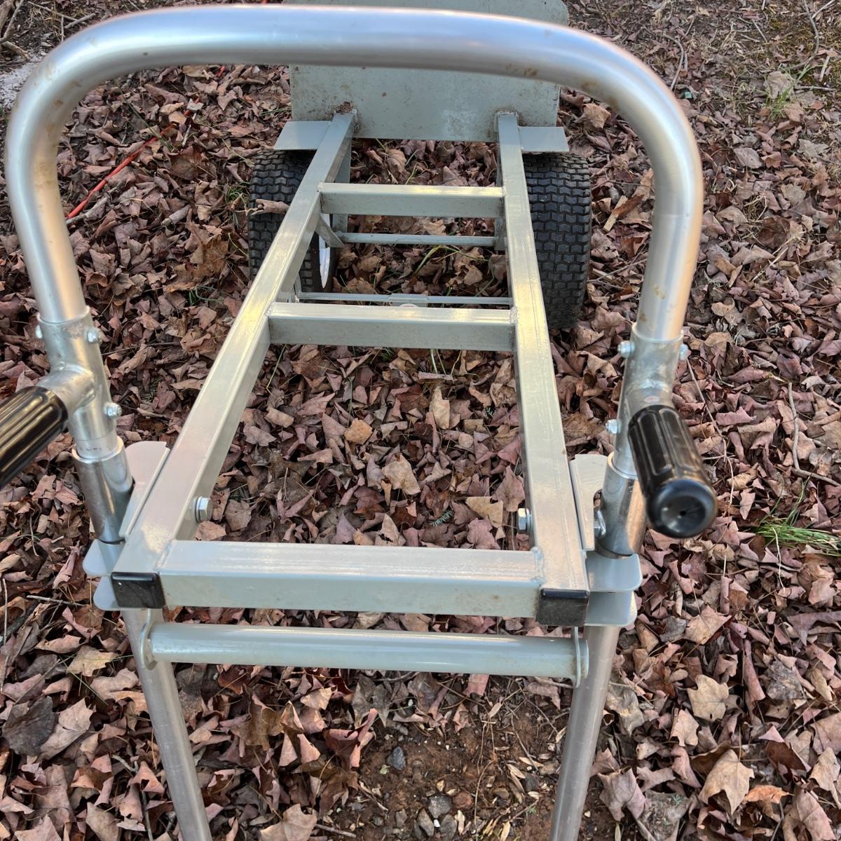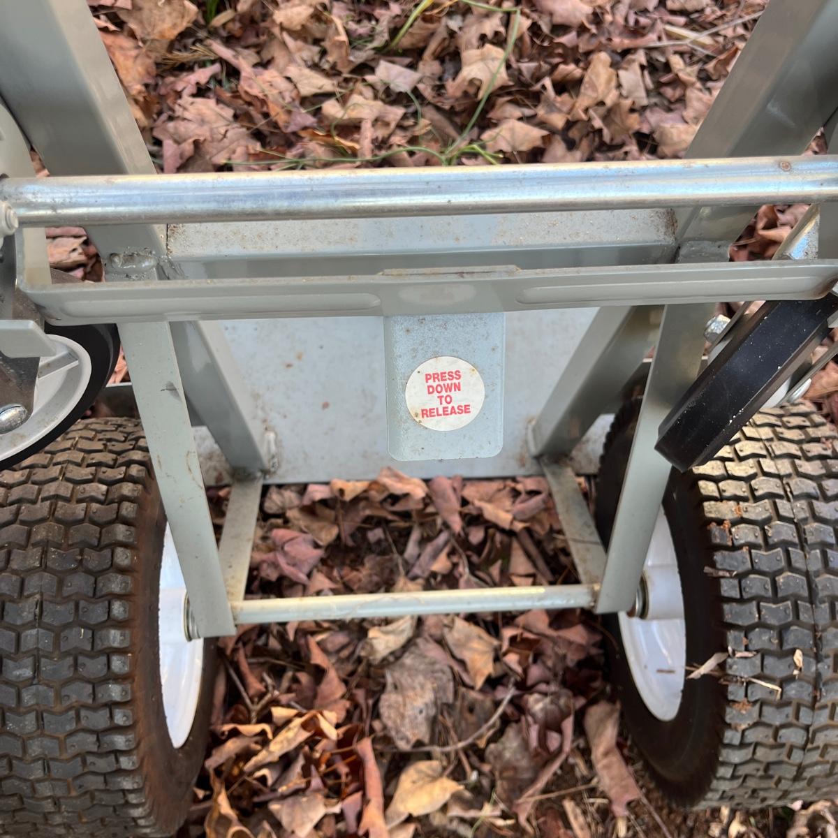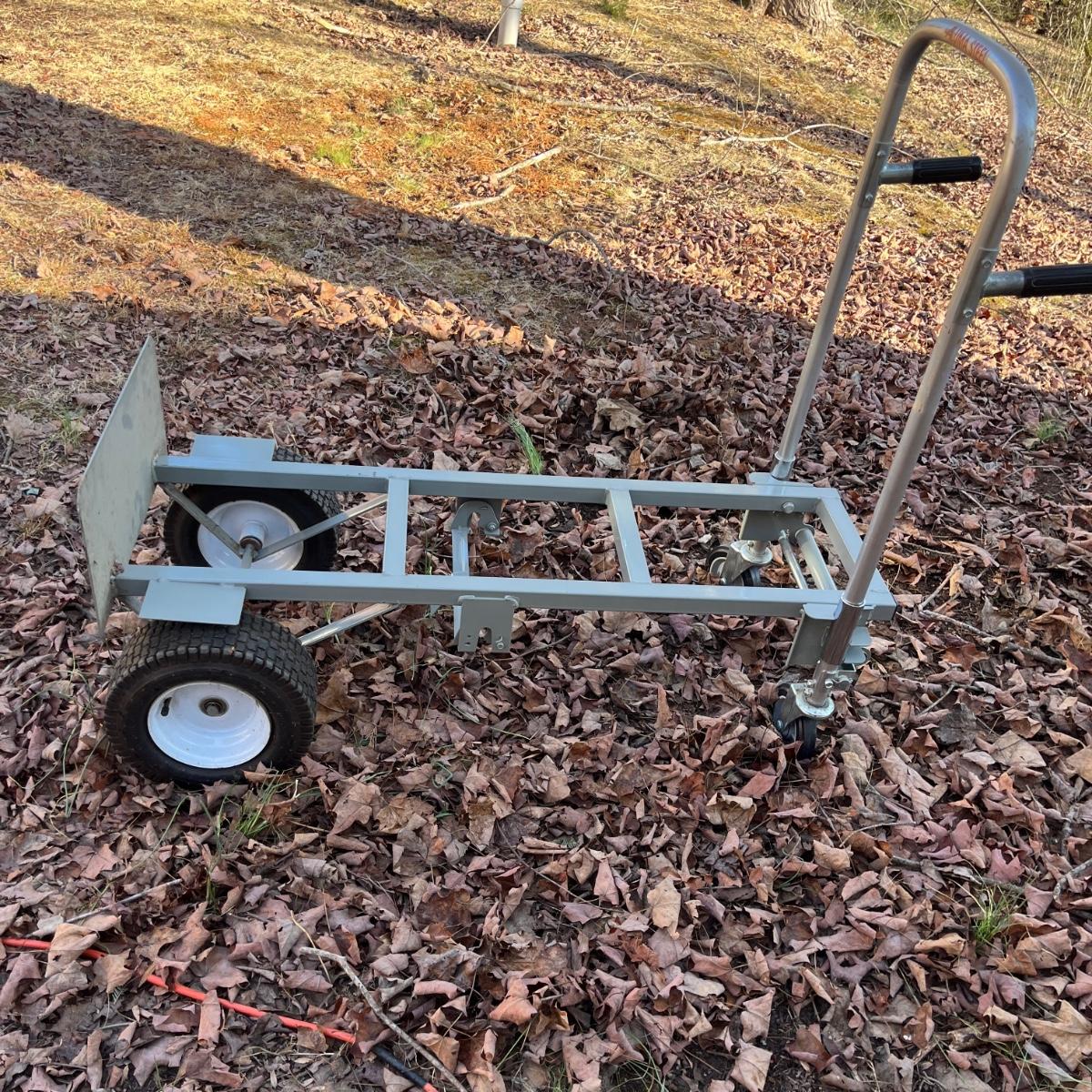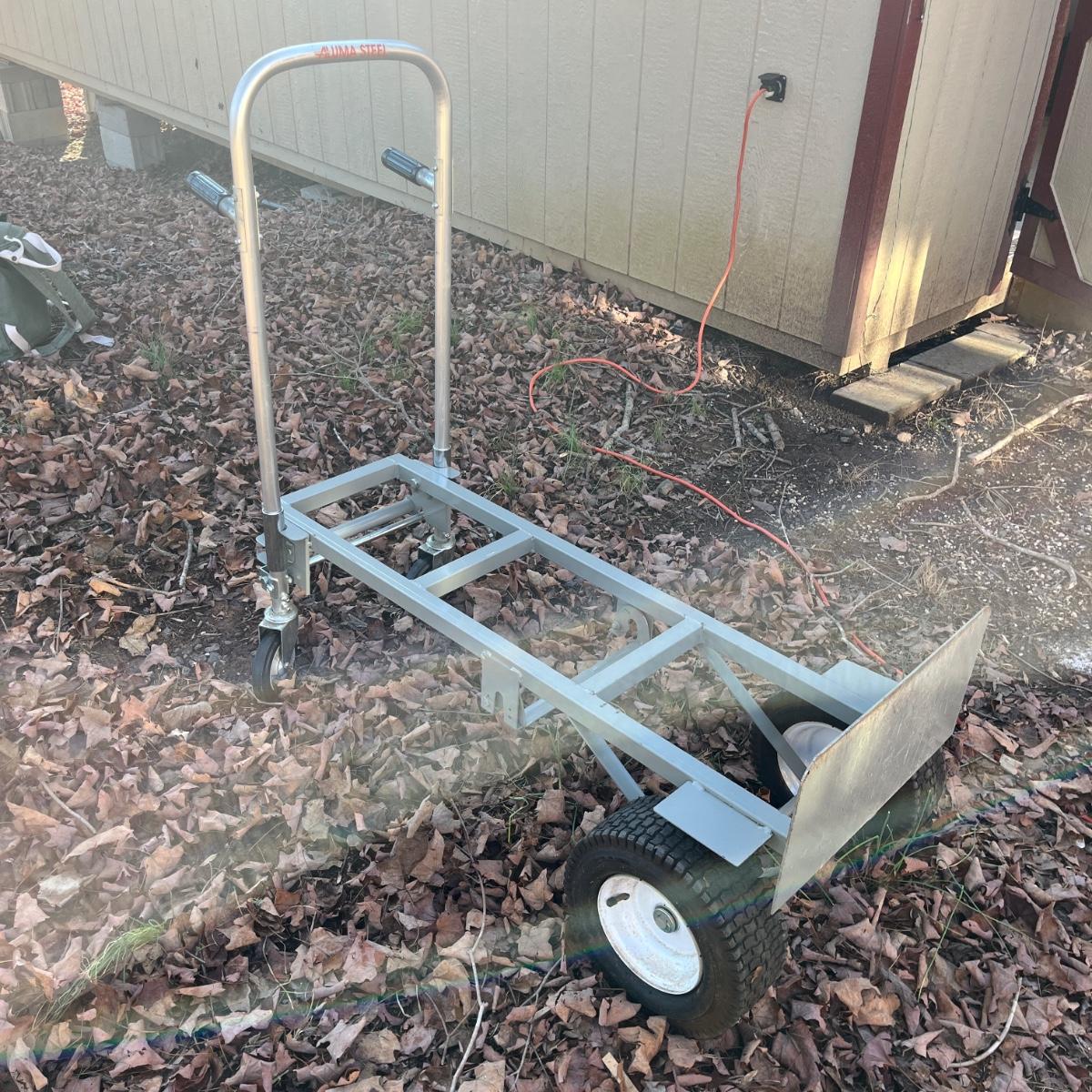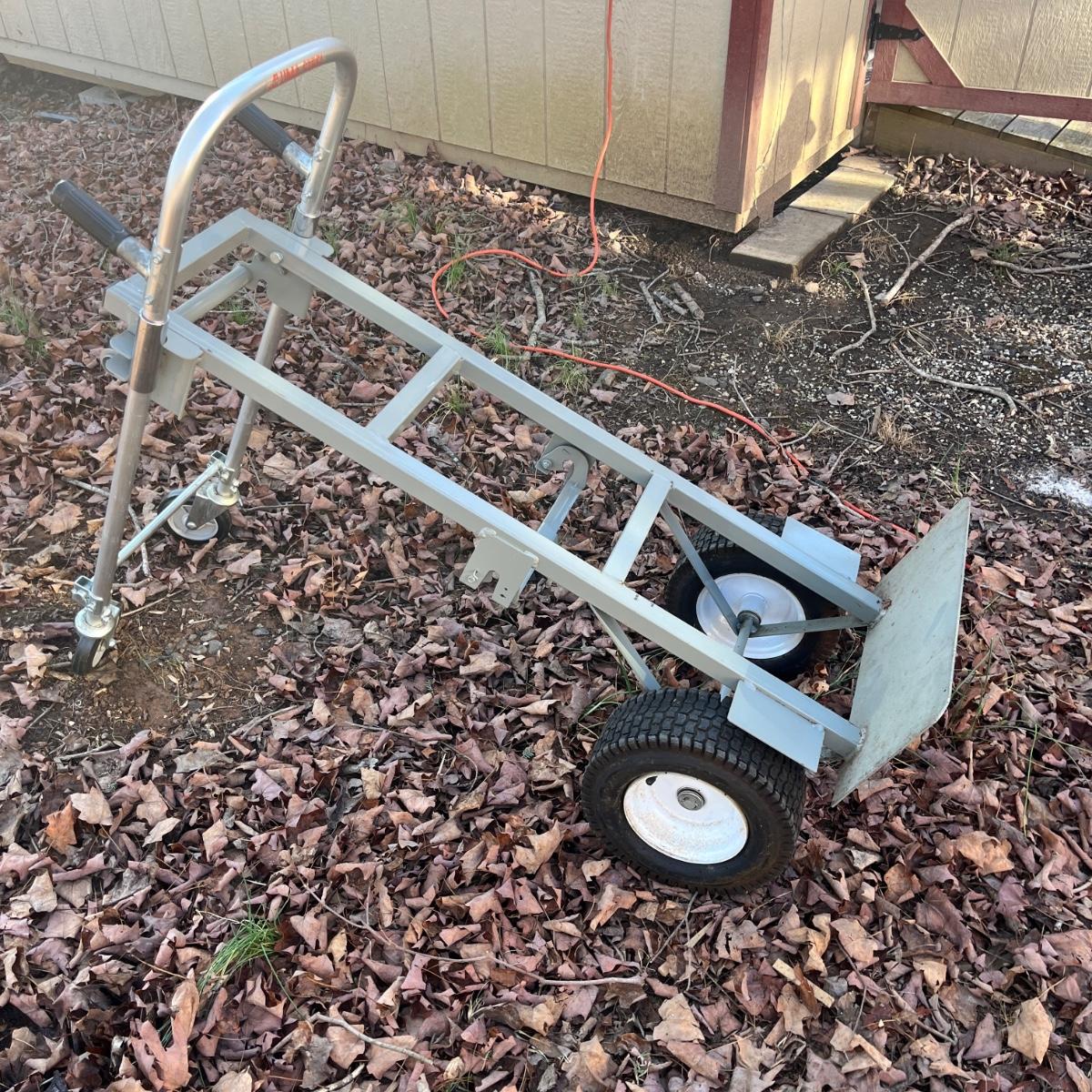 Lot includes a Aluma Steel hand truck that converts to a cart and has pneumatic tires that are holding air. Hand truck measures 21” x 19” x 53”H.