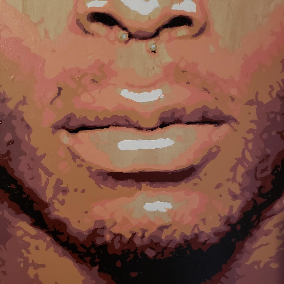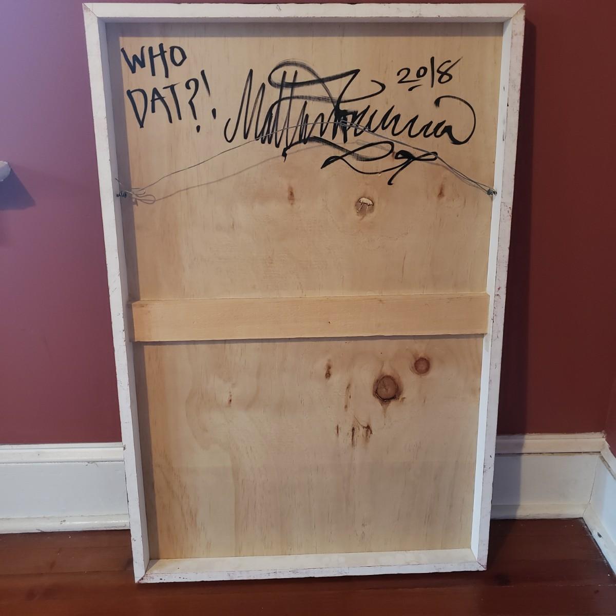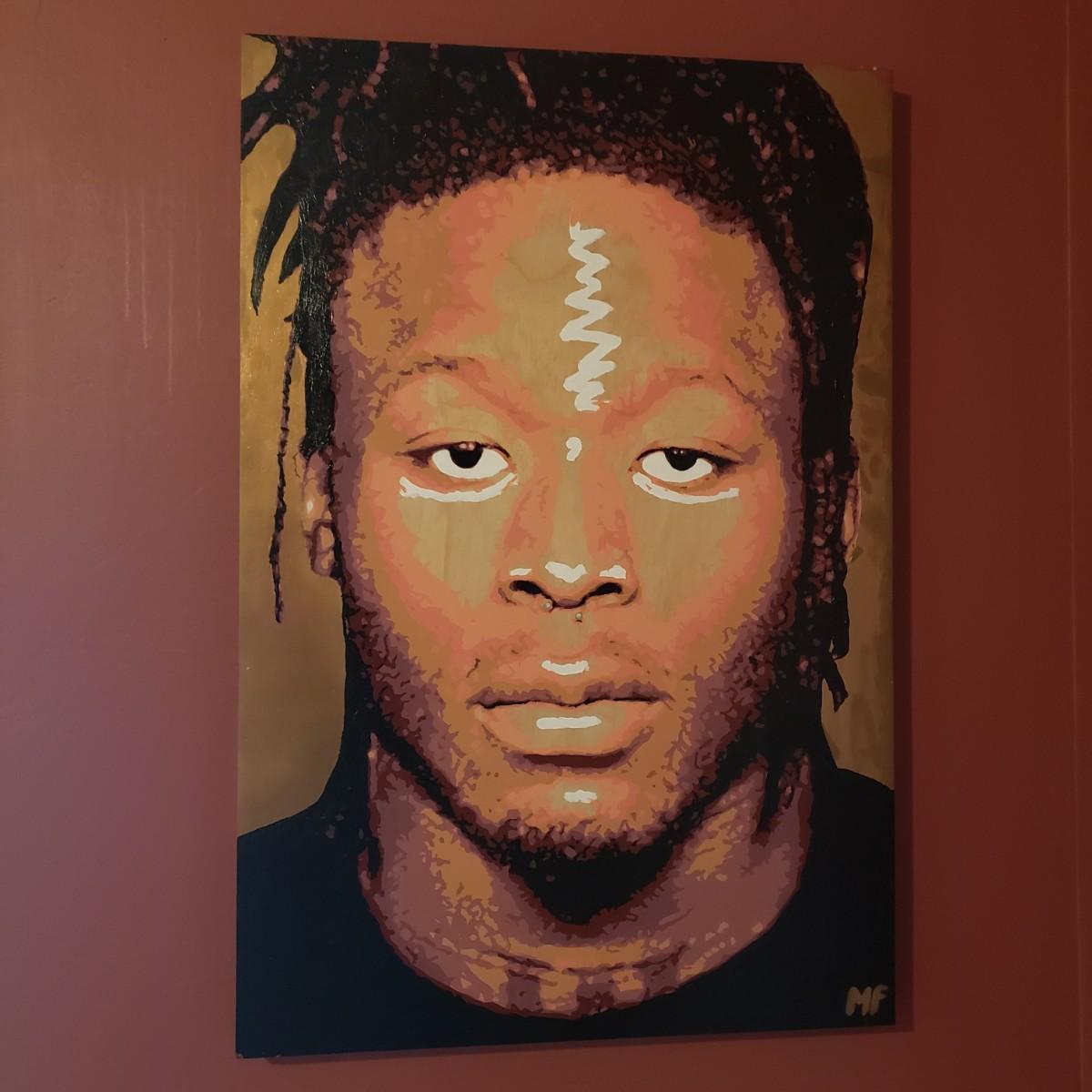 This striking painting of Alvin Kamara has notes on the back by artist Matt Foreman. The painting is on a wood surface and has a textured look from the paint. The painting measures 24" x 2" x 36".