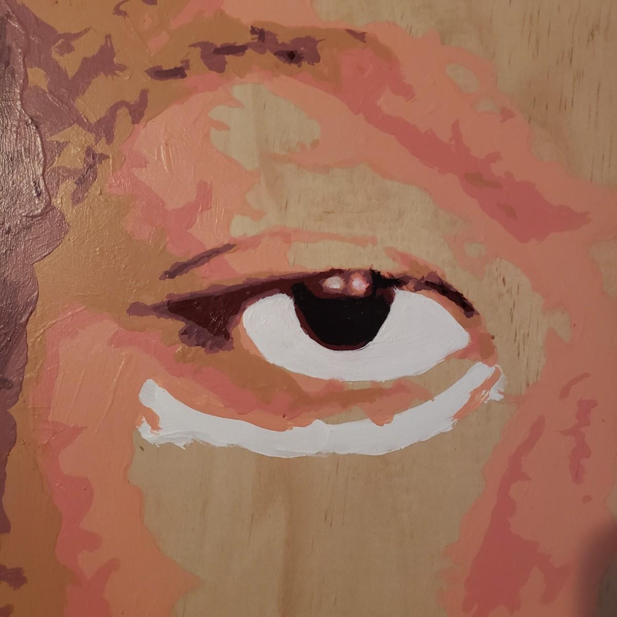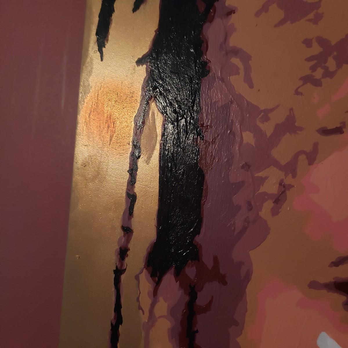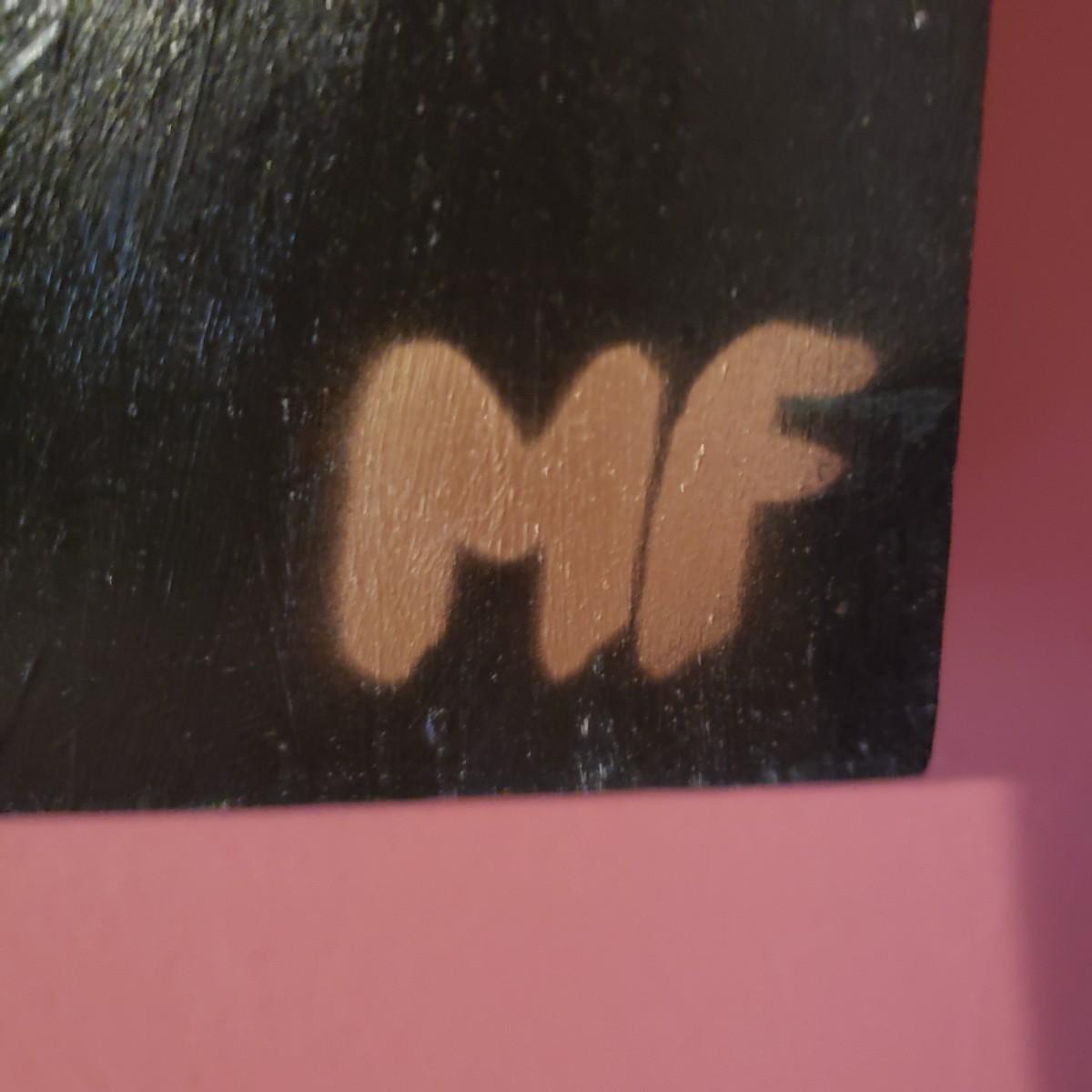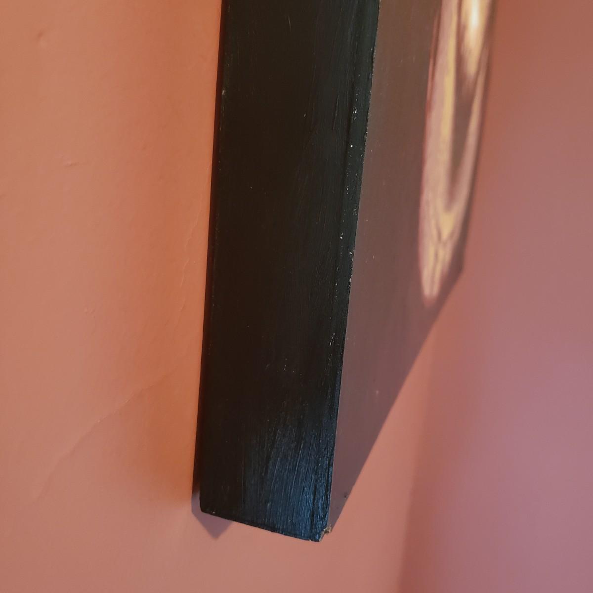 This striking painting of Alvin Kamara has notes on the back by artist Matt Foreman. The painting is on a wood surface and has a textured look from the paint. The painting measures 24" x 2" x 36".